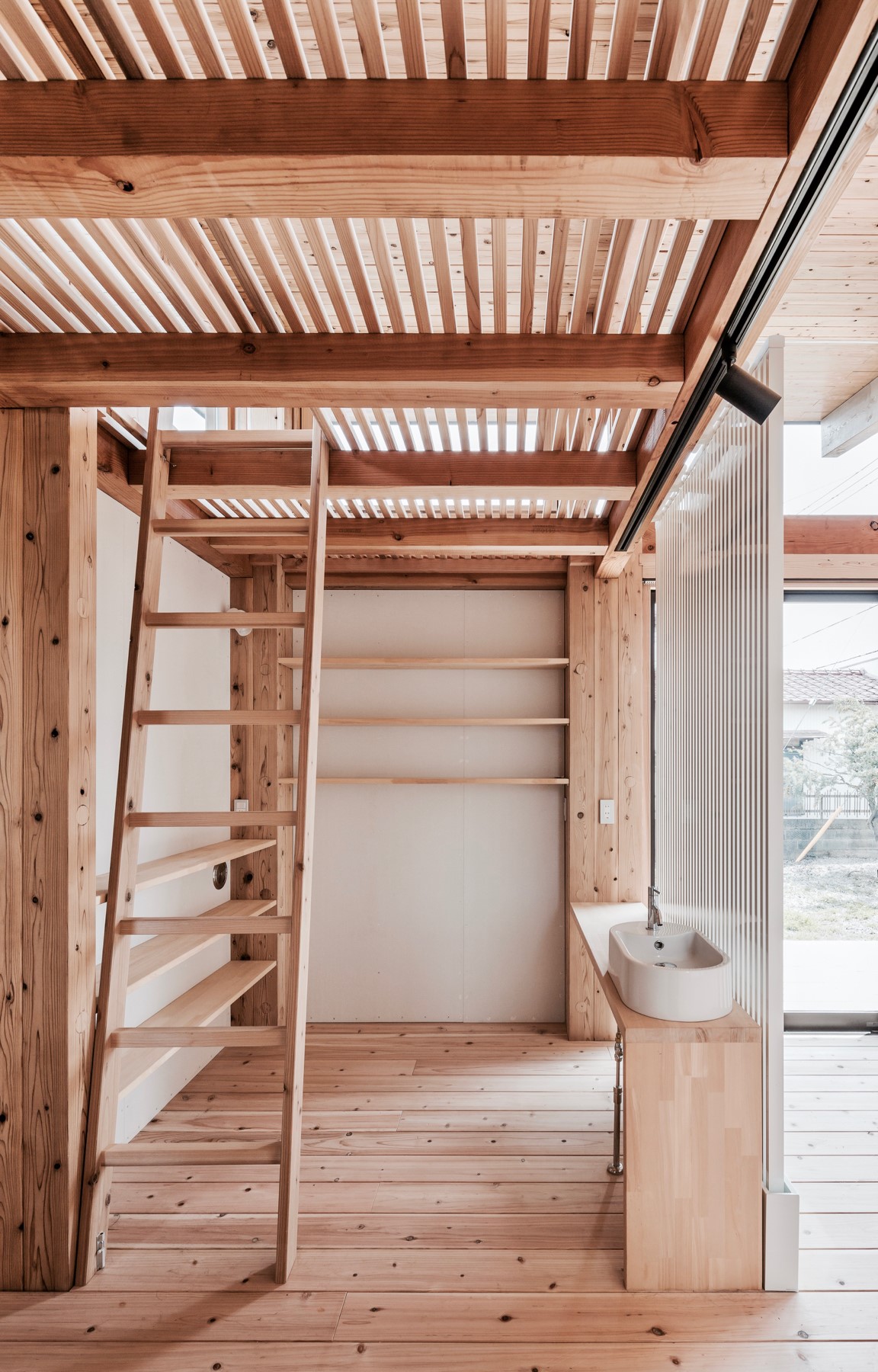 사카이마치의 이 집은 미니멀한 생활을 보내는 한 가족을 위해 증축됐다. 기존의 안채는 보다 사적인 공간으로 바뀌고, 새로이 지어지는 공간에는 부엌, 아이를 위한 학습공간, 로프트가 설치됐다. 두 공간이 이어지는 부분은 거실과 다이닝이 있어 공적인 공간이자 완충공간으로 쓰인다. 암 투병 중인 건축주의 아내와 딸을 위한 선물로 계획된 이 공간은, 아내를 위한 부엌과 아이를 위한 코너에 지붕을 얹어놓기 보다는 지붕을 띄워 두 코어 공간을 감싸는 형태다. 작은 집 5채를 지을 수 있을 만큼의 삼나무로 싸인 이 주택은 목재의 견고함과 마치 작은 숲처럼 거주자를 감싸며 만들어진 여름철과 겨울철에 쾌적한 환경을 준다.
