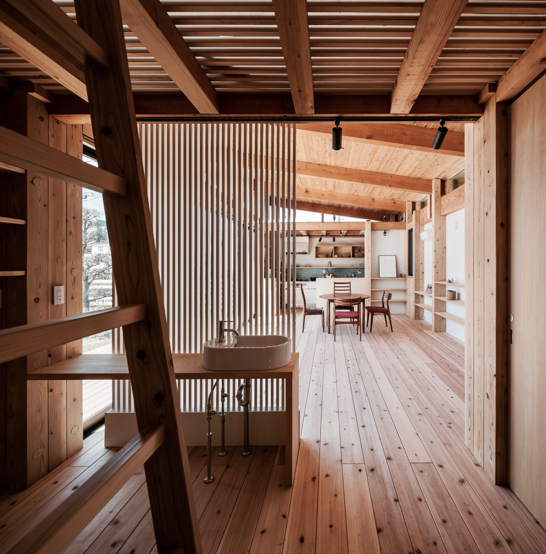 사카이마치의 이 집은 미니멀한 생활을 보내는 한 가족을 위해 증축됐다. 기존의 안채는 보다 사적인 공간으로 바뀌고, 새로이 지어지는 공간에는 부엌, 아이를 위한 학습공간, 로프트가 설치됐다. 두 공간이 이어지는 부분은 거실과 다이닝이 있어 공적인 공간이자 완충공간으로 쓰인다. 암 투병 중인 건축주의 아내와 딸을 위한 선물로 계획된 이 공간은, 아내를 위한 부엌과 아이를 위한 코너에 지붕을 얹어놓기 보다는 지붕을 띄워 두 코어 공간을 감싸는 형태다. 작은 집 5채를 지을 수 있을 만큼의 삼나무로 싸인 이 주택은 목재의 견고함과 마치 작은 숲처럼 거주자를 감싸며 만들어진 여름철과 겨울철에 쾌적한 환경을 준다.