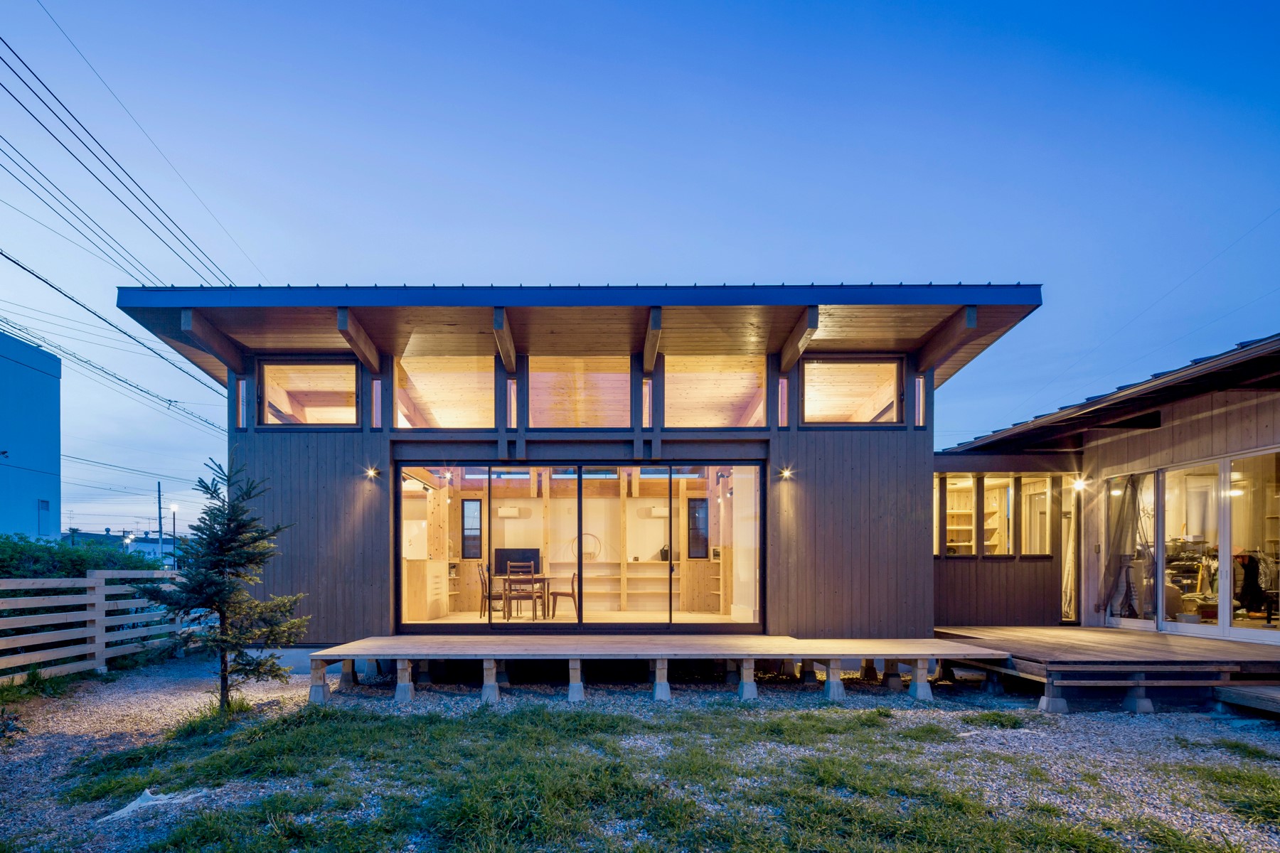It is an extension plan of a family who had a minimal living in one room. Make the existing purlin a private space, A new kitchen, a learning corner for child and a loft will be set up in the extension section, A living / dining room is set up in the center of the extension to make it a public place. Since this plan was a gift for the wife and the daughter from the client fighting for cancer, Instead of putting the roof on the two cores, the kitchen for the wife and the corner for the daughter, I thought the large roof should float to enclose the two cores and the central living and dining area. Since a small house can be made of about 100 timbers, In this plan, we use solid Japanese cedar wood, which is equivalent to about 5 houses. The large eaves prevent the sunlight in the summer from hitting the glass surface, In the winter, warm light penetrates deep into the building, Along with the performance of wood, it creates a comfortable thermal environment.
