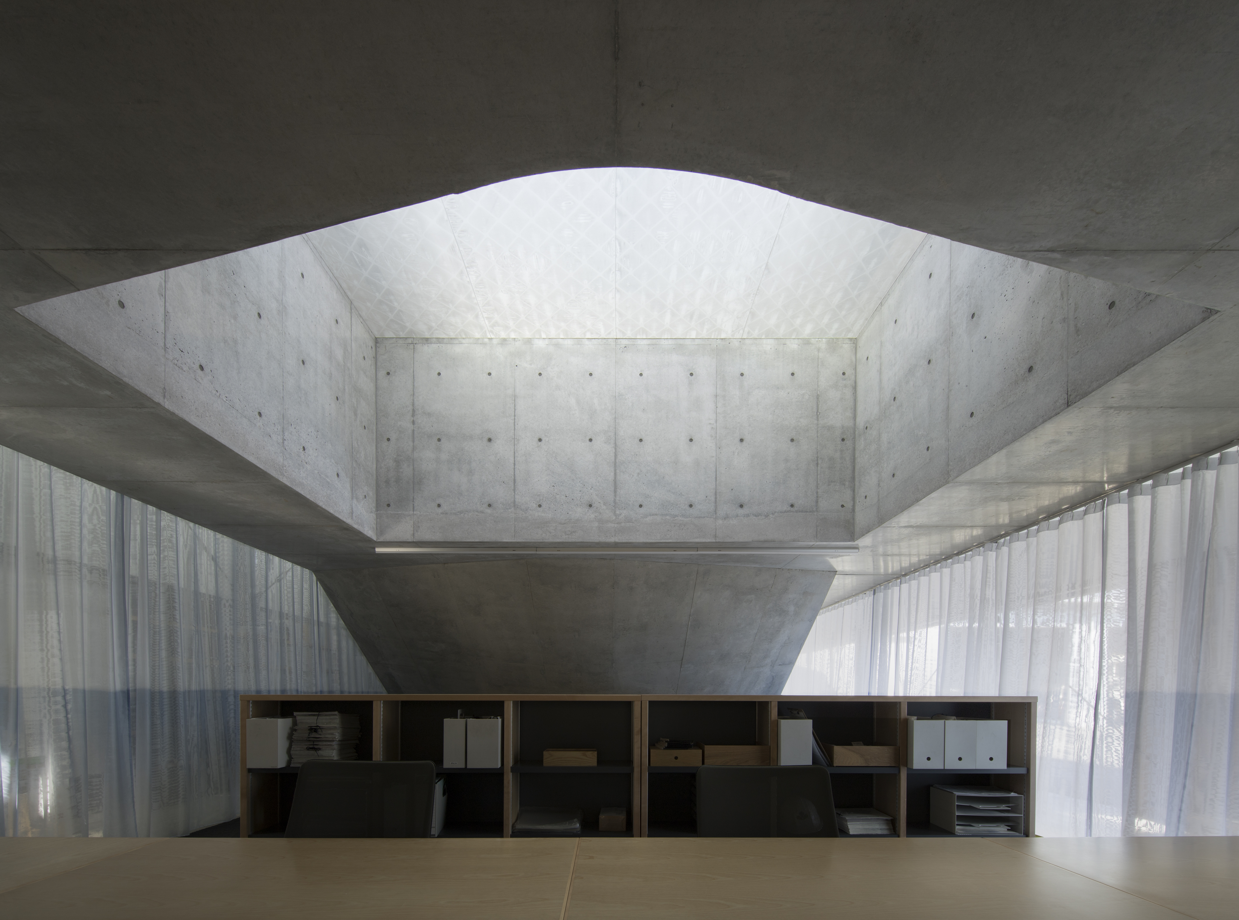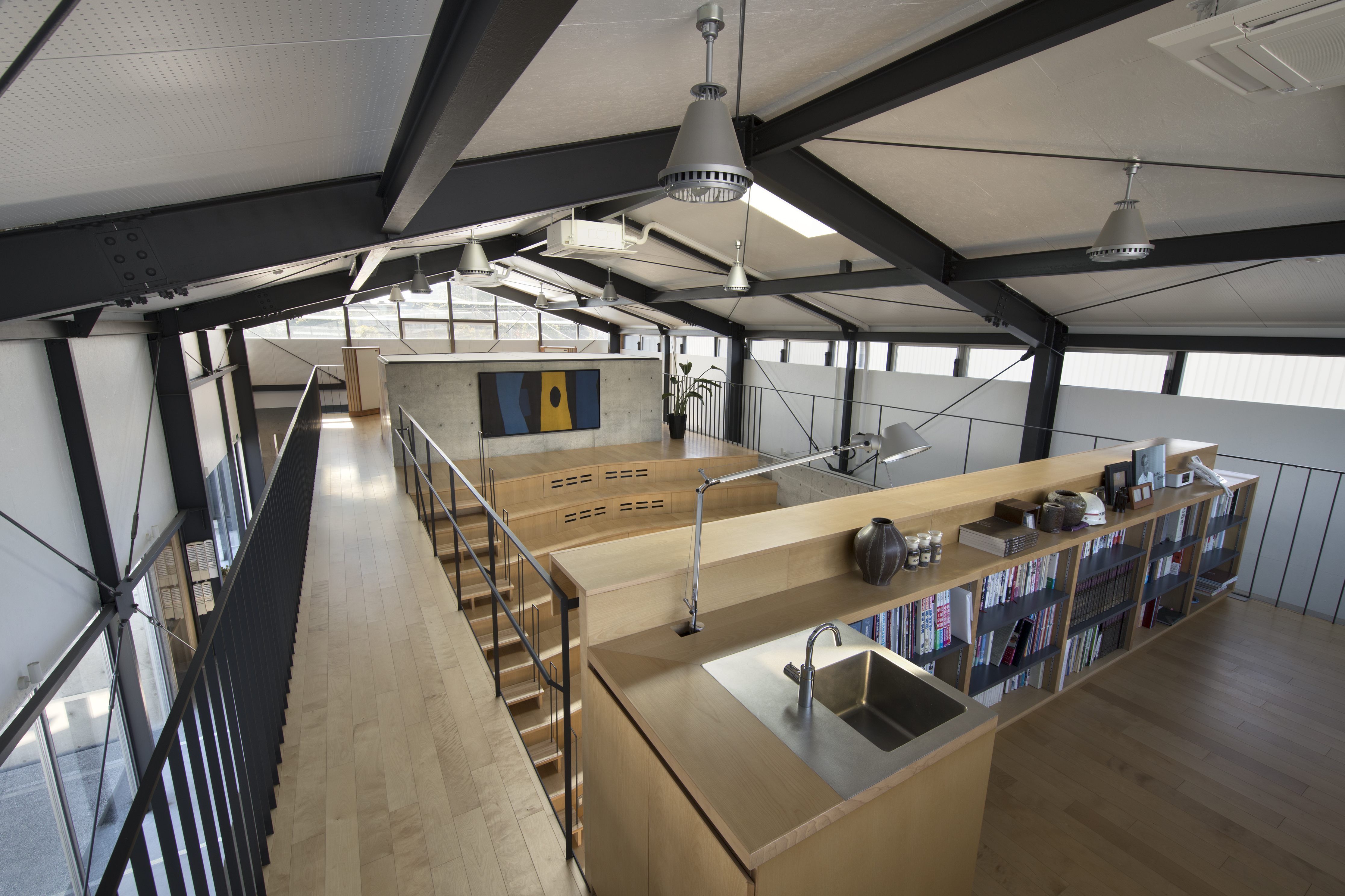 Maruya Corporation is a maintenance and recycle company mainly caring about cement plants. According to the expansion of their business, they decided to make their new head office by renovating the existing steel warehouse. Soon after the completion they decided to marge their group companies and expand the office. The issue was how to use the large interior volume of the warehouse for the office function. We categorized the required functions into three different spaces: working, meeting, and storing. Into the existing steel frame we inserted a small concrete box, which inside is used for working space with constant air conditioning, and which surroundings are for others with occasional air conditioning. These two spaces are gently partitioned by fabrics. As an extension we added a simple concrete box to the steel warehouse volume. In order to utilize the natural light, we introduce skylights with reflectors. The connection part between Phase I and II is used for a communication area with a cafe function.