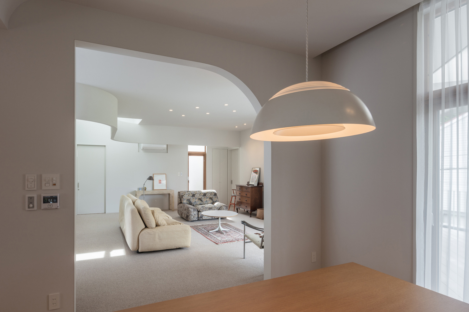 This house is located near a historical park in the city of Sapporo. It is one of the regional characteristics of Sapporo that people often move by car rather than public transport. Yet, the road in front of the house is one-way only, so entrance to the garage and turning direction of the client’s car would be limited. To facilitate car movement, we adopted the shape of the house to the radius which car turning movements would need. In Sapporo, where annual snowfall reaches about 6m, eaves are useful for areas such as those near the entrance as well as those near car garage. This way, we created a wide balcony, which also creates privacy for the second floor from passers-by. The second floor, which is the main area in the house, is visually connected with the park, invites the greenery of the park inside the house and creates a quality of a private garden.