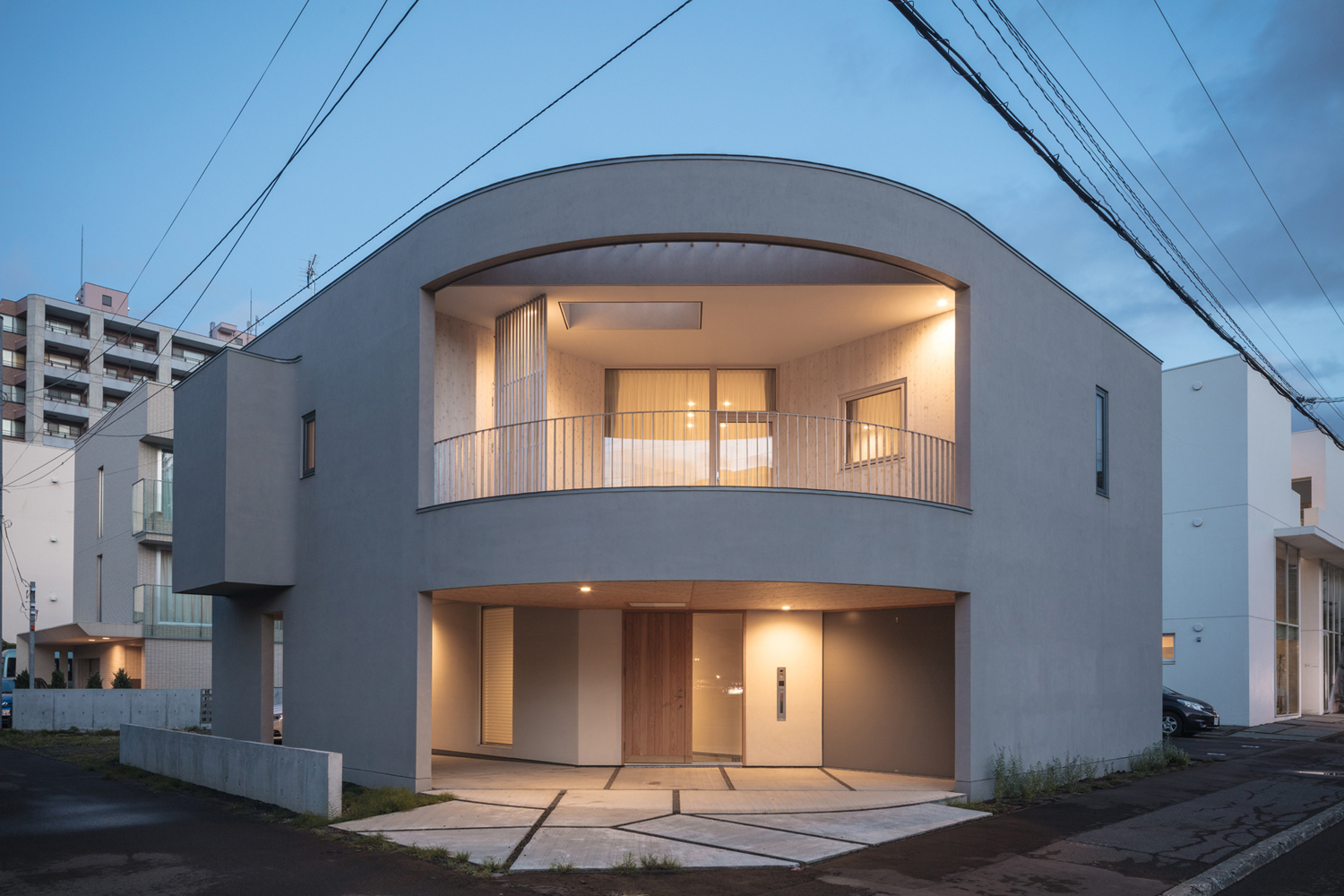 이 집은 삿포로의 역사 깊은 공원 근처에 지어졌다. 대중교통보다는 자동차를 이용하는 게 삿포로 지방의 특징 중 하나다. 주택의 전면도로가 일방통행인 여건에서, 차고의 진입부와 차고에서 나오는 차의 방향이 한정되는 것이 당면한 문제였다. 이러한 상황에서 차의 운행을 원활하게 하기 위해, 건축가는 자동차가 코너를 도는 반지름에 맞춰 주택의 모양을 둥글게 만들었다. 매년 6m가량의 눈이 내리는 삿포로에서 처마는 사람을 위한 출입구와, 차량을 위한 출입구 양면에 유용한 장치다. 처마를 이용해 만든 넓은 발코니는 행인들로부터 2층의 사생활을 보호하는 역할도 한다. 거주자는 2층에서 공원과 집 안의 녹지를 시각적으로 이어 품격 있는 개인정원을 갖게 된다.