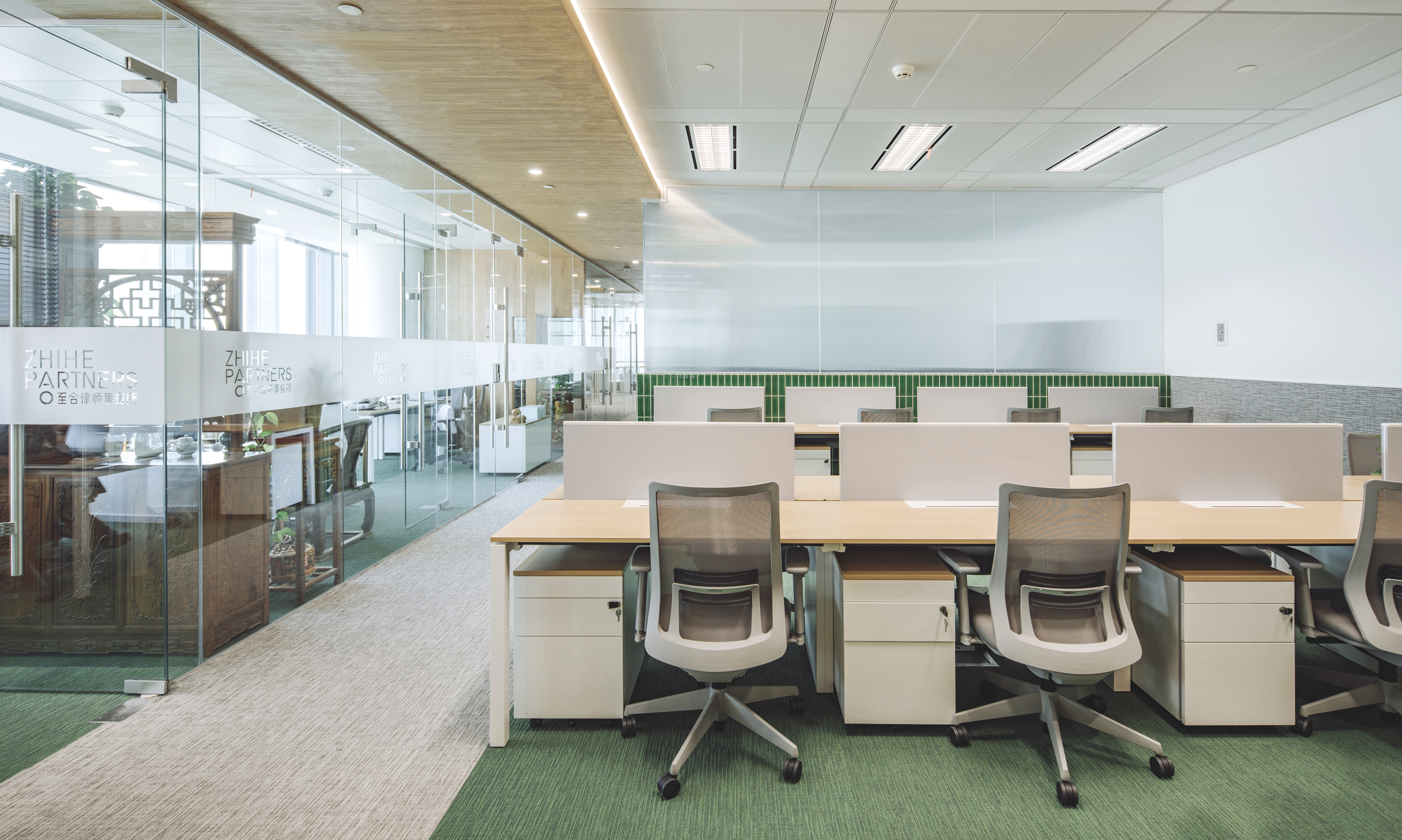 This lawyer's office is a large platform, and has a structure in which each lawyer has an independent office. The challenge was how to relate the many small offices with the entire office environment within this structure. The minimum size of each partner's independent office was calculated based on the principle of economical use of space. After that, the categorized offices were sporadically connected to open areas. Through this, the spatial tension due to the large volume was reduced and separation between members was avoided. Following the three keywords of ‘enjoyability, cooperation, and justice’, independent offices that are separate yet connected and common areas were created to create a transparent, fluid, and open space