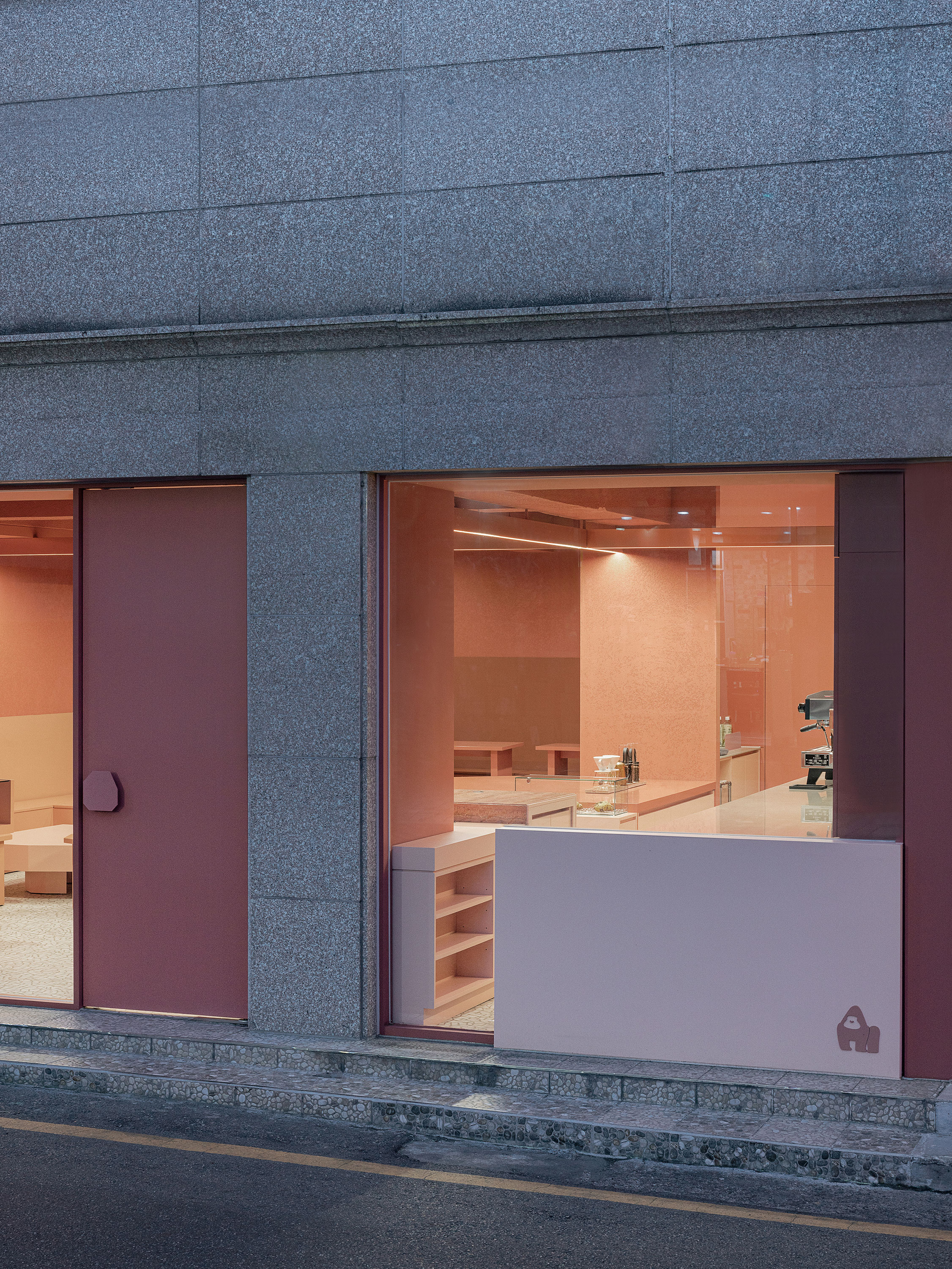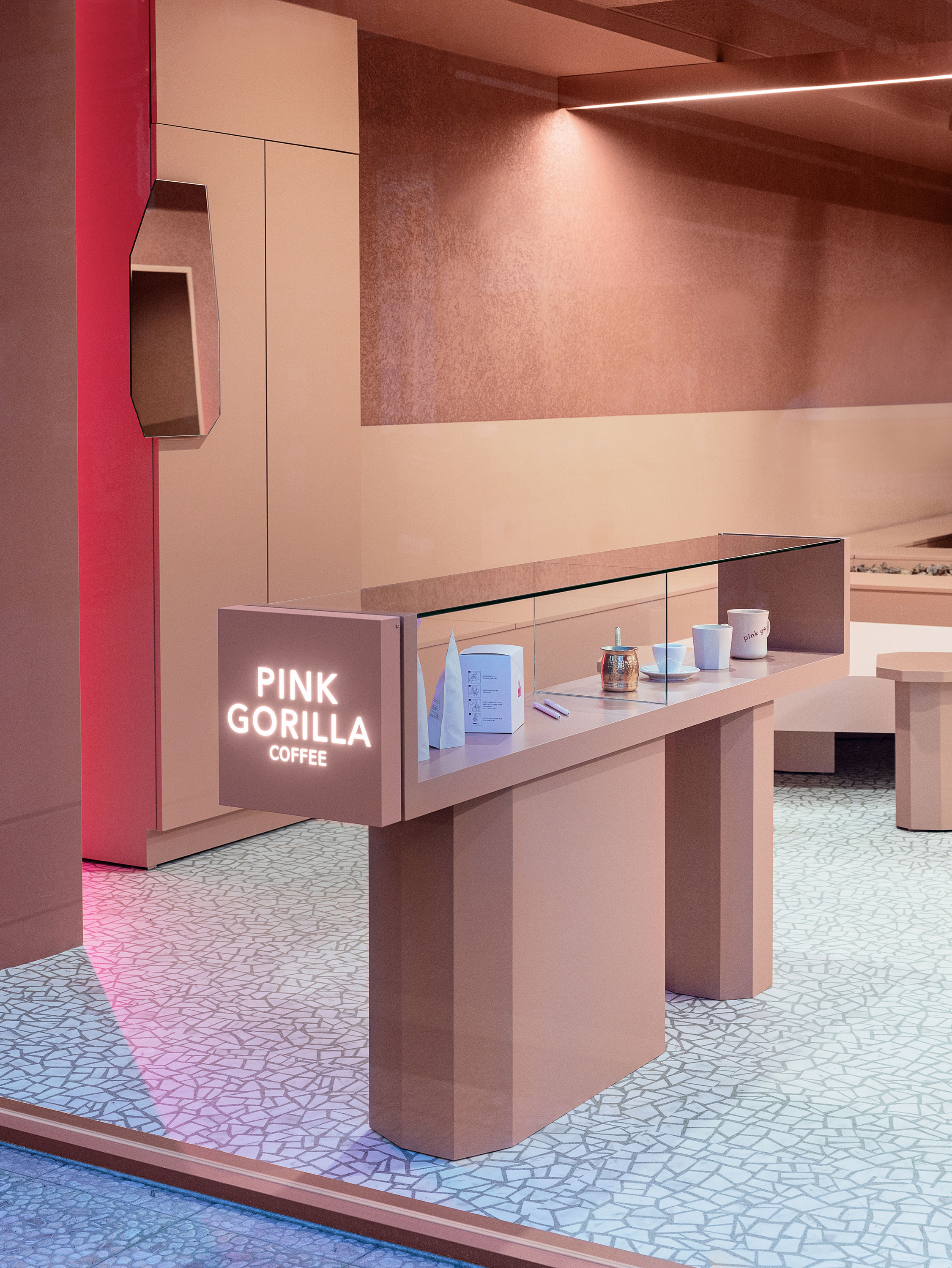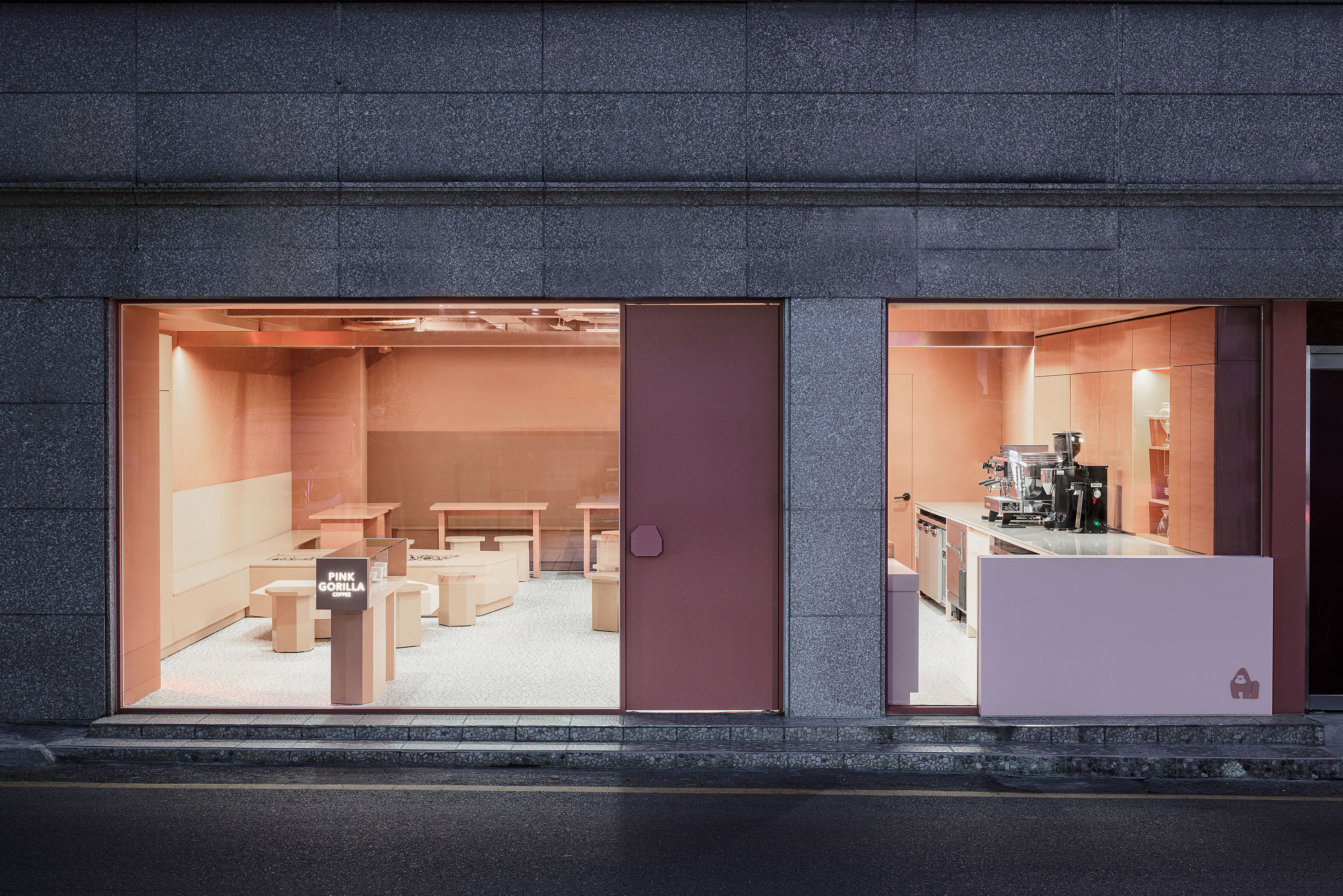 As if a gorilla that looks ferocious and wild is actually a vegetarian animal The space concept was designed to highlight the gorilla's reversal charm. The sensuous and hard rock-like appearance is expressed in the form, and the gentle personality is expressed in pink. Tables and chairs were made in the form of a voluminous and crude polygonal shape. The flooring material also has the shape of a polygon, which was also selected to emphasize the gorilla's rugged shape. As for the color of the space, we tried to use as many different finishing materials as possible within the same pink tone. Pink red copper plate, pink travertine marble, and 4 types of pink tone paint were used to make the space appear deeper by using dark colors as you go inside and go up from the bottom. Using colored LEDs on the back of the leaning furniture and mirror, creating a pink shadow gave another reversal of fun. The landscaping space that evokes the central space uses external stones to bring a sense of locality like Africa where gorillas live. The exterior space is neatly organized, but rather than putting it through glass, the display furniture inside is extended to the outside, making it a signboard that stimulates curiosity.