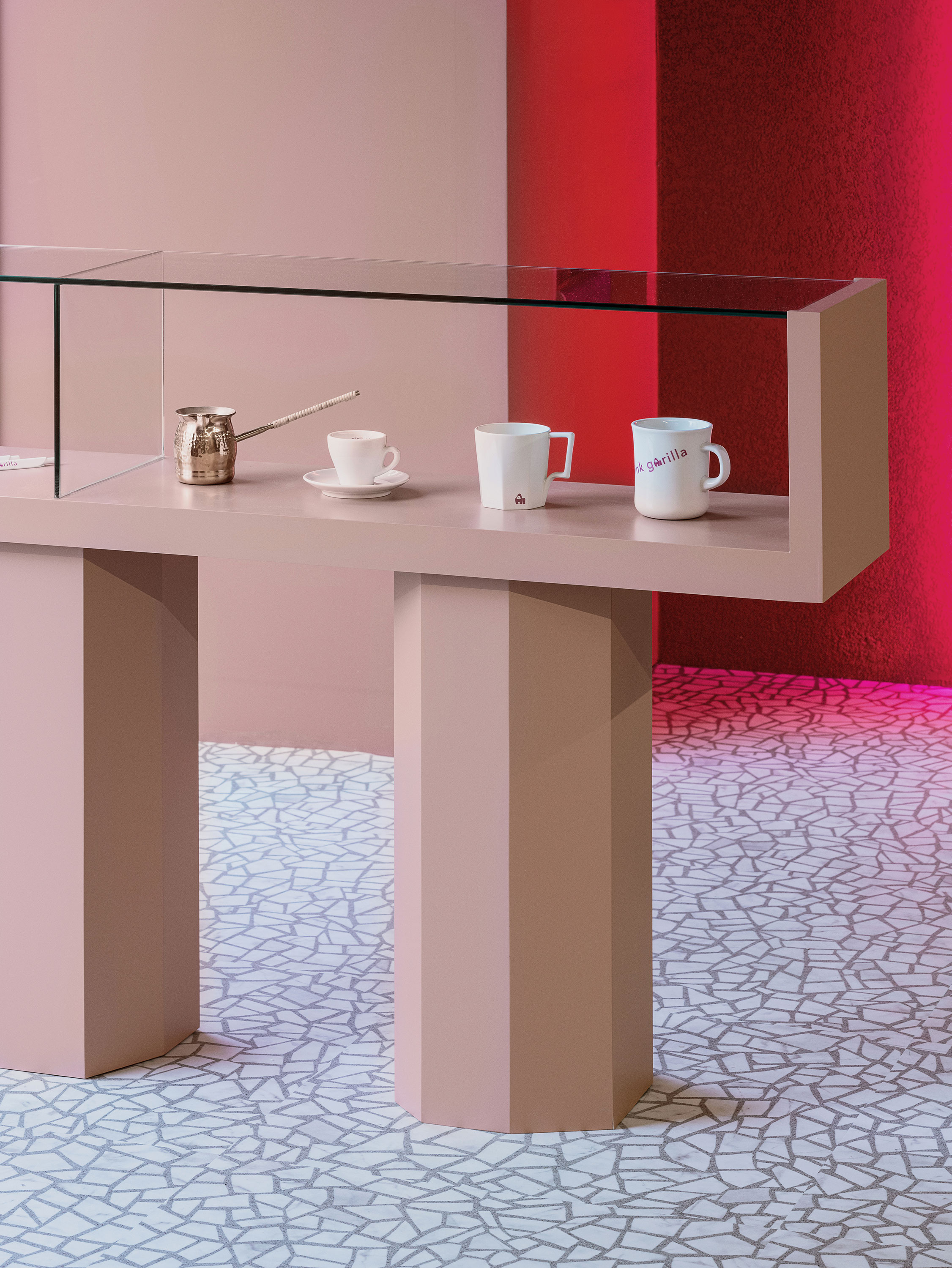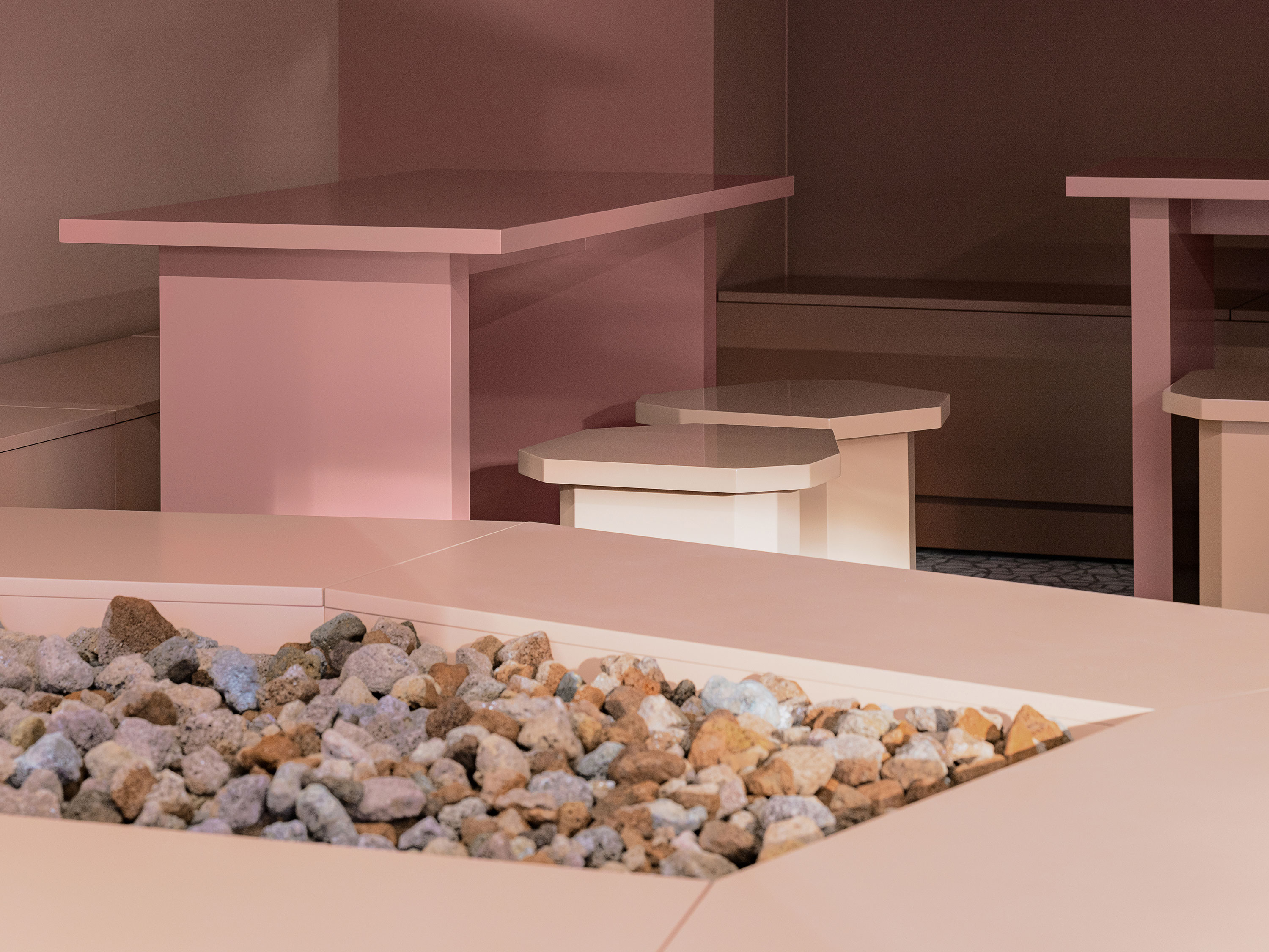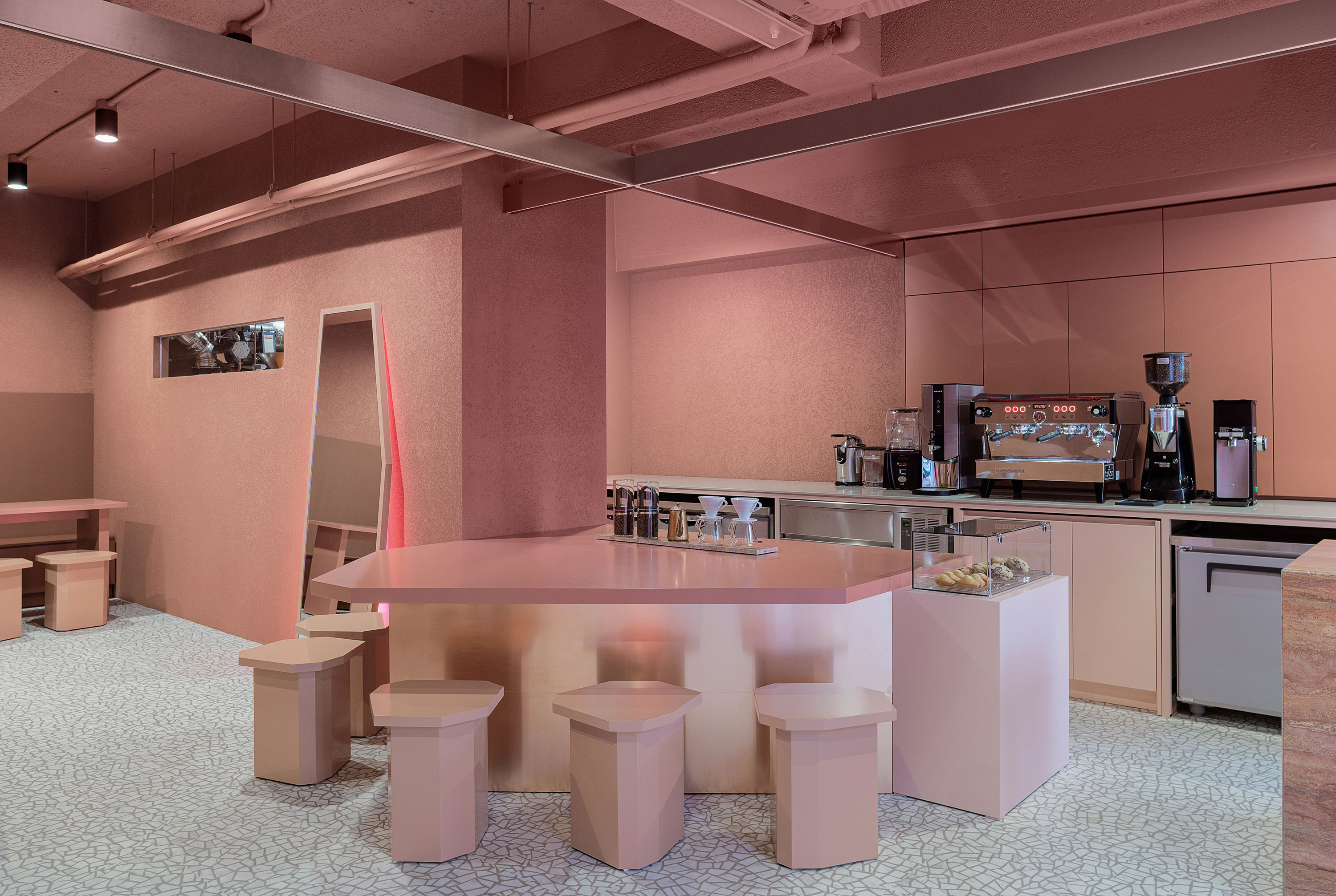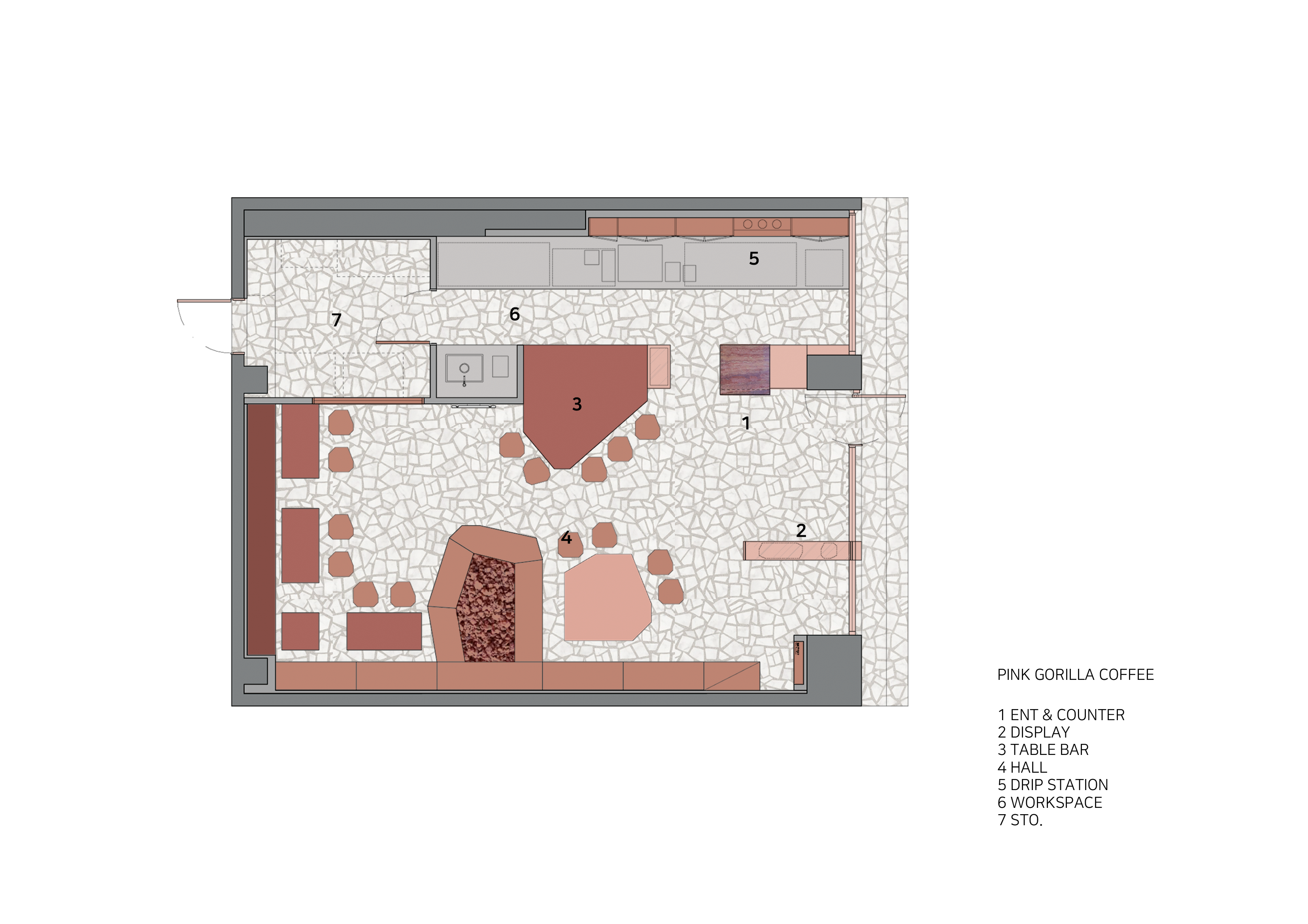 As if a gorilla that looks ferocious and wild is actually a vegetarian animal The space concept was designed to highlight the gorilla's reversal charm. The sensuous and hard rock-like appearance is expressed in the form, and the gentle personality is expressed in pink. Tables and chairs were made in the form of a voluminous and crude polygonal shape. The flooring material also has the shape of a polygon, which was also selected to emphasize the gorilla's rugged shape. As for the color of the space, we tried to use as many different finishing materials as possible within the same pink tone. Pink red copper plate, pink travertine marble, and 4 types of pink tone paint were used to make the space appear deeper by using dark colors as you go inside and go up from the bottom. Using colored LEDs on the back of the leaning furniture and mirror, creating a pink shadow gave another reversal of fun. The landscaping space that evokes the central space uses external stones to bring a sense of locality like Africa where gorillas live. The exterior space is neatly organized, but rather than putting it through glass, the display furniture inside is extended to the outside, making it a signboard that stimulates curiosity.