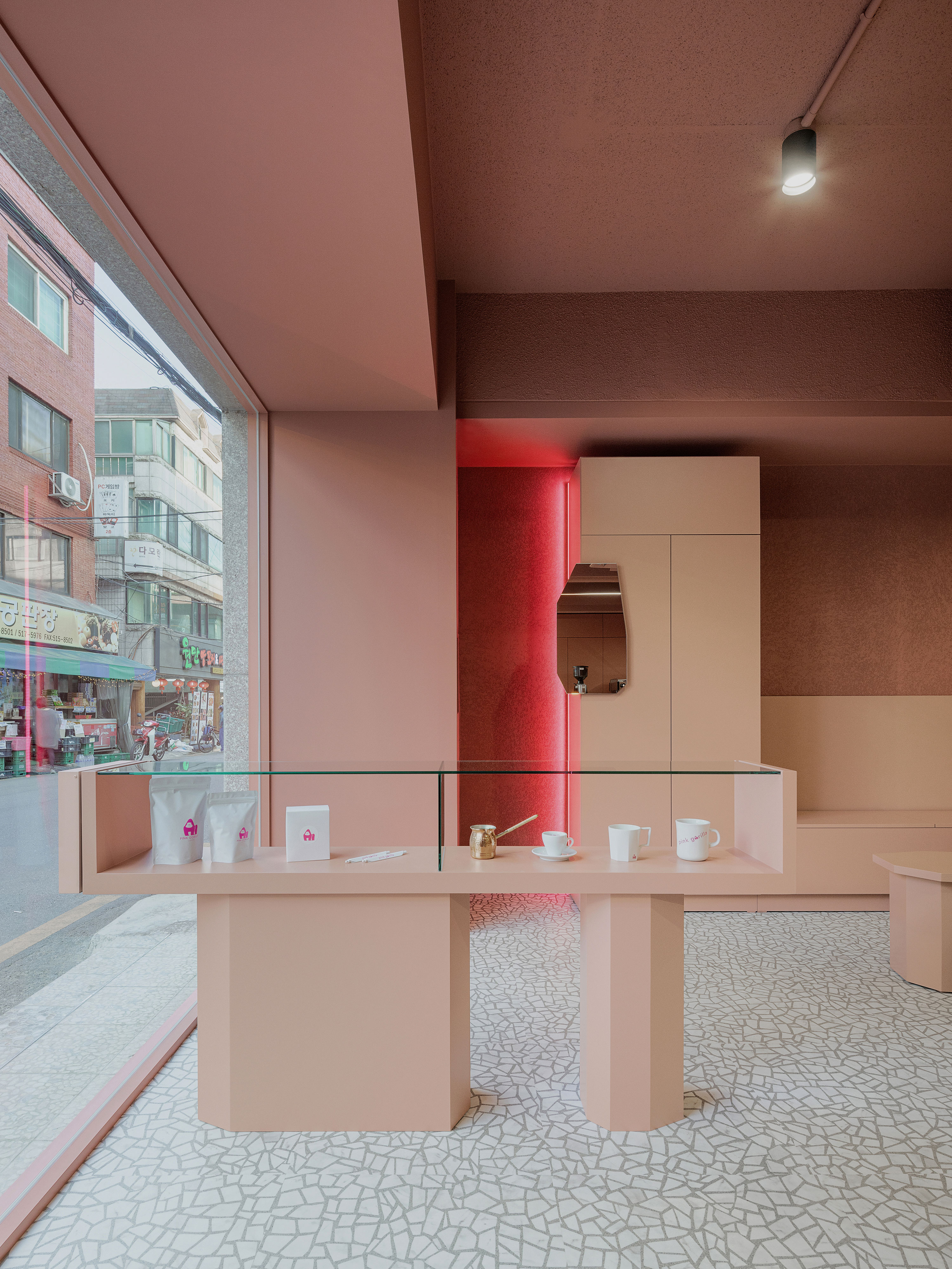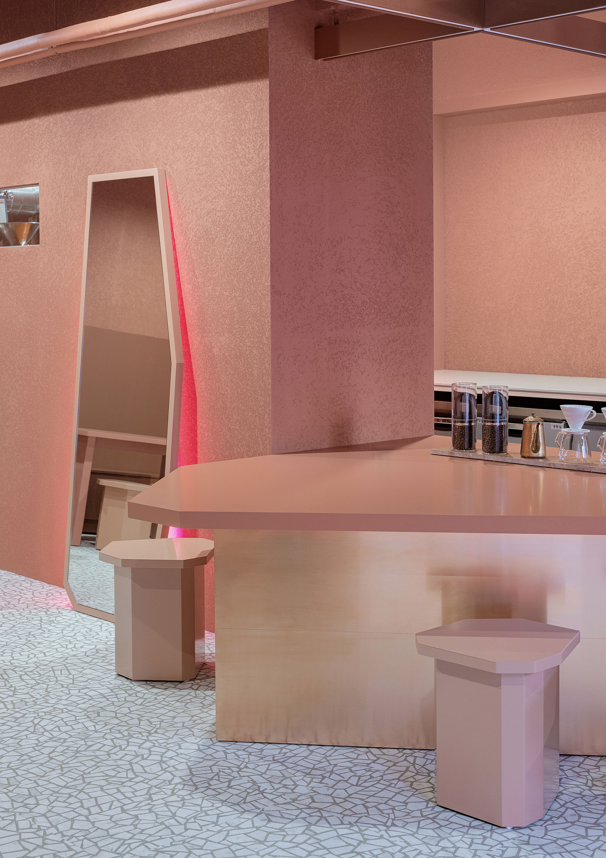 As if a gorilla that looks ferocious and wild is actually a vegetarian animal The space concept was designed to highlight the gorilla's reversal charm. The sensuous and hard rock-like appearance is expressed in the form, and the gentle personality is expressed in pink. Tables and chairs were made in the form of a voluminous and crude polygonal shape. The flooring material also has the shape of a polygon, which was also selected to emphasize the gorilla's rugged shape. As for the color of the space, we tried to use as many different finishing materials as possible within the same pink tone. Pink red copper plate, pink travertine marble, and 4 types of pink tone paint were used to make the space appear deeper by using dark colors as you go inside and go up from the bottom. Using colored LEDs on the back of the leaning furniture and mirror, creating a pink shadow gave another reversal of fun. The landscaping space that evokes the central space uses external stones to bring a sense of locality like Africa where gorillas live. The exterior space is neatly organized, but rather than putting it through glass, the display furniture inside is extended to the outside, making it a signboard that stimulates curiosity.