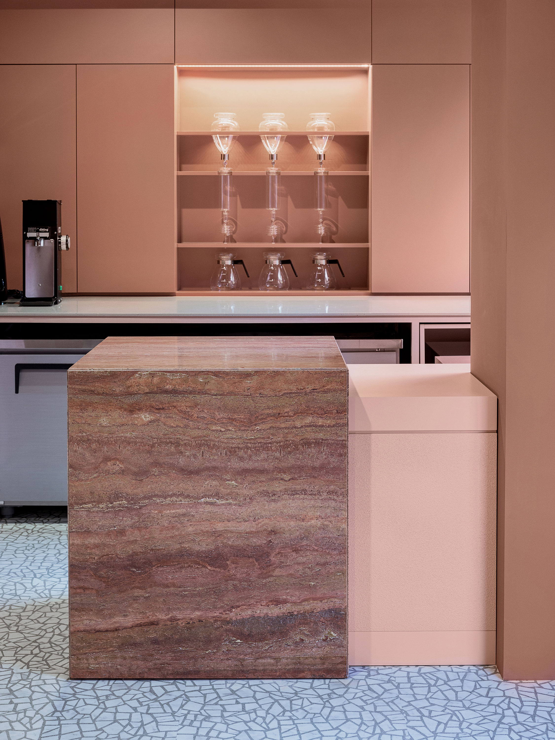공간의 색감은 같은 핑크톤안에서 최대한 다양한 마감재를 사용하고자 했다.