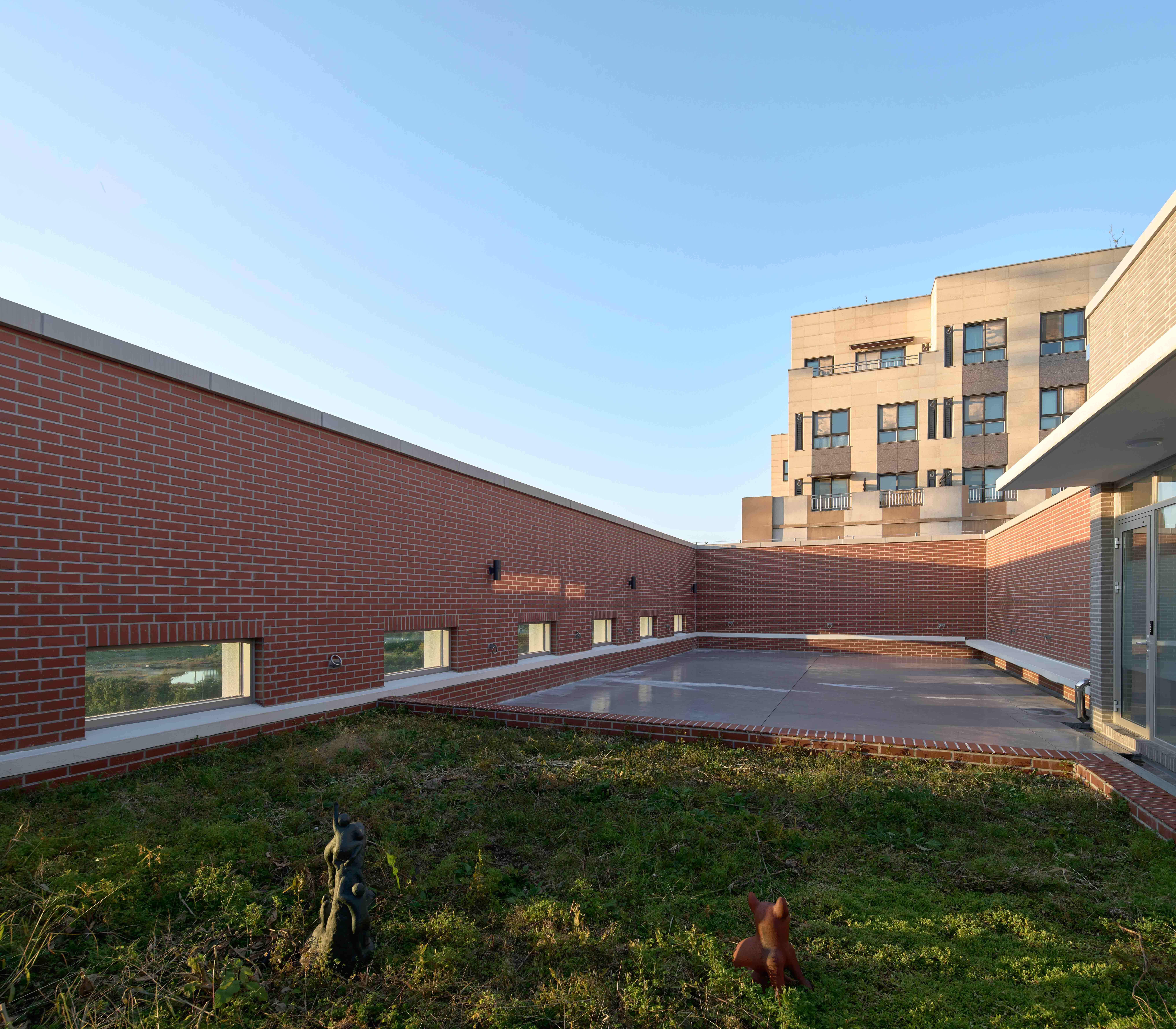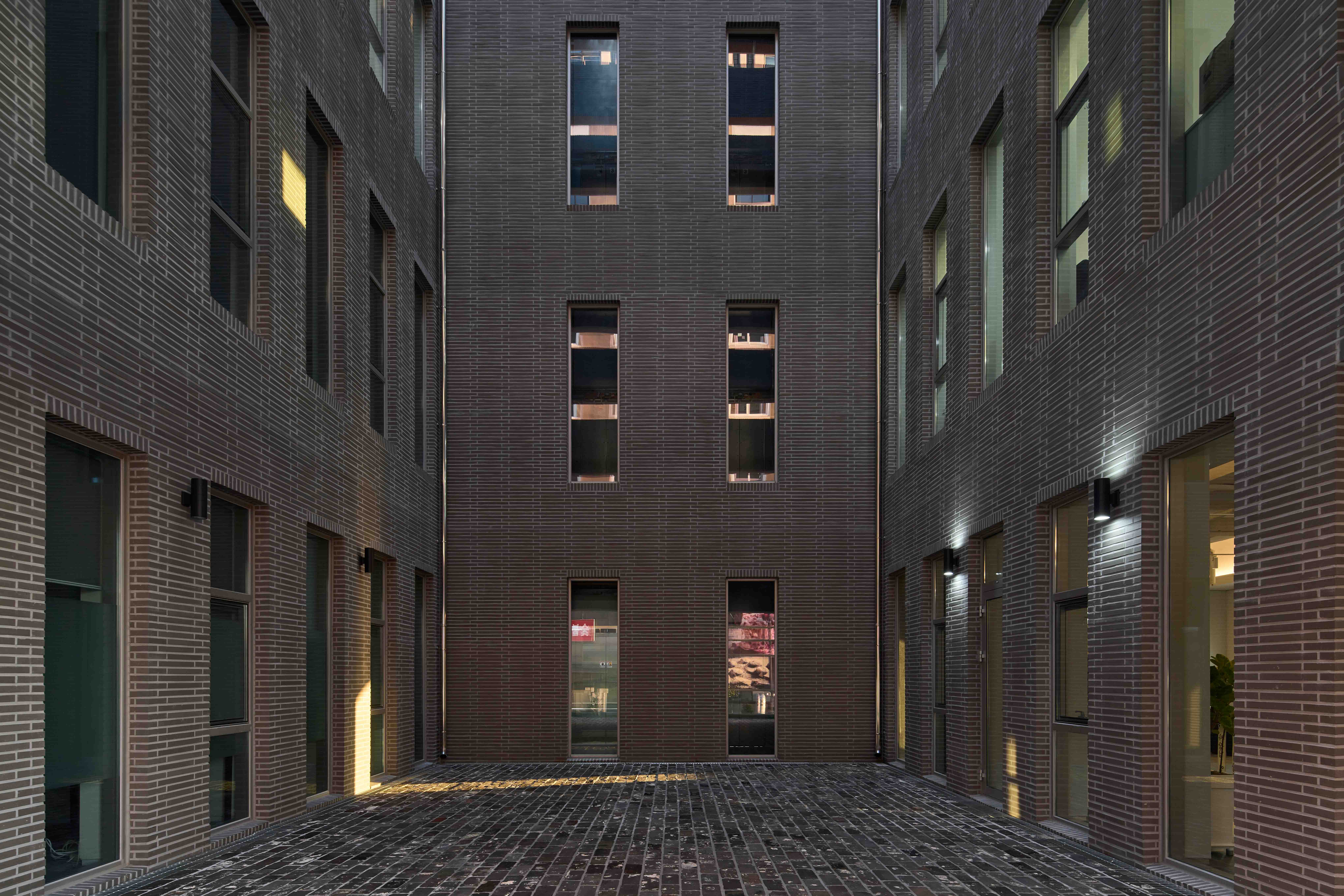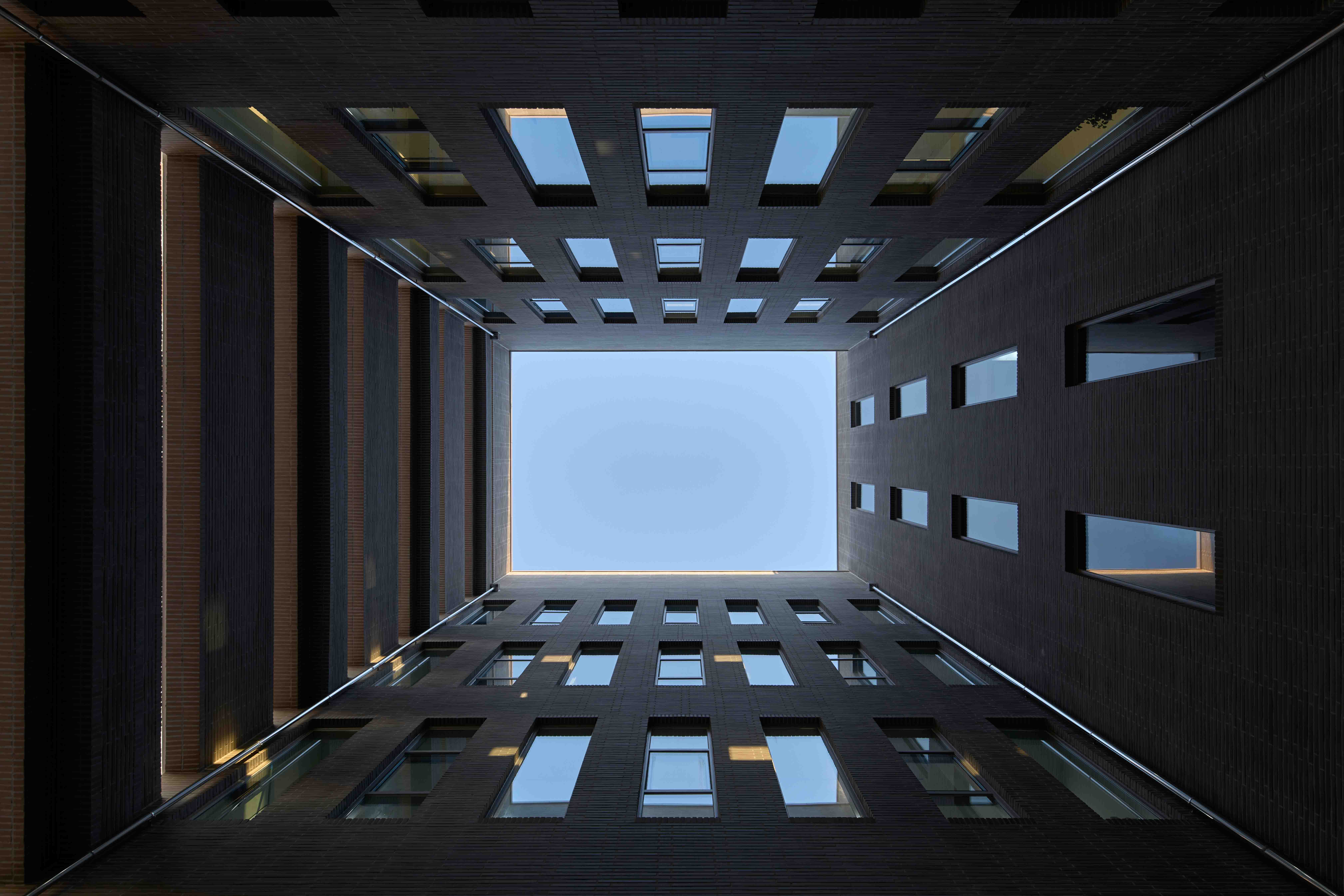 To create maximum volume, the headquarters has a courtyard at its center. The courtyard is open to the public, facing the pedestrian walkway, and provides a shaded yard for the neighborhood, counteracting the impression of exclusivity that the building might otherwise give. The exposed inner walls of the courtyard are made of textured brick, contrasting with the building's white exterior finish, emphasizing the courtyard's urban context. The relationship between the courtyard and the interior space on the first floor is somewhat passive, while the active relationship is expressed in the upper levels. The light from the skylight enters the building's interior, providing a comfortable work environment. The simple and massive mass captures the changes in weather and time, to become an architectural structure that speaks to the city with diverse expressions.
