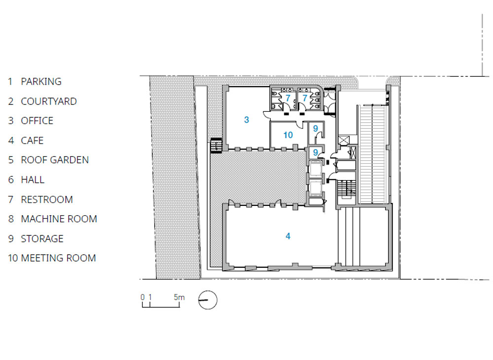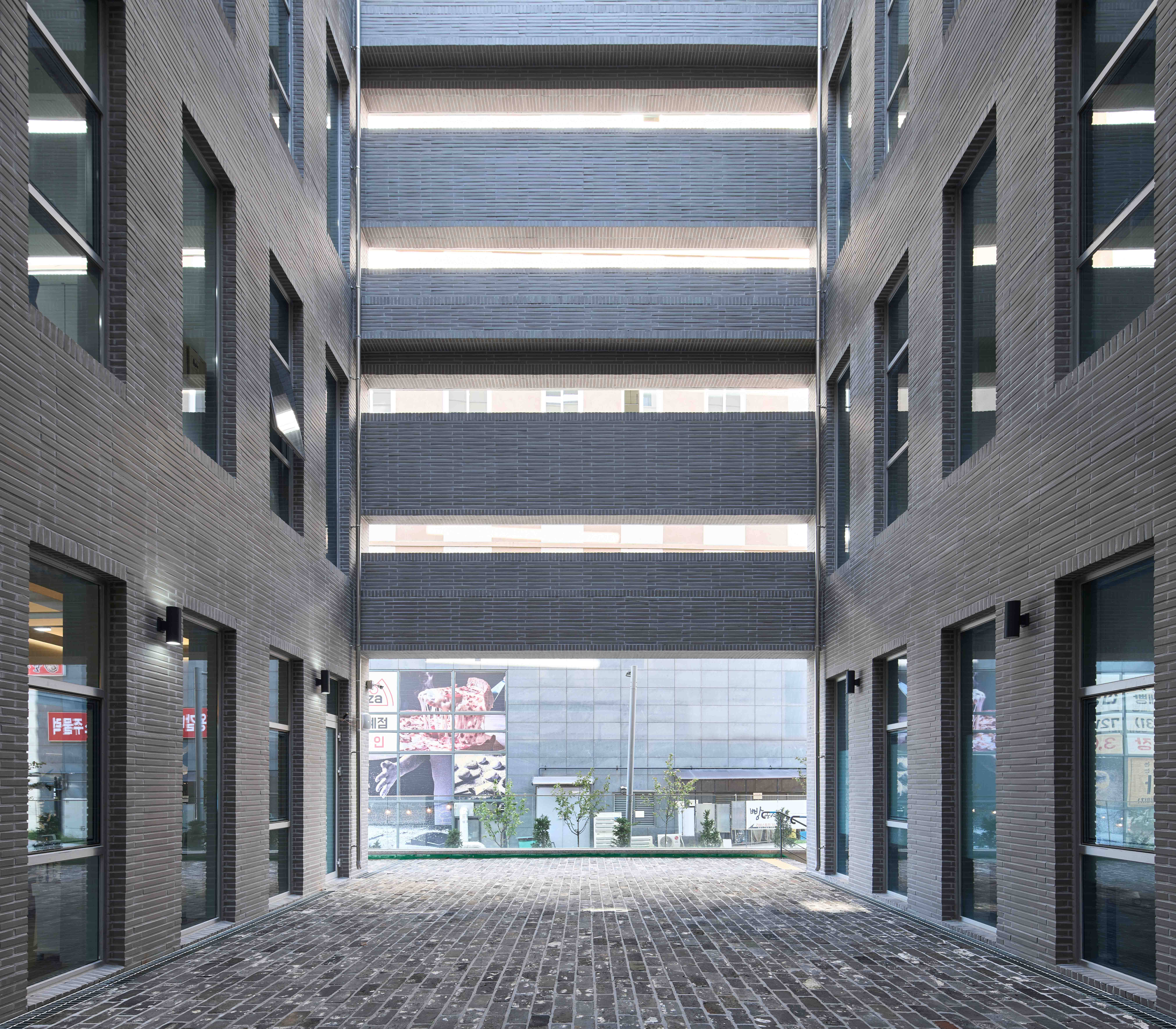 최대한의 볼륨을 만들어내기 위해 사옥은 그 중심에 중정을 품는다. 이 중정은 보행자도로변으로 공공 장소로 열려있어 자칫 배타적으로 보일 수 있는 건물의 인상을 상쇄하며, 동네에 그늘 있는 마당을 제공한다. 중정이 파고들어 드러난 속살은 외부의 백색 마감과 달리 질감 있는 벽돌이다. 이 대비는 중정이 도시에 속한다는 것을 명확히 드러낸다. 중정과 1층 내부 공간과의 관계는 다소 소극적이다. 적극적 관계는 오히려 상부 층에서 드러난다. 천공광의 편안한 빛은 건물 내부로 들어와 편안한 업무 환경을 제공한다. 단순하고 거대한 매스가 날씨와 시간의 변화를 담아내며, 다채로운 표정으로 도시에 말을 거는 건축물이 되길 기대해 본다.