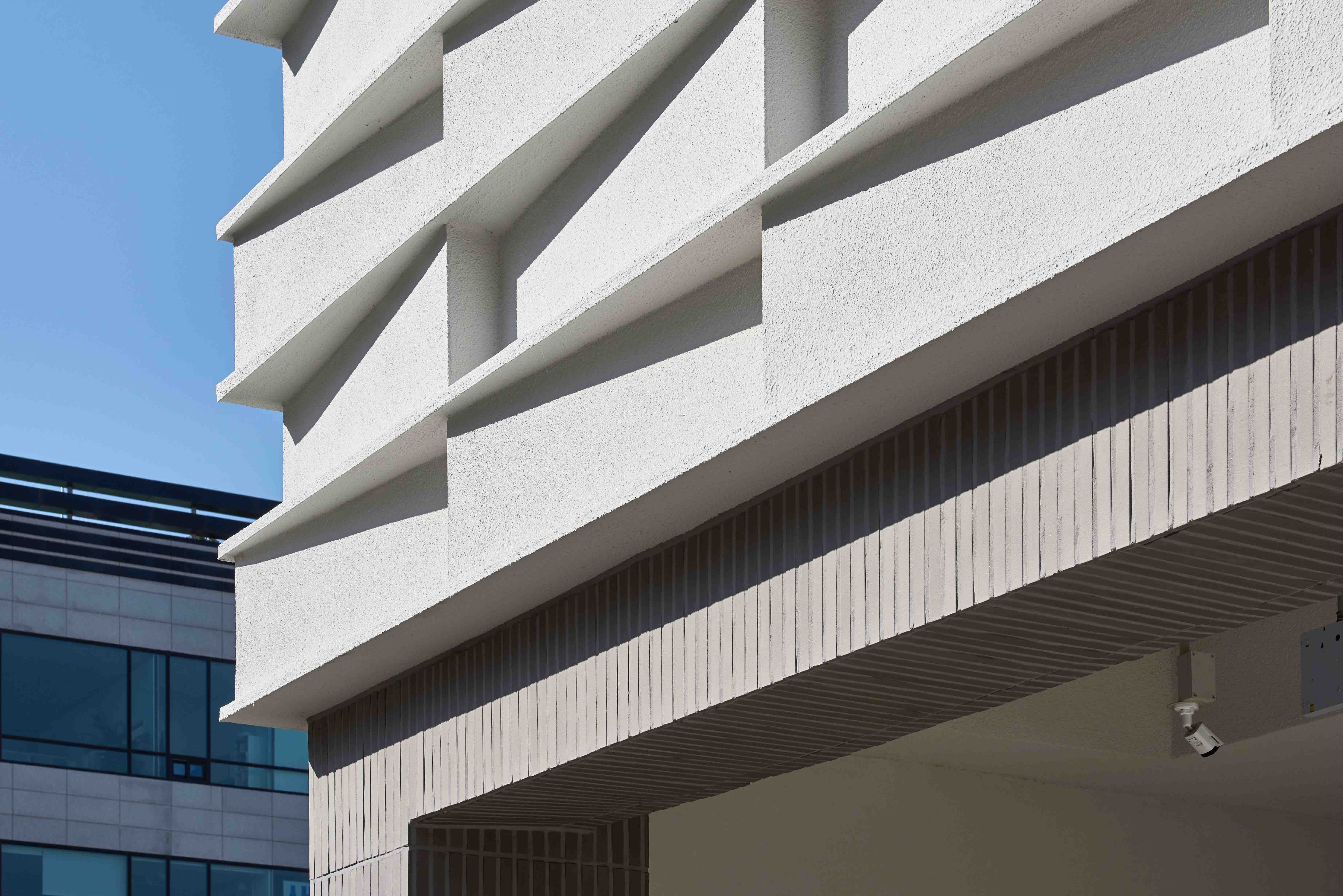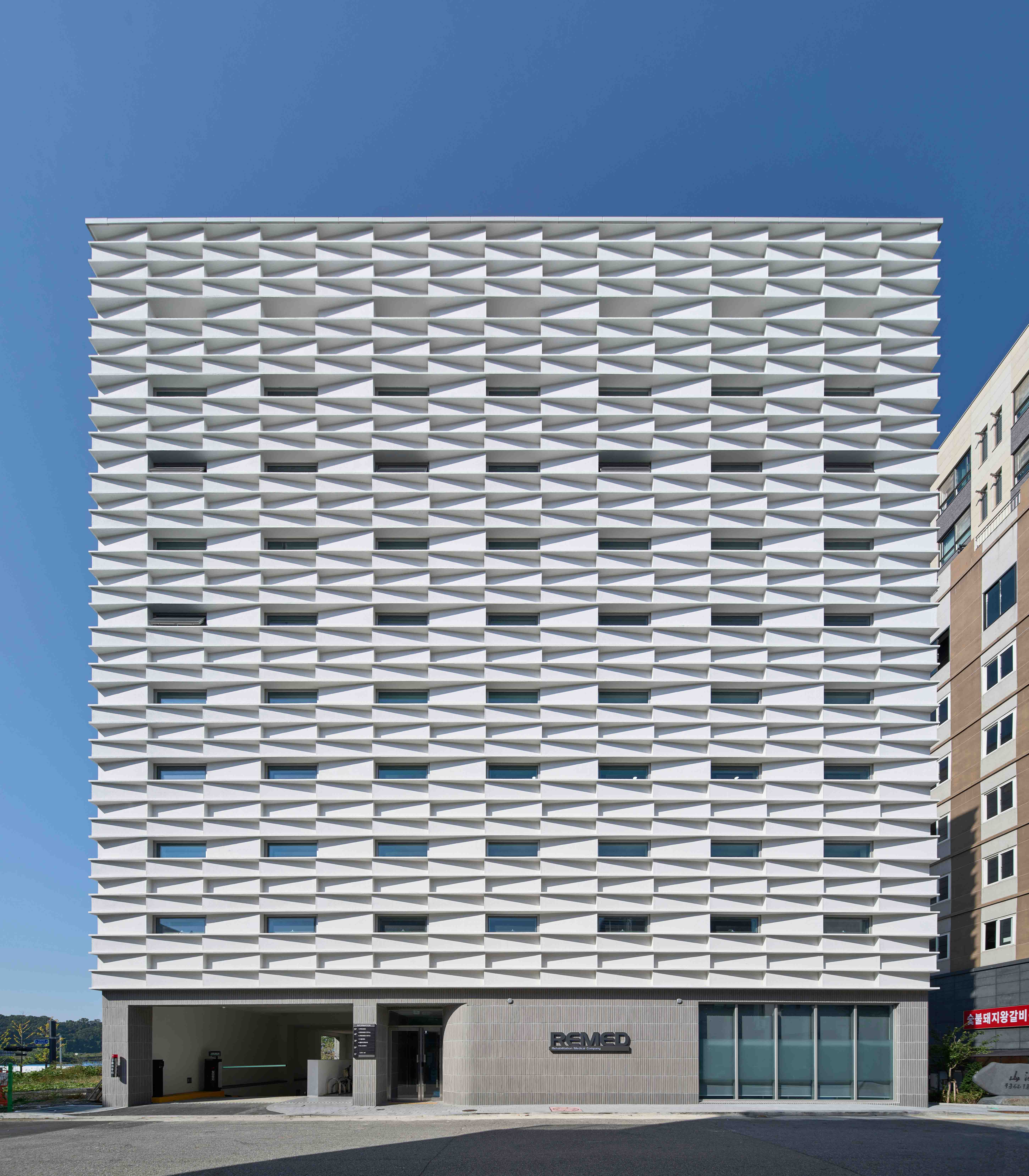 The target site is a District planning zone with a limit of 5 stories in height. The first requirement for the chairman of Remed was to create a spacious and impressive headquarters, but this became a difficult challenge because of the regulations. We decided to apply the allowed height of 4.5m per floor throughout the building. To fulfill the chairman's desire for a secretive and mysterious appearance, we installed only the minimum number of windows required for ventilation and lighting, with two rows per floor. Ten rows of windows were placed within the pattern on the external facade, which expresses the wrinkles of the brain and blurs the boundaries between floors. This, together with the high ceiling, gives the impression of a 10-story building rather than a 5-story one. We created regular and sharp wrinkles on the front and back of the building. These wrinkles, inspired by the wrinkles of the brain, inject life into a simple mass. Although the selection of finishing material using the stone-vent system was unconventional and adventurous, it turned out to be an excellent choice. The wrinkles facing the westward main road add rich expression through the movement of shadows and cool-toned light until late afternoon.
