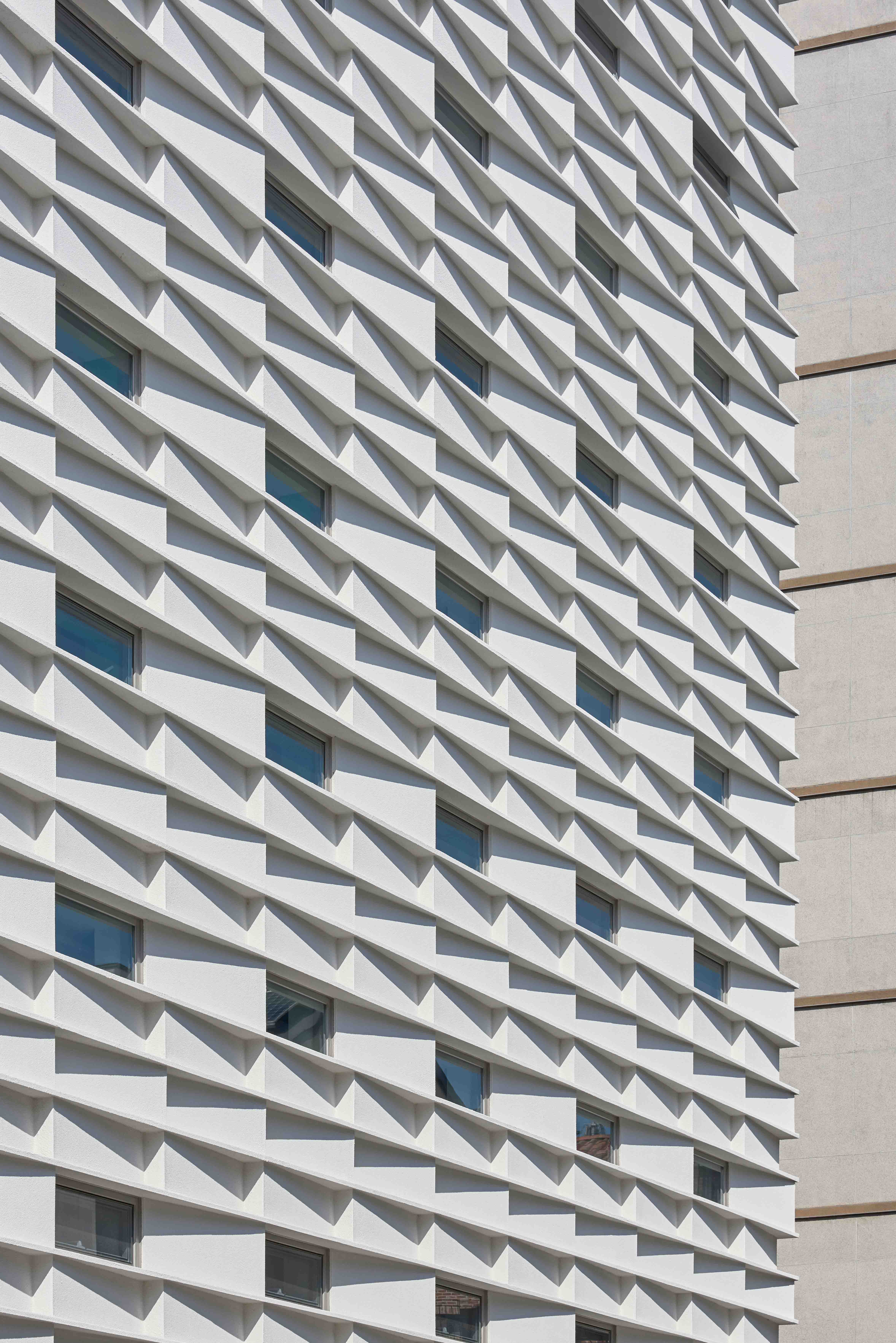 대상지는 지구단위계획구역으로 규모가 5층으로 제한되어 있다. 리메드 의장의 첫 번째 요구 조건인 커 보이는 사옥의 모습이란 이러한 규제로 인하여 어려운 난제가 되었다. 우리는 지구단위에서 허용한 4.5m의 층고를 전 층에 적용하기로 했다. 블랙박스 같은 비밀스러운 모습이었으면 좋겠다는 의장의 바람을 받아 필요한 환기와 채광을 위한 최소의 창만을 두기로 했고 그 창은 층 당 2열로 배치했다. 층의 구분을 모호하게 만들 목적과 뇌의 주름을 표현한 외부의 패턴 안에 10열의 창이 배열됐다. 여기에 높은 층고의 효과가 더해져 건물은 5층이 아닌 10층의 규모처럼 보이게 된다. 우리는 건물의 전·후면에 규칙적이고 날카로운 주름을 만들었다. 이 주름은 뇌 주름의 은유이며 단순한 매스에 생기를 불어 넣는 장치이다. 주름이기 위해선 면의 끊어짐 없이 이어져야 했고 그러한 이유로 마감재의 선택에 있어 스토벤텍 시스템은 낯설고 모험적이었지만 결과적으로 탁월한 선택이었다. 서향의 큰 도로에 면한 주름은 늦은 오후부터 해질 때까지 낮은 색온도의 빛과 그림자의 움직임이 더해져 풍부한 표정을 만든다.