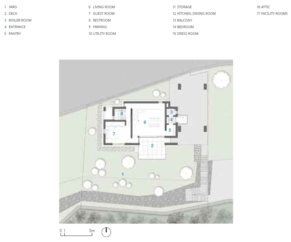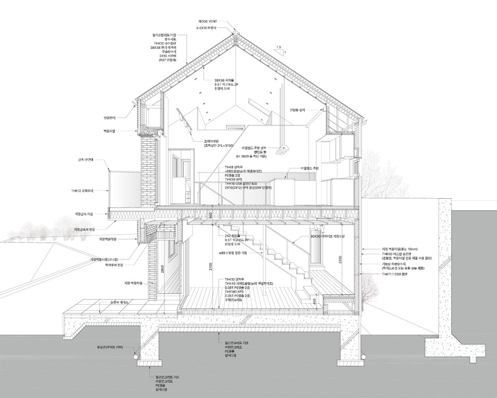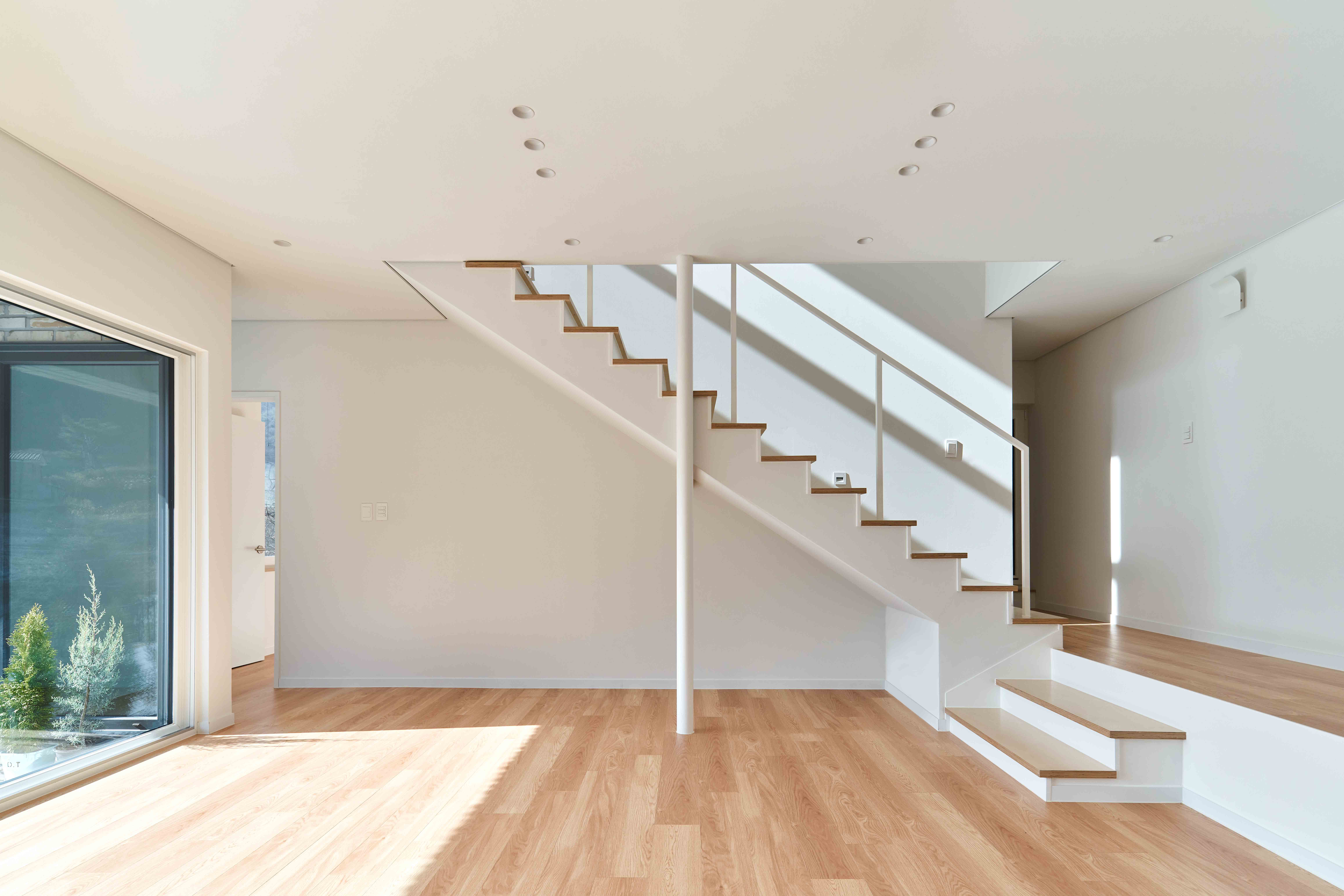 It's a house where human existence is juxtaposed with the vast flow of nature, making life and death nothing in the end. To achieve this, it was first decided to utilize the excellent natural landscape of Gyeryongsan Mountain, where the land is located. All the living spaces in this house are located on the side facing the mountain. The living room and study have large windows beginning at the floor, bringing in the beautiful view of Gyeryongsan Mountain. In particular, the living room on the second floor provides a wider view using walls that open gradually toward the window and the balcony railing was designed to be as transparent as possible to avoid obstruction. The windows of the master bedroom and guest room are designed to bring the sky, mountains, and forests closer at the height of the furniture that stays the longest (bed), the skylight of the loft shows the stars of the night sky, and the window of the stairway faces Sambulbong, the highest peak of Gyeryongsan Mountain, as one walks up.