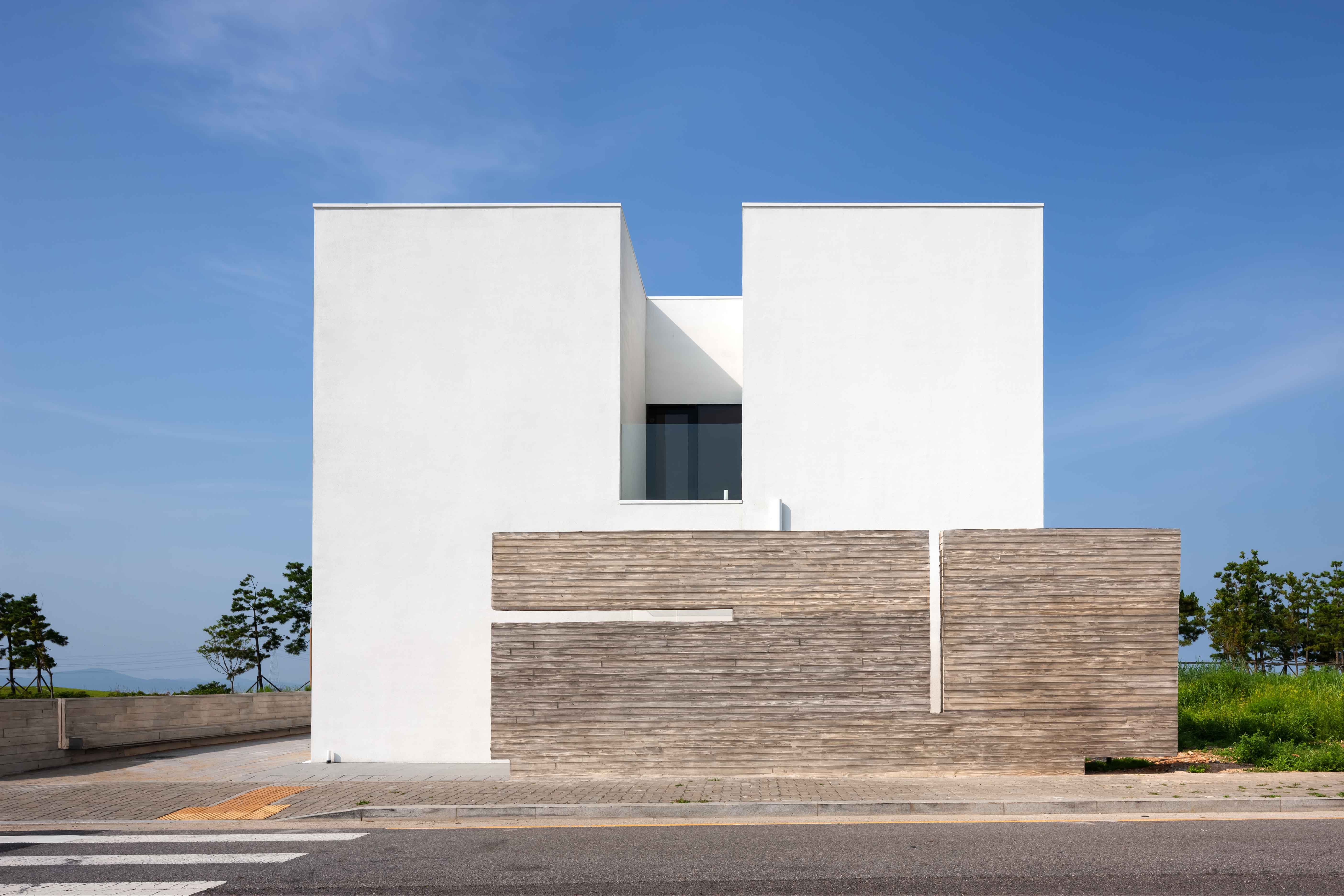 The Siheung J House faces Sihwa Lake. The land where the house stands is a rectangular shape with a long north-south axis, located in a developed housing area. Since the site faces Sihwa Lake to the south, it was important to design the house in a way that maximizes the view of the lake. The northern side of the site faces the road, which does not provide any view of the lake. The facade of the house was designed to look uncomplicated when viewed from the entrance road. People coming out of the entrance can see the outside through small slits in the walls. Unlike the smooth finish of the building, the walls were treated with a rough panel finish. Three indirect lights were installed inside and outside the entrance wall to create an object-like presence of the wall as part of the building's facade.