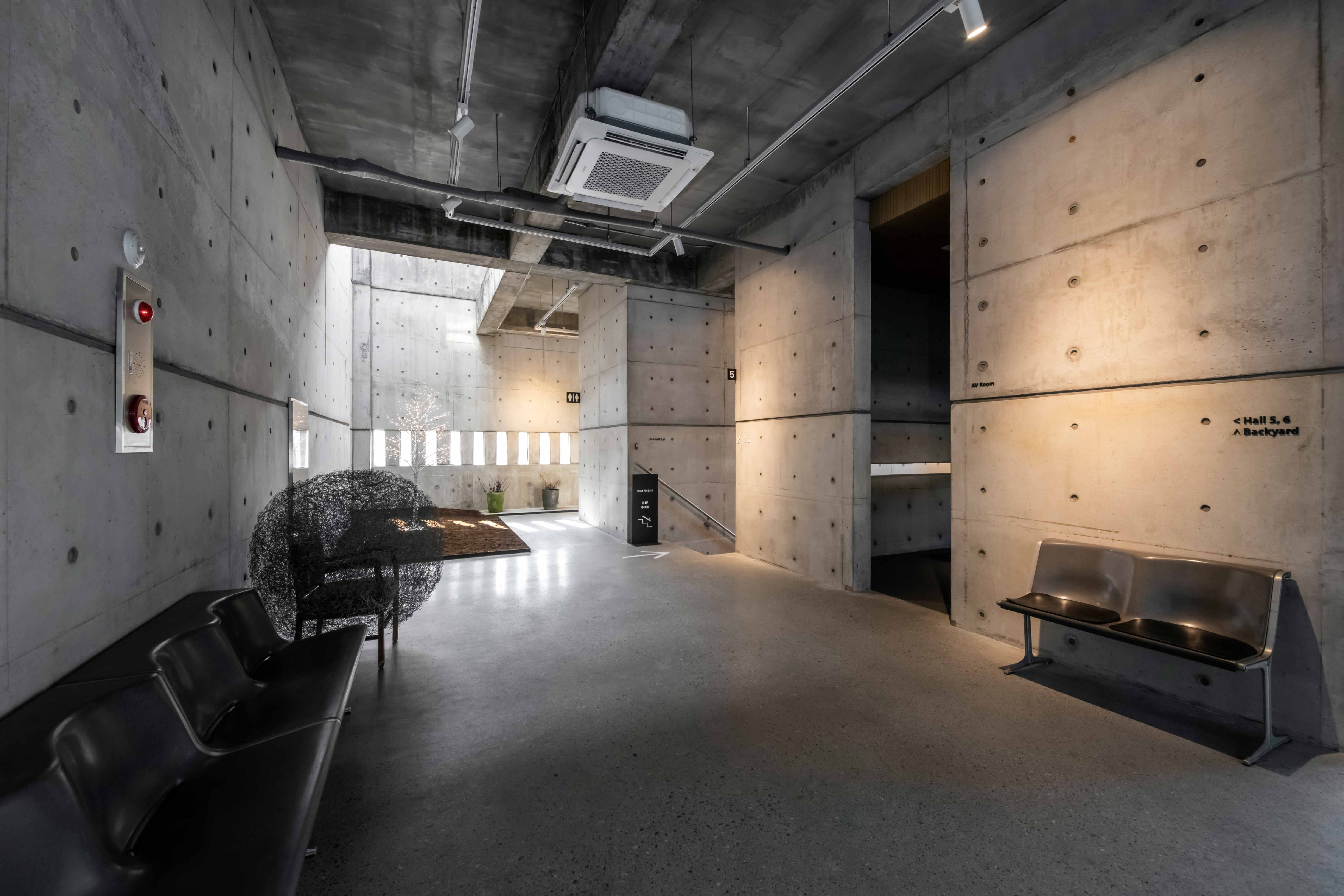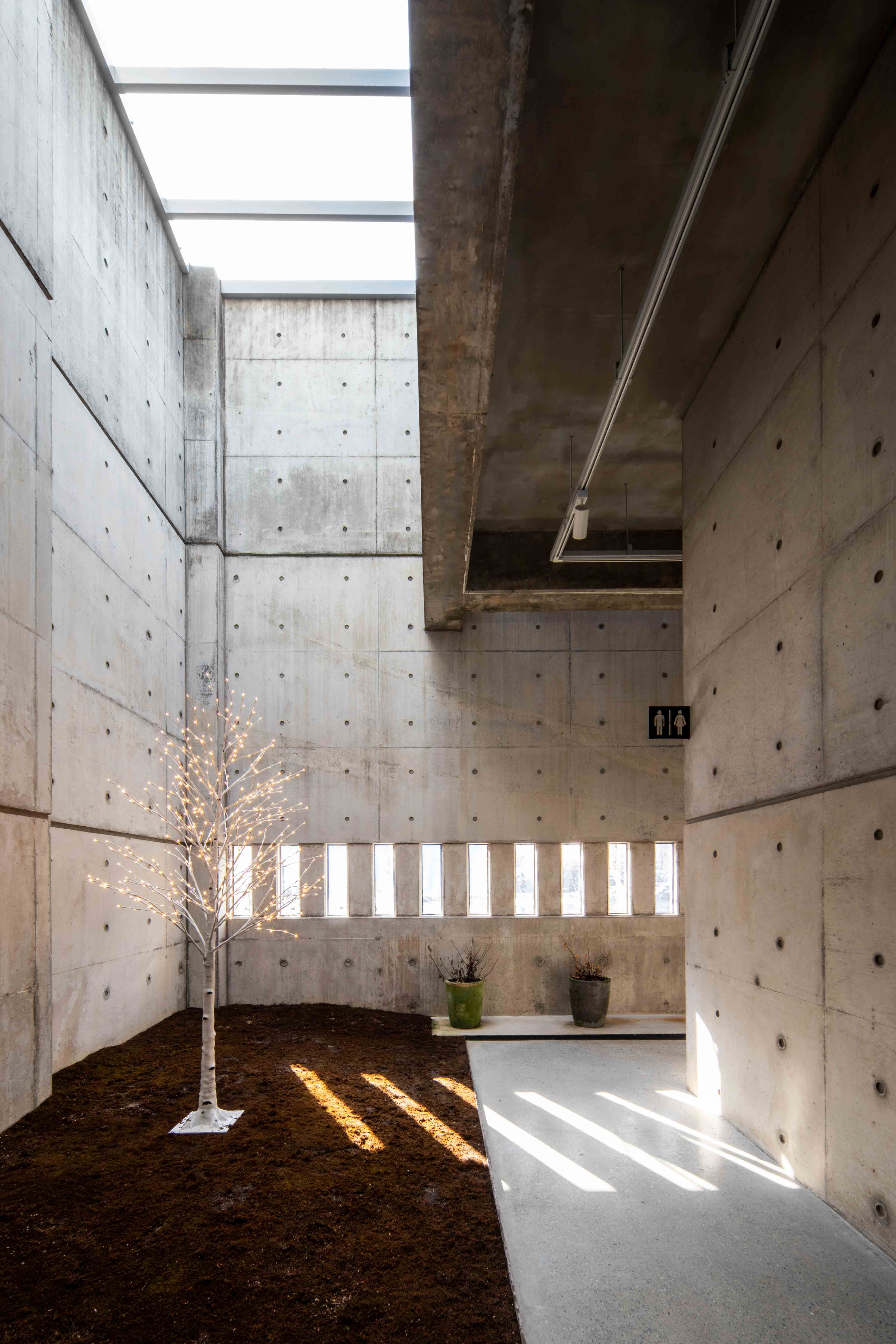 The art museum has a clear character of space. To add a sense of leisure to the process of entering the gallery, E Ham Gallery arranged the walls and openings in various ways on horizontal and vertical paths. Through this, visitors can experience various sensations and leisurely moments during movement through the space depending on the degree of natural light. It creates a path that feels like a leisurely unpaved rural road, sometimes like a mountain trail where you can occasionally feel the sunlight through the bushes, and sometimes like an alley in a village where the light streaming from windows on both sides is projected onto the clouds like moonlight.