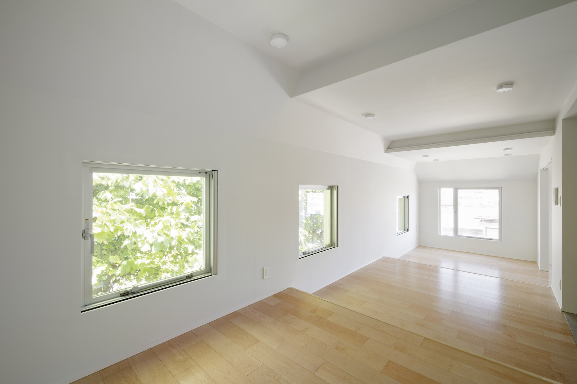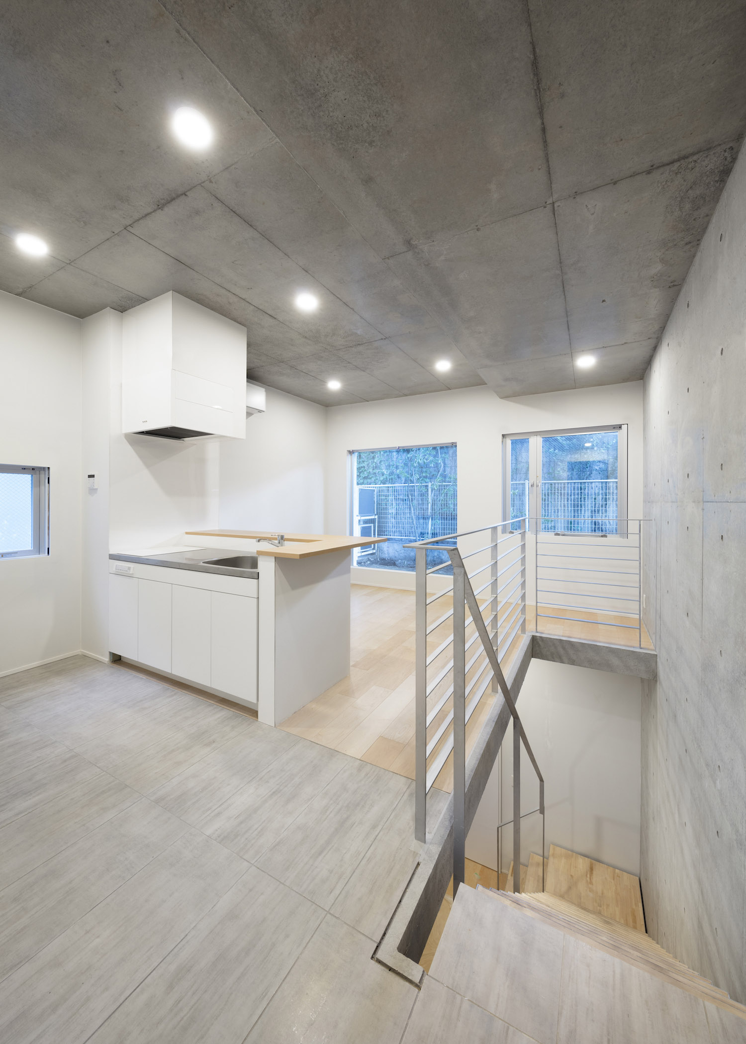 The Daita Project is located close to the main road of Setagaya in western Tokyo. It is a residential complex with 16 apartments in a quiet residential area. The site is located on a hill where L-shaped mansions surrounded by trees are scattered. The L-shaped space is designed to face the road and follow the slope of the land with two-story housing units in the surrounding mansion. The top layers reflect the shape to create various cross-sections. In addition, plants are planted throughout the exterior of the building, and the difference in height along the slope of the year was utilized. The residential unit has a concise design combined with a small empty space through several flexible arrangements. This can also be expressed as a contrast between the white panel wall and the exposed concrete wall. Continuous space layout inside can be changed by residents, and L-shaped walls are designed to be used as walk-in closets or small computer rooms.