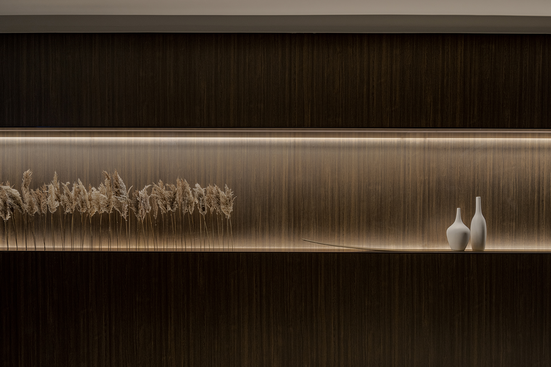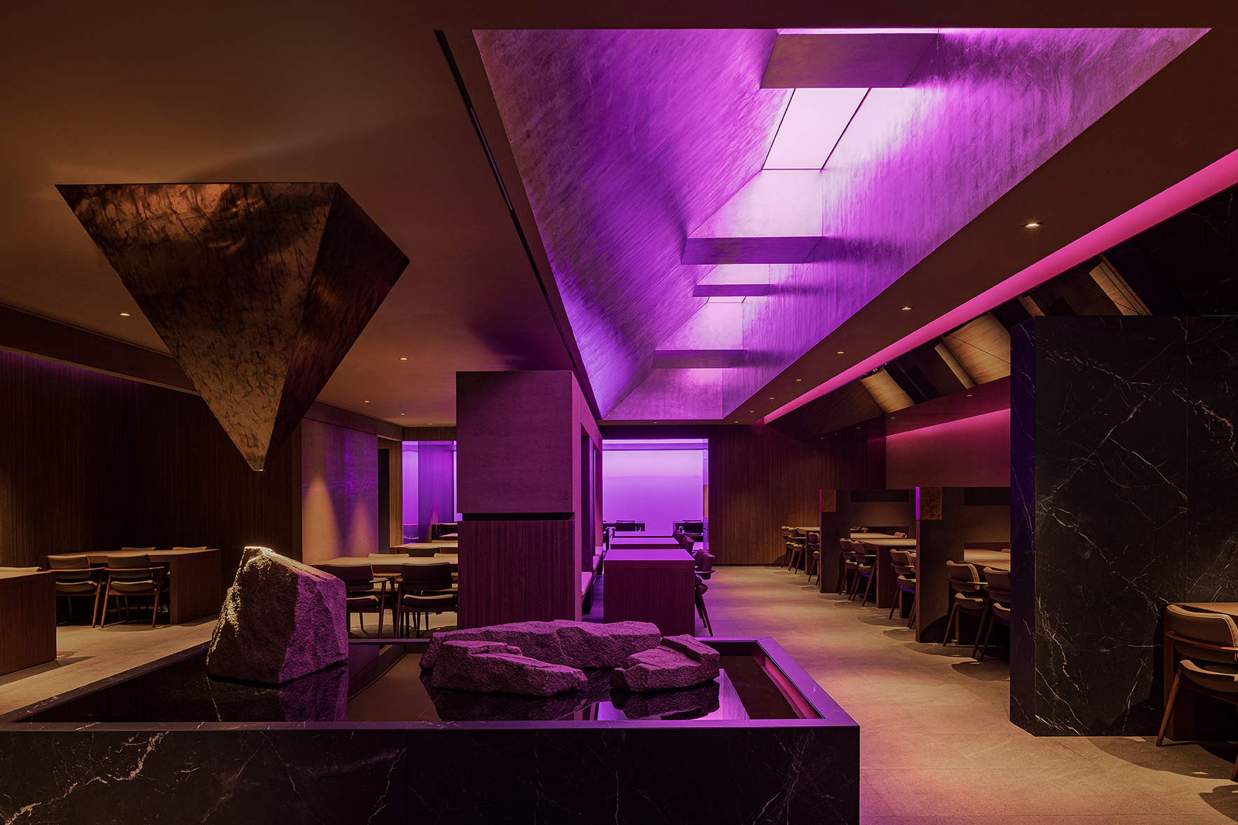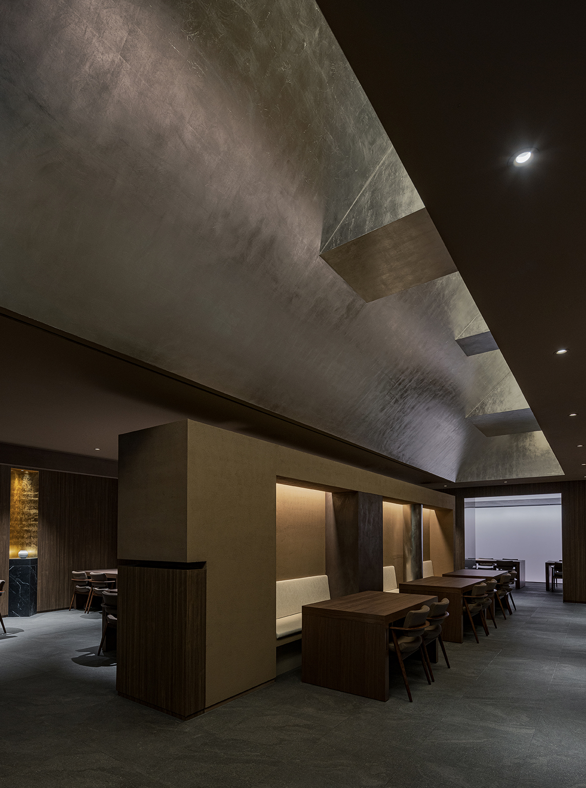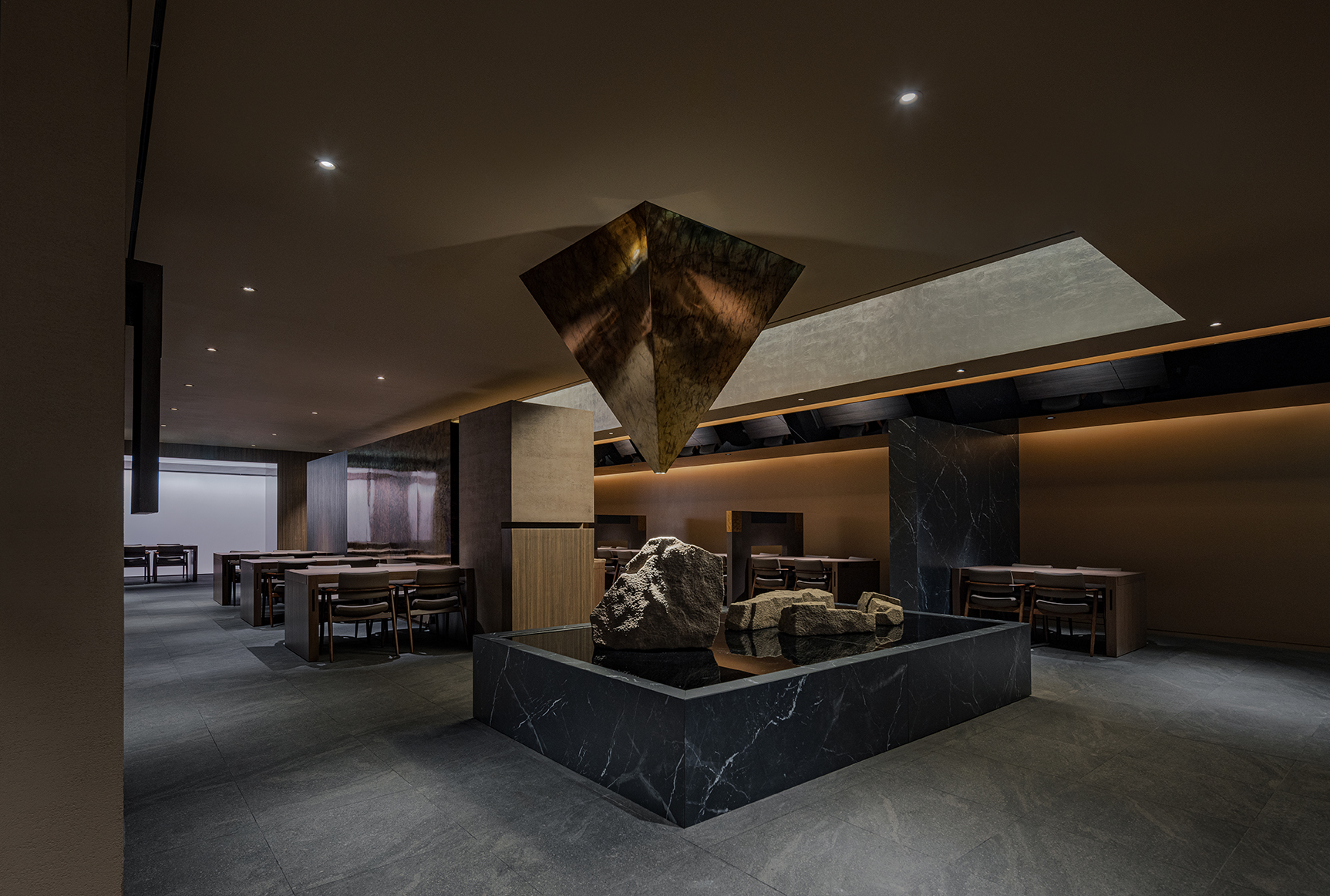 In the façade, the quiet visual attention of the reeds is drawn, and the light of the counter wall welcomes customers. The ceiling of the main hall originated from a different shape of the existing space, but this condition was used to express the geometric shape and ceiling facility structure as it is to realize the original architecture. Different heaven and earth for each hall space can experience various synesthesia from the customer's point of view of the space. At the beginning of the interior, in order to give a point element, the ceiling object and the arrangement of artist Lee Tae-soo's "stone composition" work were intended to express quietness. The finishing material of the wall used warm-toned special paint to express the naturalness of the material, and in the semi-room inside the hall, wood material was used to give another space independence within the space. In the semi-room, a front barisole was used to express minimalism. The central wall has a built-in table configuration that may look empty, increasing the density of the space.
