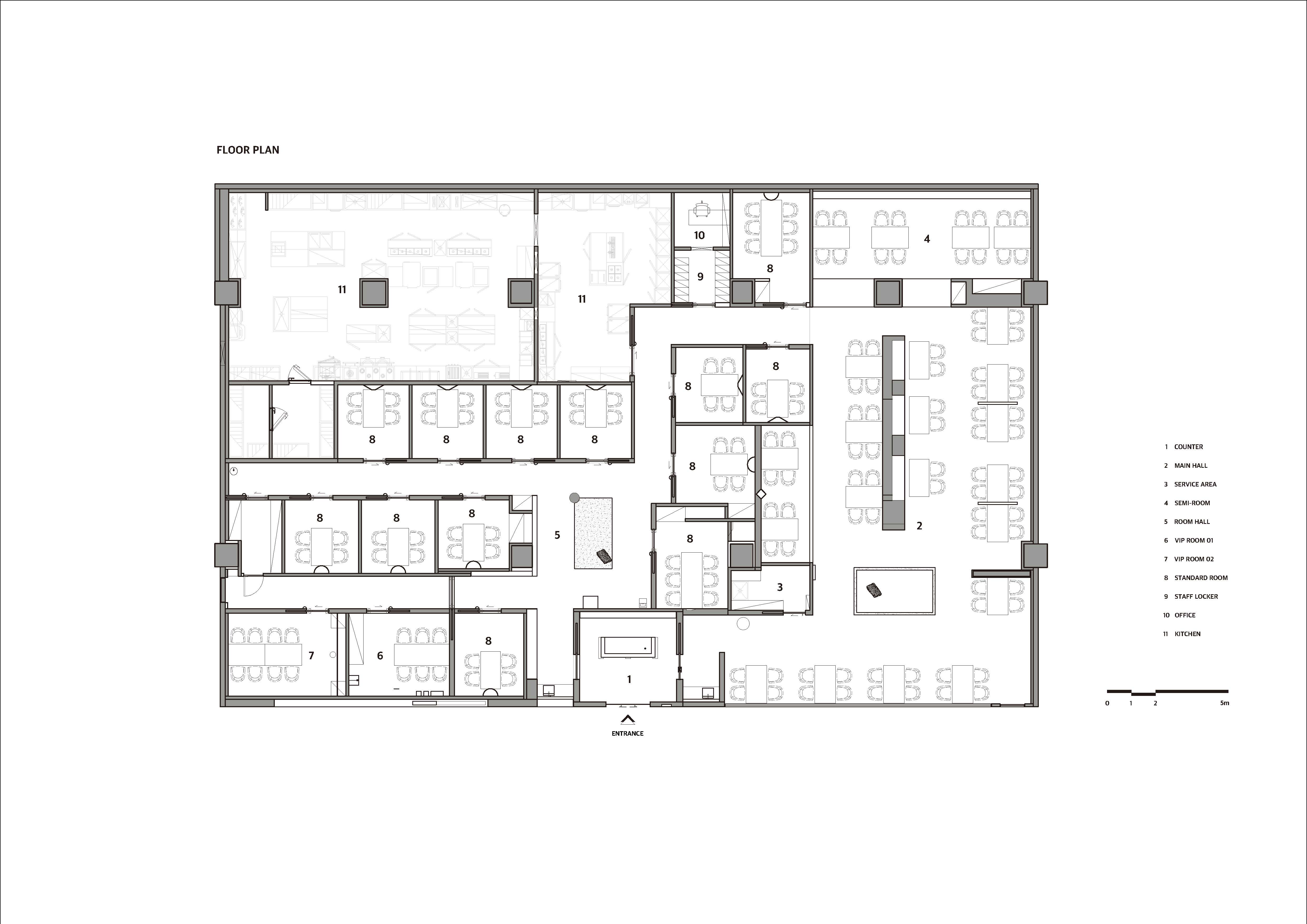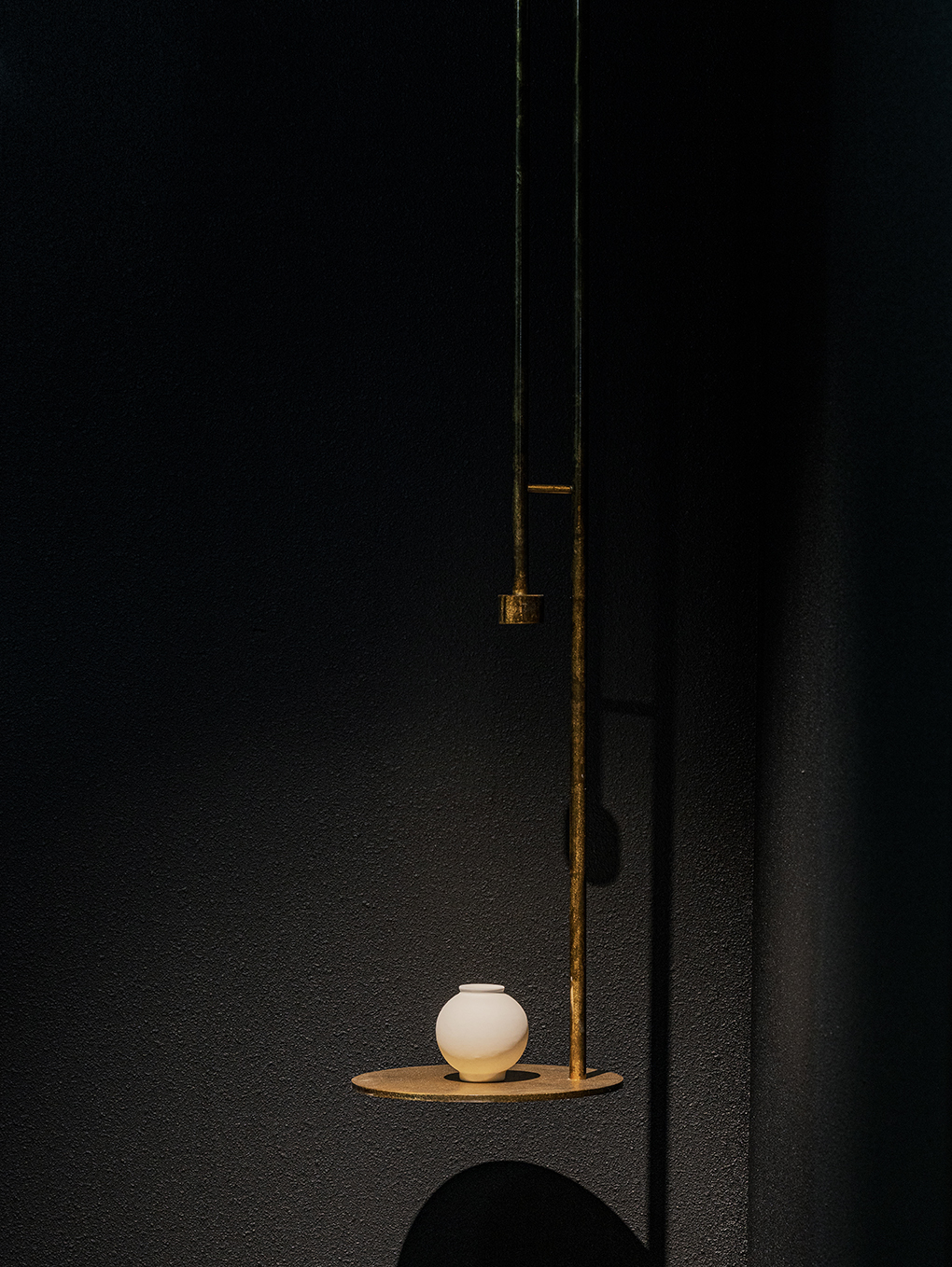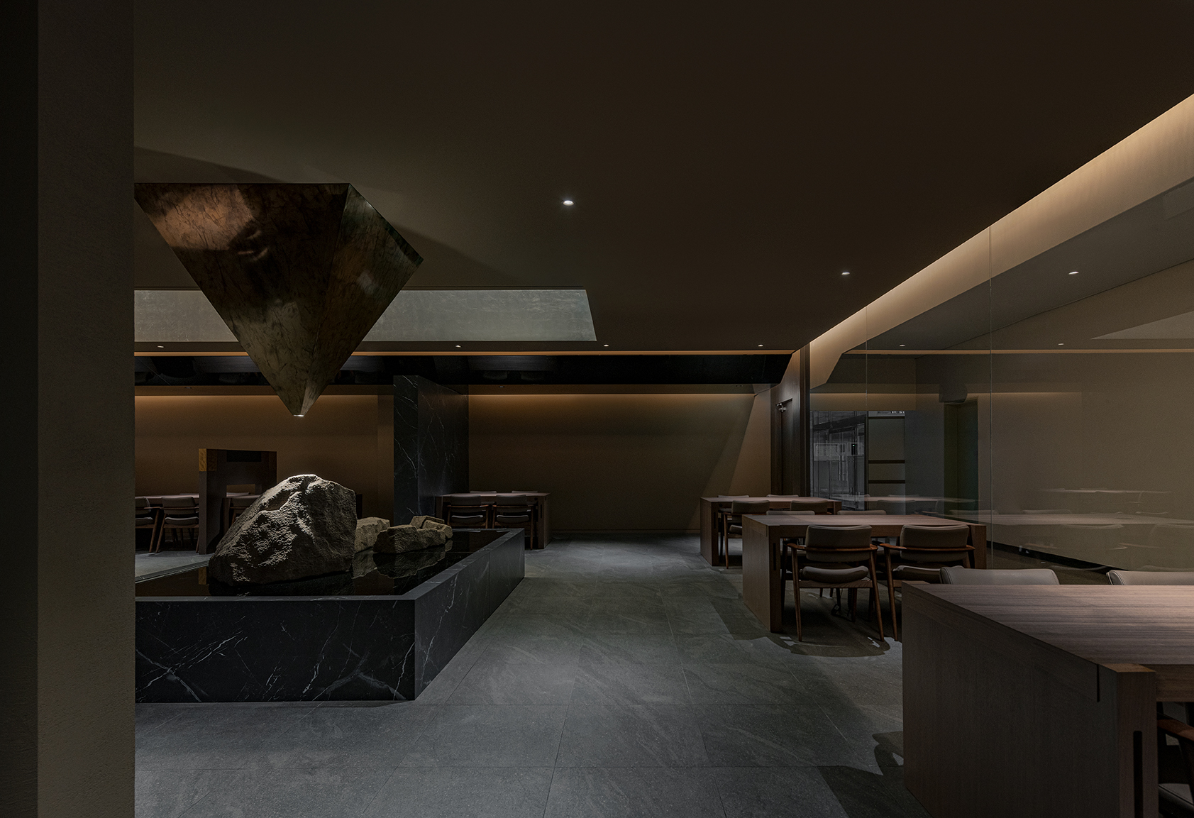 In the façade, the quiet visual attention of the reeds is drawn, and the light of the counter wall welcomes customers. The ceiling of the main hall originated from a different shape of the existing space, but this condition was used to express the geometric shape and ceiling facility structure as it is to realize the original architecture. Different heaven and earth for each hall space can experience various synesthesia from the customer's point of view of the space. At the beginning of the interior, in order to give a point element, the ceiling object and the arrangement of artist Lee Tae-soo's "stone composition" work were intended to express quietness. The finishing material of the wall used warm-toned special paint to express the naturalness of the material, and in the semi-room inside the hall, wood material was used to give another space independence within the space. In the semi-room, a front barisole was used to express minimalism. The central wall has a built-in table configuration that may look empty, increasing the density of the space.