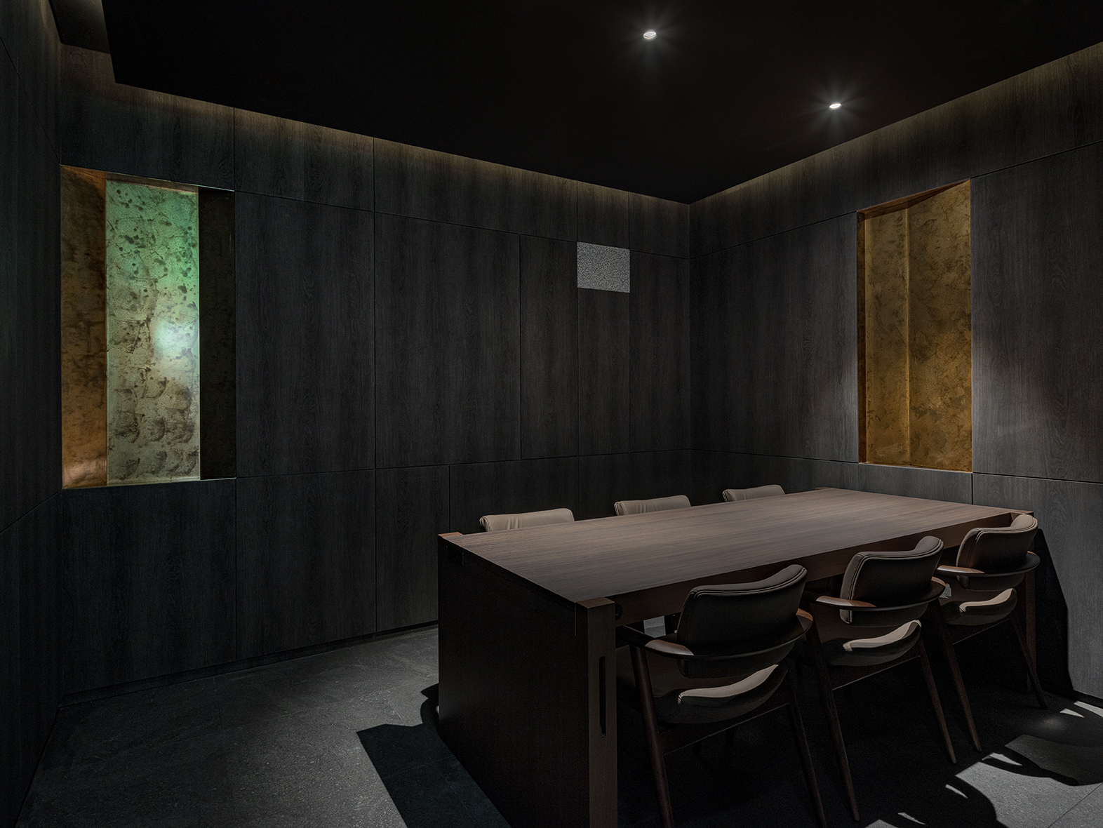 다음으로 룸영역의 홀은 박공천정의 구조를 활용한 디자인을 적용하였다. 공간의 높은 천고를 활용했기도 하지만 홀 영역과의 대비대는 디자인으로 또다른 공간적 재미를 부여했다. 중앙의 면은 홀과 동일 하게 이태수작가의 작품이 배치되며, 넓은 대기 공간으로 활용한다. 입구 벽체는 컨셉을 표현하는 프린팅 바리솔을 이용해 임팩트 있는 공간을 연출하며, 우드 시트를 활용해 홀과의 통일성을 줌과 동시 대비가 될 수 있도록 담백한 공간으로 연출 하였다. room들은 높은 천고를 활용하여 빛이 쏟아지는 장엄한 공간을 연출했으며, 안정적이고 프라이빗함을 표현한다. 오쓰세이로무시는 공간의 장면마다 다양한 경험을 제공하기도 하지만, 조명 시스템을 이용해 낮,밤,계절별 다양한 조명을 연출하여 풍부한 공간의 재미를 느낄 수 있다. 공간은 고전적 미학을 따르며, 본연의 맛에 집중 할 수 있는 감각적 경험을 제공하려 한다.