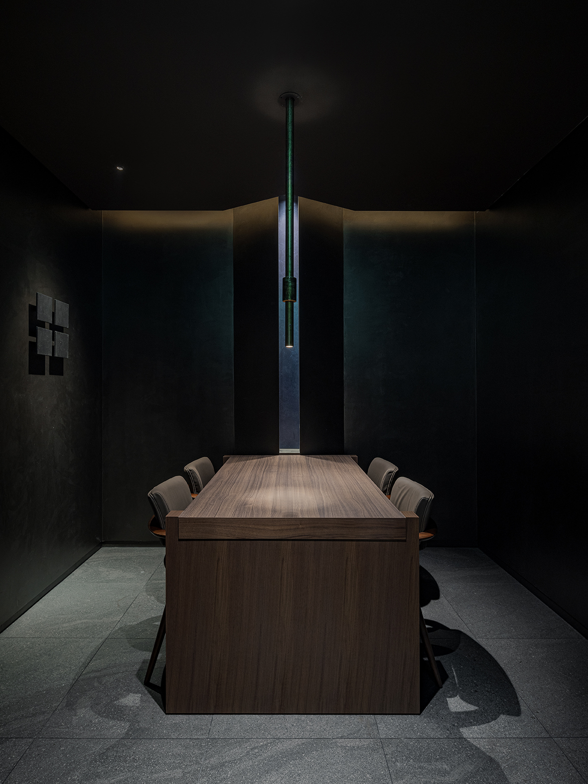 Designstudiominwoo* is designed to make two spaces feel different under the concept of "TIMELESS MODERNITY," which does not change over time. The world from the entrance through two roads is the same, but it gives a different feeling. The first hall space, which entered through the fork, reflected dimly the figures with the light falling from the high ceiling, imagining fog in the pond. A quiet stone work is located on the pond, creating an atmosphere of space. An object with different physical properties made of triangular horns becomes a point of space. The second room space of the forked road is reminiscent of the light from the wall and reflected through the trees, expressing the beauty of soft light. The space composition of Otsuseiromushi consists largely of an entrance, a hall, a room, and a kitchen. A considerable area of 210PY was largely classified into holes and rooms (15ea), and scenes in different spaces were created.