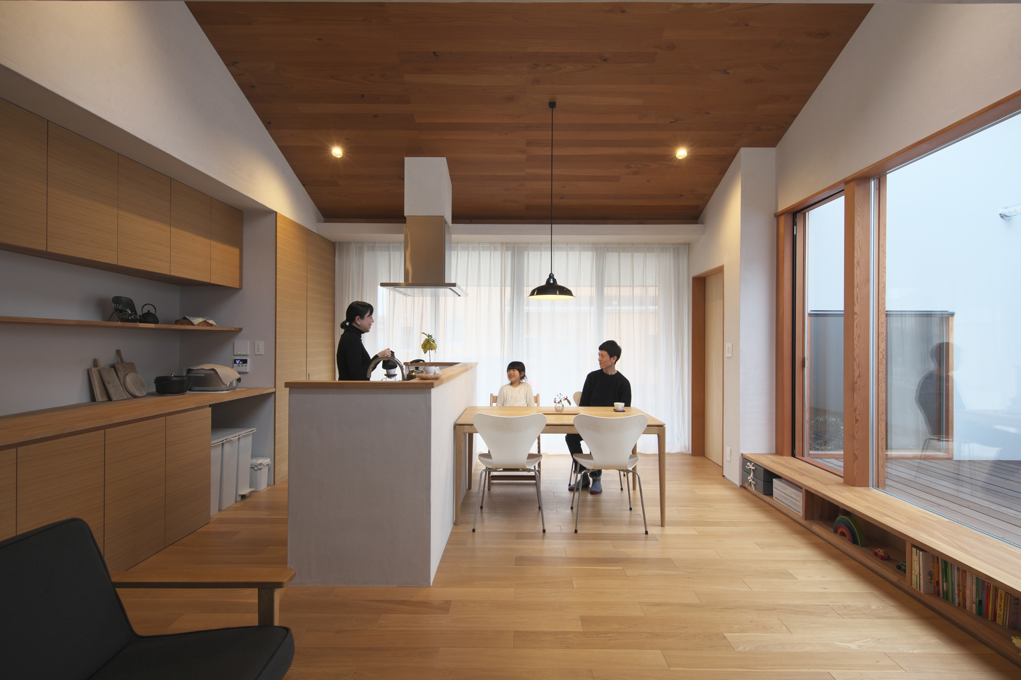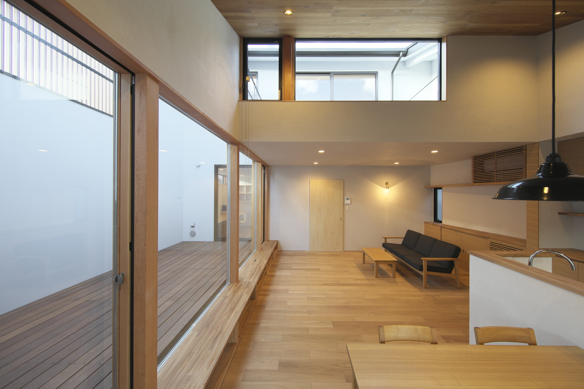 This house is located on the outskirts of Takasaki in Gunma Prefecture. The two-story house was built for a couple and their young daughter, which the couple planned to build on the land they inherited from their parents. The site is long and narrow in the north-south direction and was not an ideal living environment. Hence, a courtyard was placed in the center of the site to invite the wind, and a plan for a townhouse was considered. The living room surrounds the music room where the family can gather and enjoy music together, and the living room is connected to the courtyard. The distinctive gabled roof provides a large interior space and privacy from the outside.