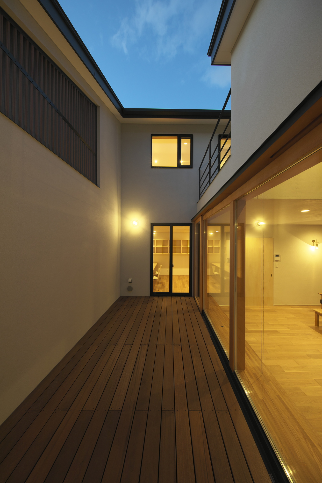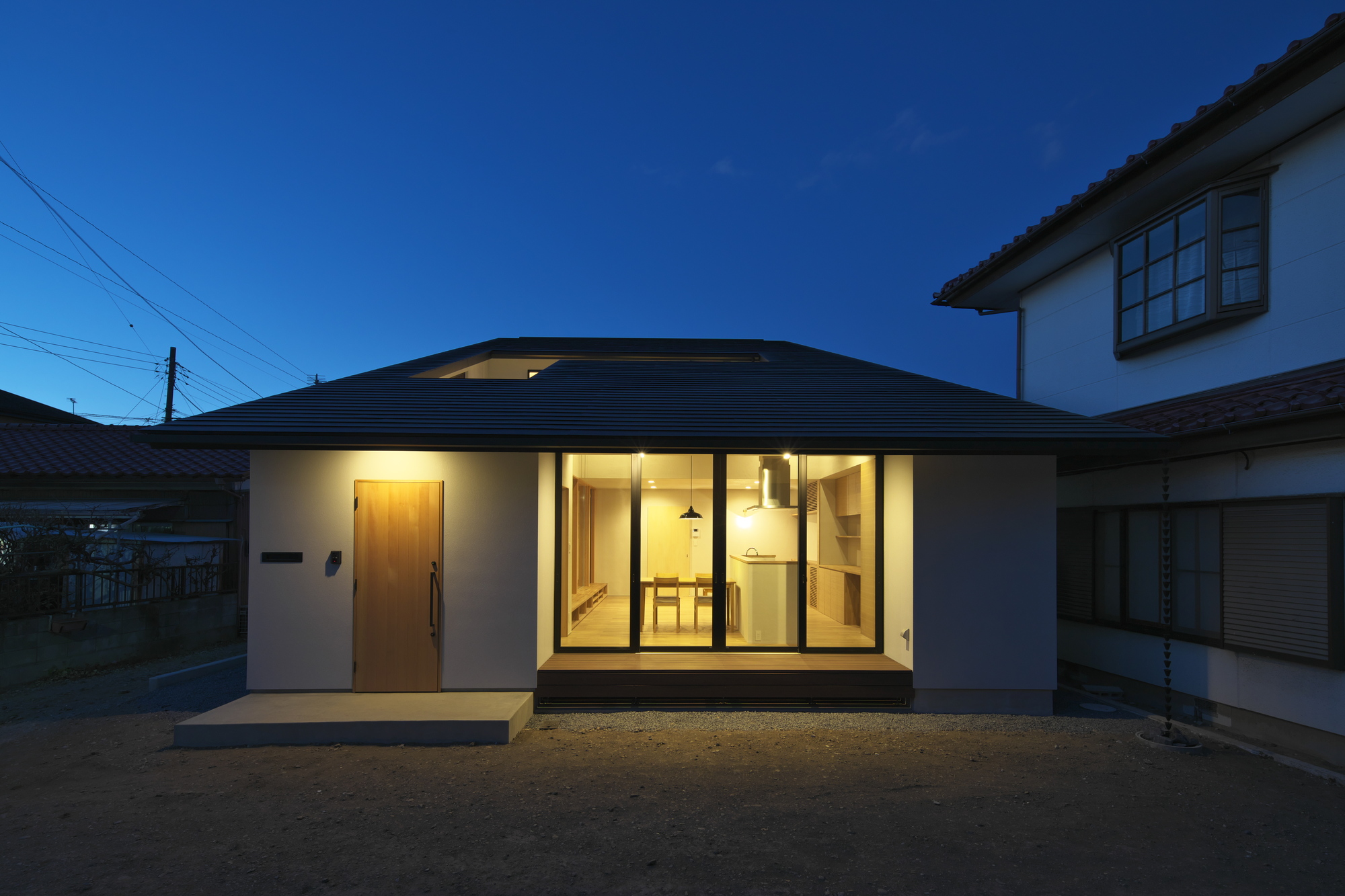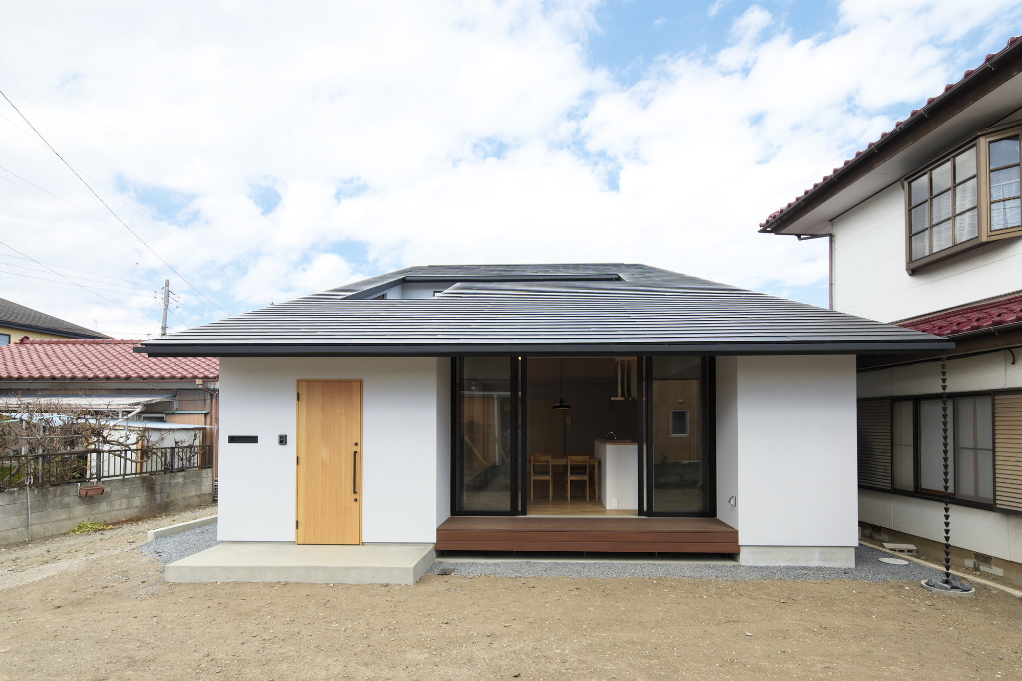이 집은 군마 현의 타카사키 외곽에 있다. 2층 집은 부부와 어린 딸을 위한 곳이며, 부부는 그들의 부모로부터 물려받은 대지에 집을 계획했다. 남북 방향으로 길고 좁은 대지는 좋은 생활 환경은 아니었다. 그래서 바람을 들여올 수 있도록 안뜰을 대지 중앙에 배치하고 타운하우스와 같은 평면이 고려됐다. 가족이 모여 함께 음악을 즐길 수 있는 음악실을 거실이 감싸고 있으며, 거실은 안뜰로 연결된다. 특색 있는 박공 지붕은 내부에 넓은 공간을 제공하며 외부로부터 사생활을 보호해준다.