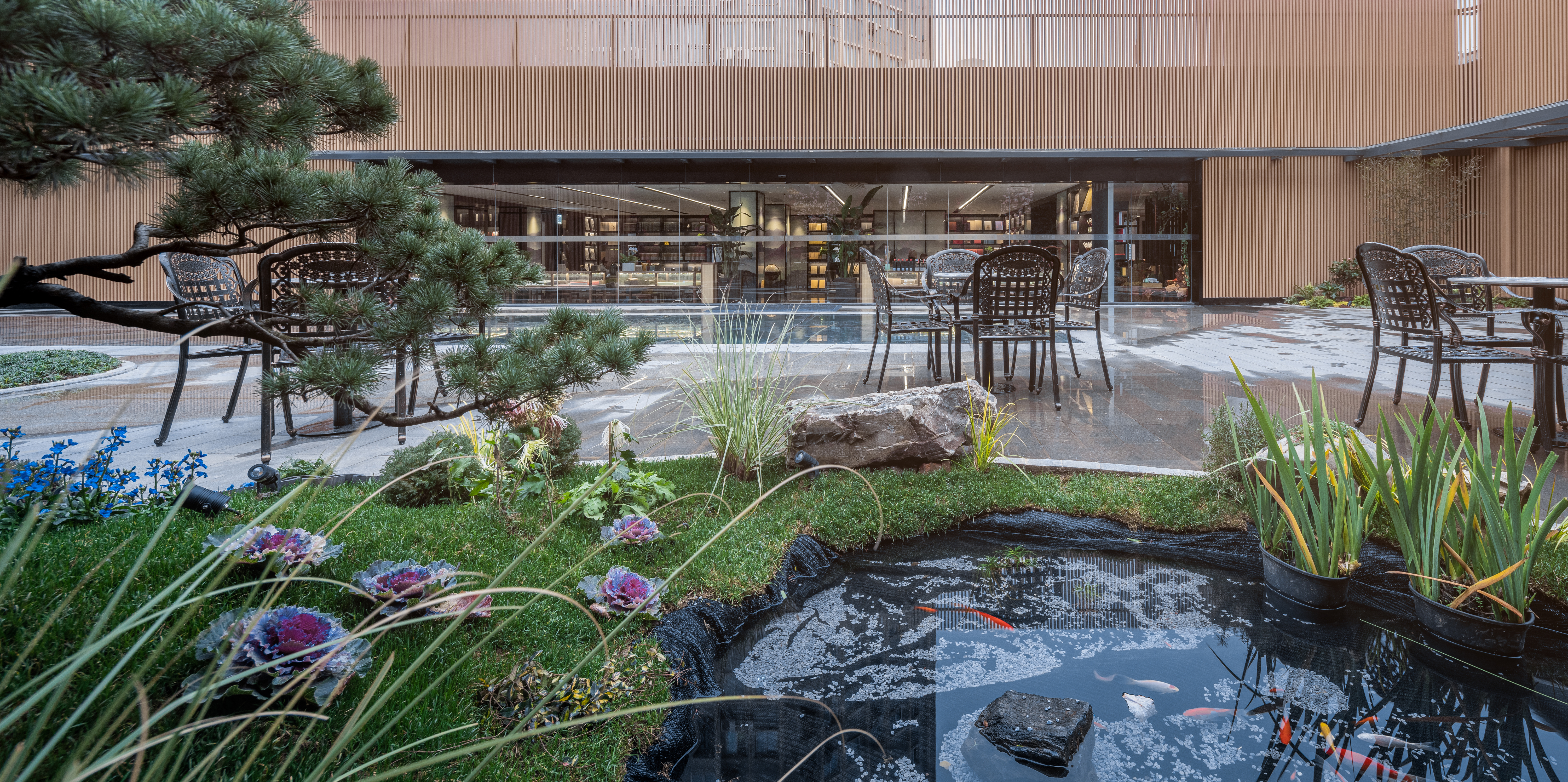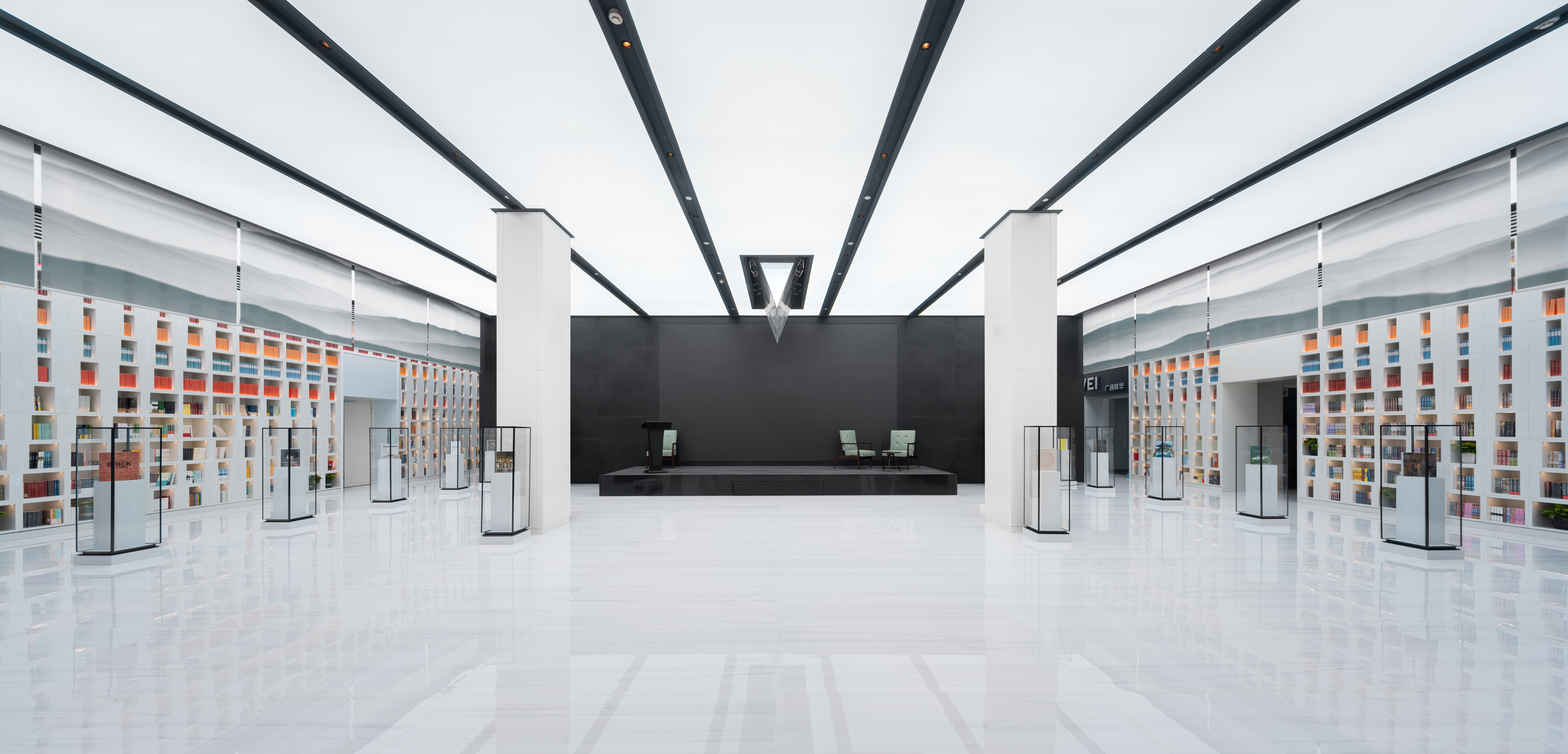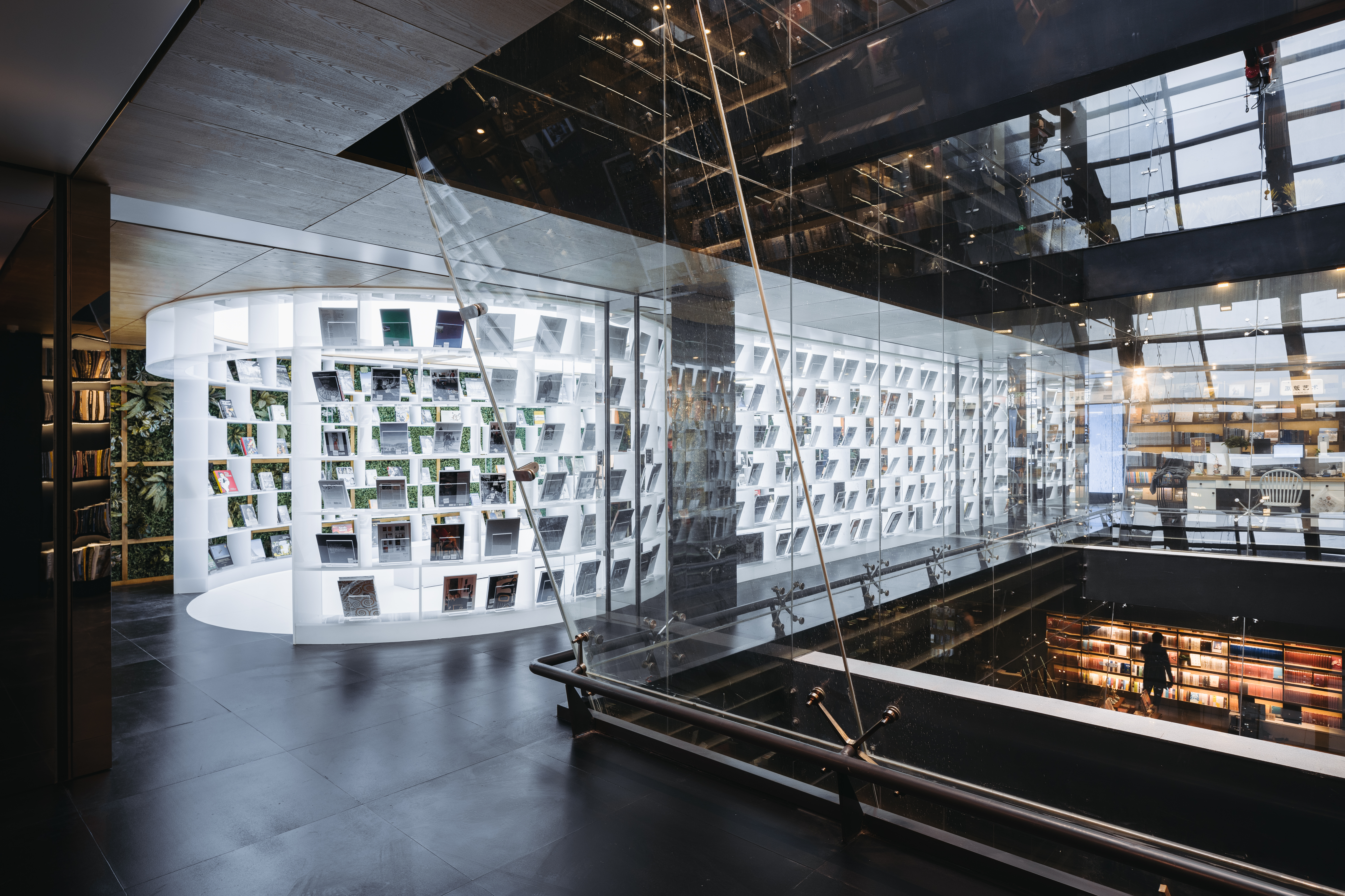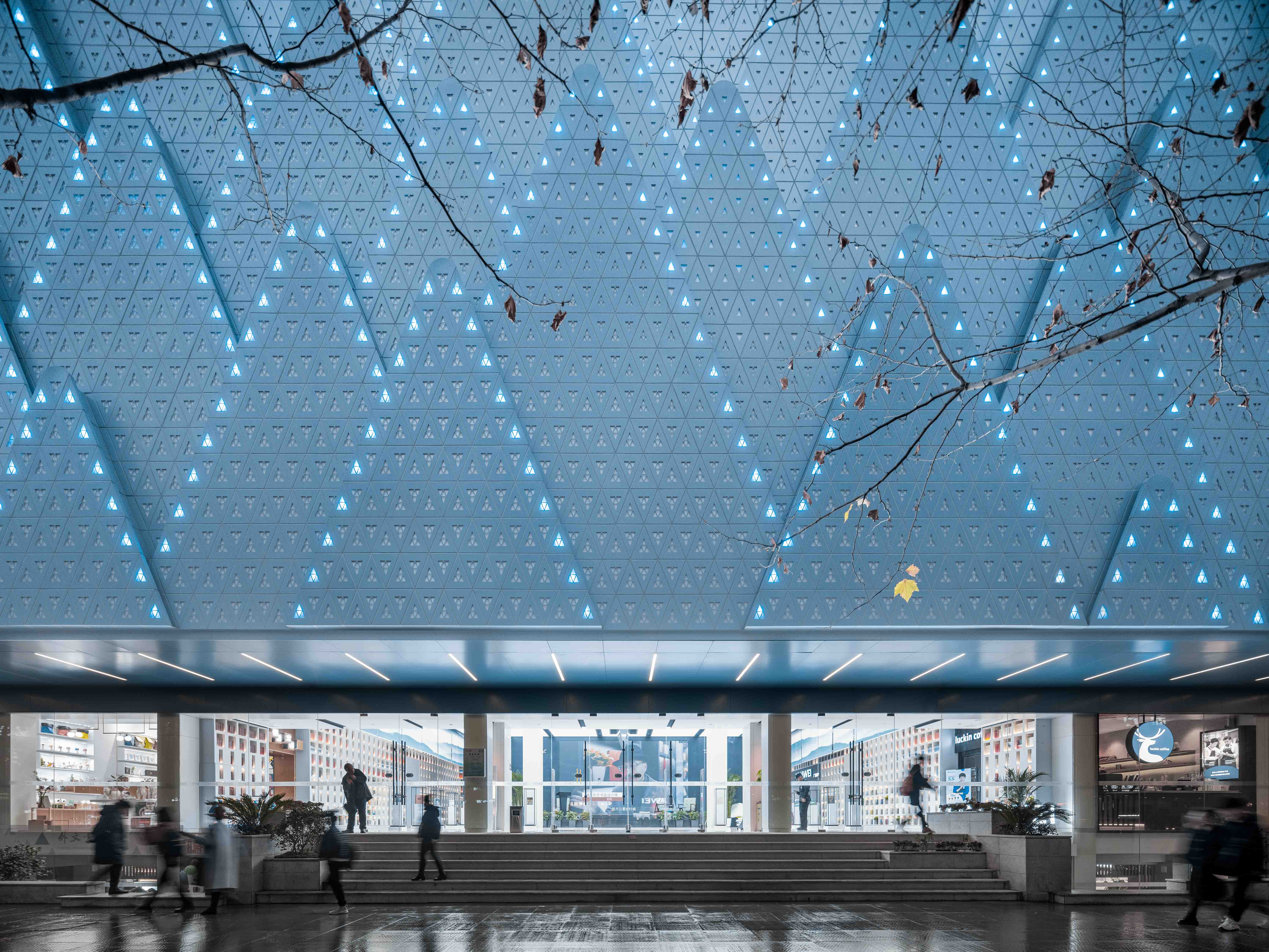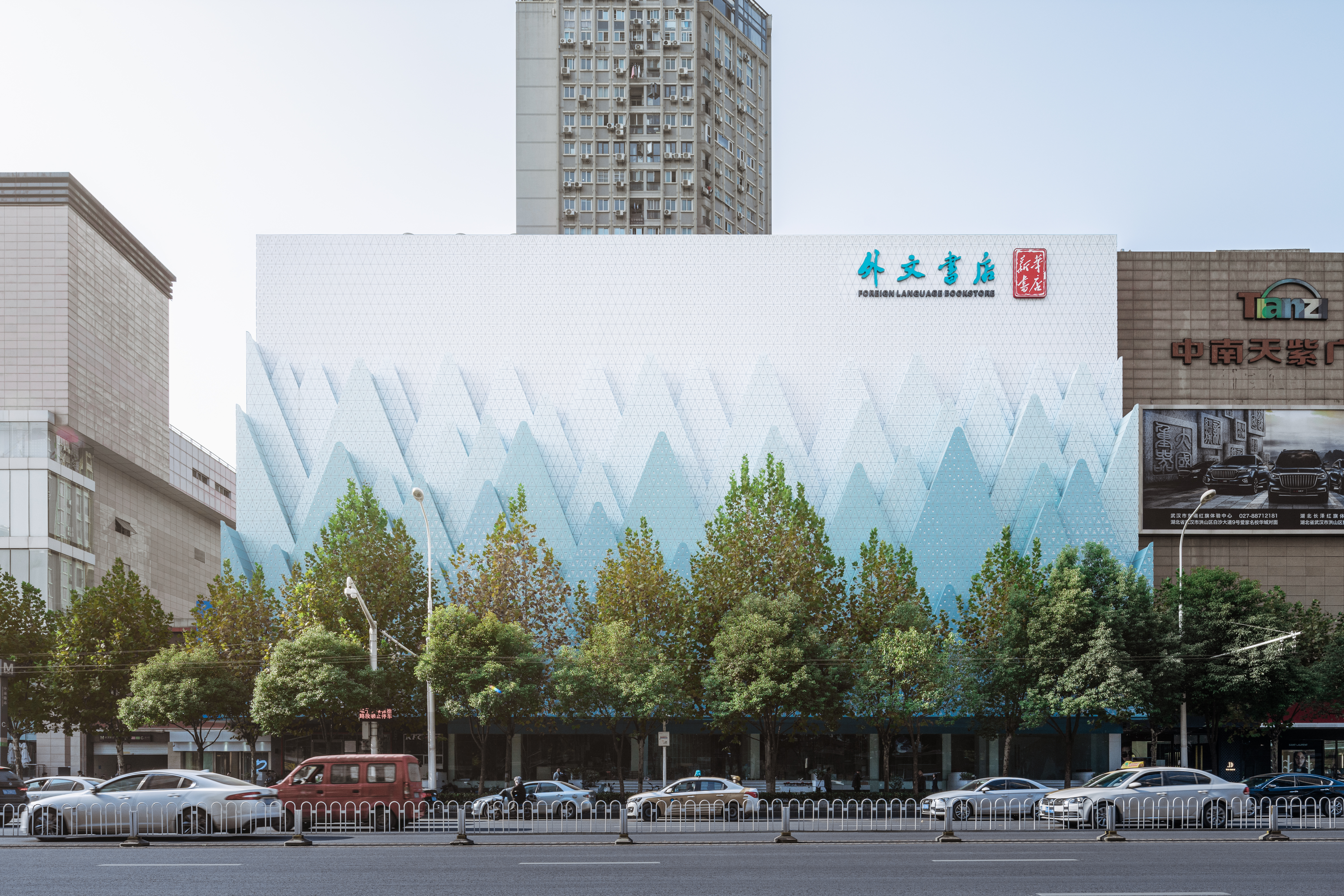 Traditional Chinese architecture is a collection of symbols, metaphors, prophecies, fables, legends and myths. “They are a lighthouse and a window to the outside world. They aid the understanding that there are mountains beyond the mountains, and they are the light of the city.” These words, which include symbols and metaphors, show that the Hubei Foreign Language Bookstore was once a cultural symbol. This inspired the symbolic structure that is the ‘Hubei Foreign Language Bookstore’ to redefine the cultural and historical relationship with the Wuhan people. The architect used perforated aluminum plates to create a green hillside atmosphere and to serve as a backdrop for the tree-lined streets, adding a new symbolism to the Hubei Foreign Language Bookstore. Abstract green hills open up to the increasingly crowded Zhongnan Road, connecting everyday life to a new world.