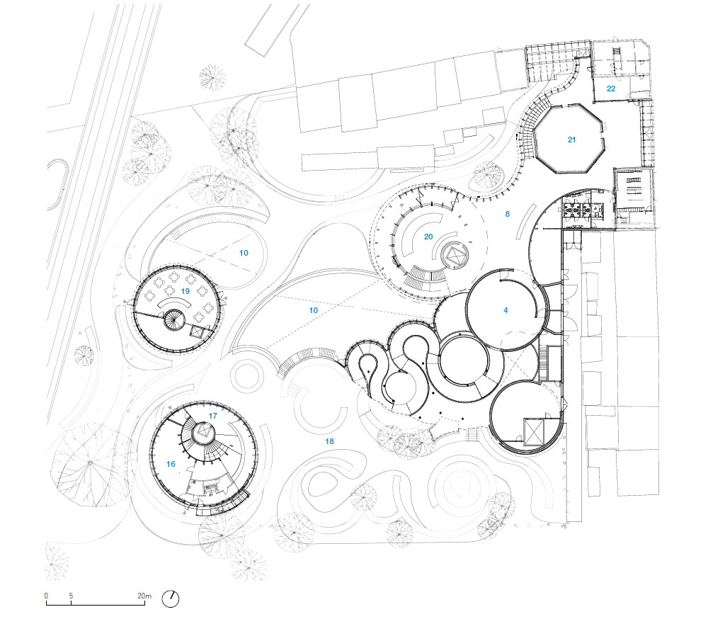 전시 공간은 지하에 계획되어 있다. 지하 전시 공간을 따라 만들어진 곡선형 미로는 지상에 아름다운 정원을 조성한다. 정원을 통해 물결치는 길은 박물관의 연장으로 경험해 볼 수 있다. 여기에서 건축적 형태는 줄어들고 나무와 잎사귀로 만든 "미로" 공간으로 방문객들의 발길을 이끈다. 지하 세계는 동화 세계에서 외부 세계로의 "관문"을 통하는 것처럼 지상의 "구멍"처럼 보이는 일련의 선큰 가든을 통해 지상의 정원과 연결된다. 자연의 요소가 건축 요소와 융합된 조경은 방문자들에게 독특한 경험을 제공한다. 건물 완공된 후에는 정원의 삶의 시작이다. 시간이 지나면서 정원은 성장하며, 방문객들과 지역 사회에게 자연과 계절의 느낌, 색상의 변화, 향기, 밀도, 투명도 및 풍경을 제공할 것이다.