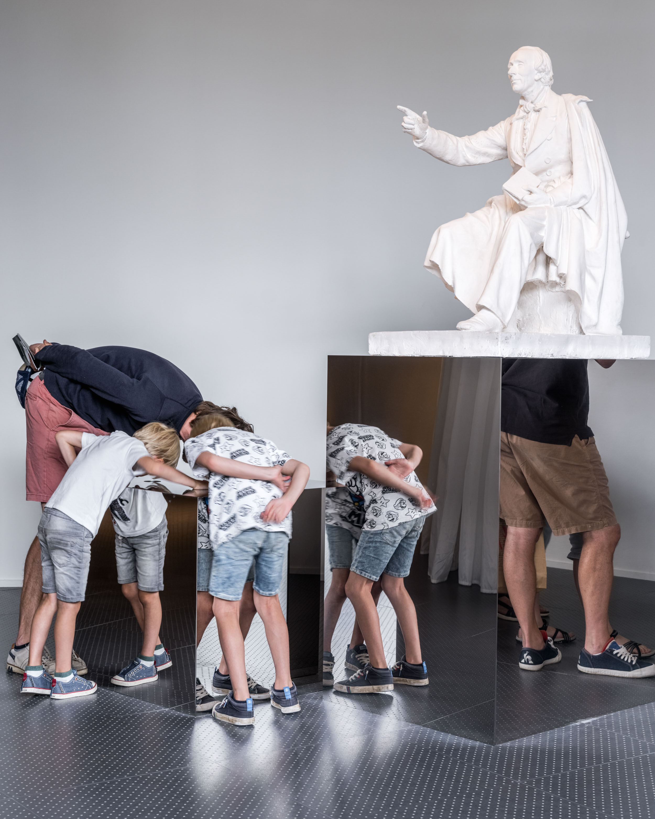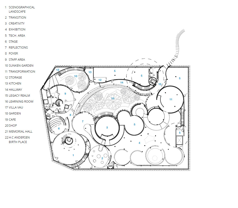 박물관 공간은 고리처럼 서로 접하는 일련의 원의 형태로 구성된다. 이 공간들은 비 계층적이고 중심축이 없는 방식으로 구성된다. 연속적인 곡선의 그린 월(Green Wall)은 지하 공간 구조를 확장하여 지상의 정원과 경로를 정의한다. 이는 전체 대지를 따라 지상과 지하, 올라간 곳과 내려간 곳을 오가며 물결치는 곡선을 그리며 움직인다. 이어진 공간의 연속에서 방문객들은 그린 월이 나타나고 사라지는 외부와 내부 사이에 있는 자신을 발견하게 된다. 박물관의 관람 여정은 공간 구성과 모호성을 통해 반영되며, 안데르센 작품의 요소인 대립되는 개념의 이중성과 경계의 해소가 공간 구성을 통해 표현된다.