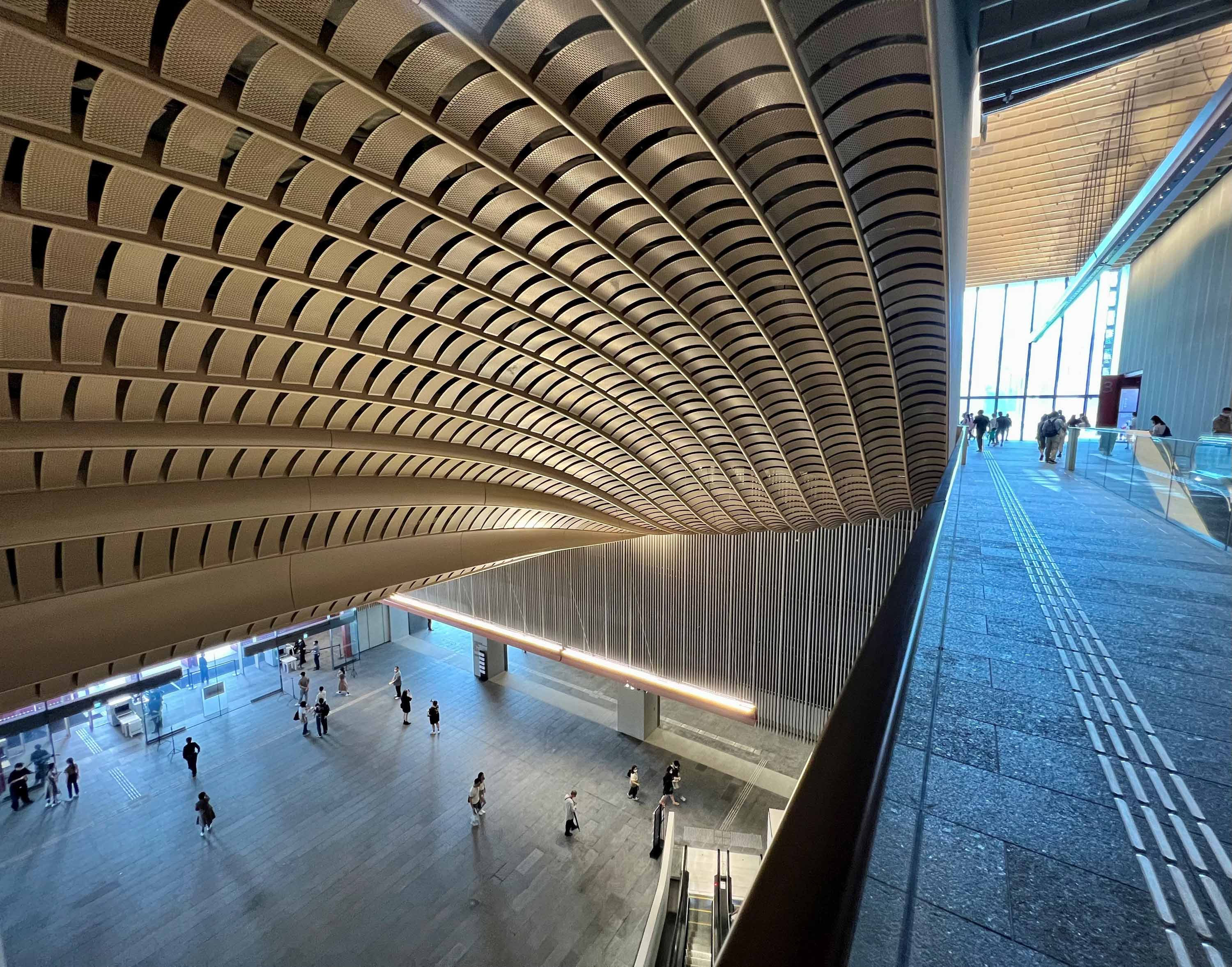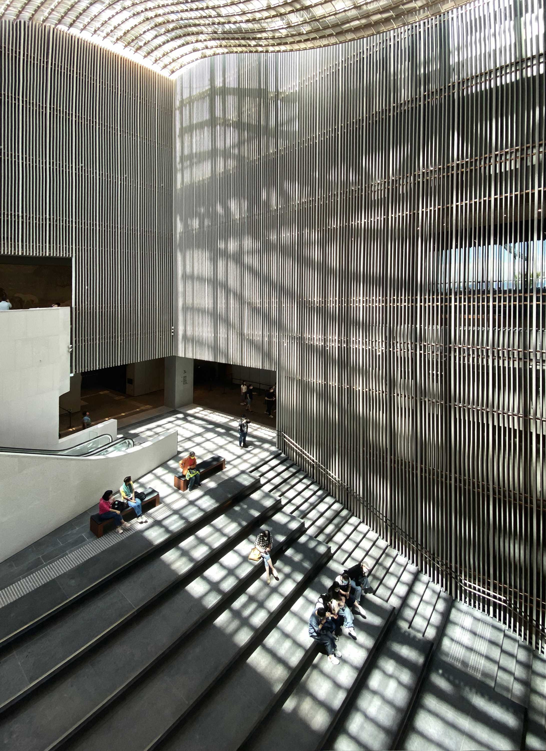 The South Atrium and outdoor viewing deck are rotated towards the south, offering visitors commanding views of Hong Kong’s iconic skyline and is set to become one of the museum’s most “Instagrammable” spots. Approaching the building, visitors pass through a grand elevated plaza that can host installations and performances of traditional ceremonies and dance. The Museum's entrance pavilion frames the plaza, recalling the gates of the Forbidden City. Beyond, guests enter a vast lobby where they can relax, chat, and learn about the exhibitions on view. An undulating bronze ceiling articulates the space, referencing the gold Beijing Palace roofs, unfolding to accompany a circulation spine that extends the full height of the building, enhancing vertical connectivity and bringing natural light streaming down from above. This ceiling acts as an orientating and sculptural element, adding accent to the space's refined palette of stone and polished concrete walls and floors. The spine winds through three levels of galleries that offer 7,800-square-metres of total exhibition space. The galleries will display a collection of objects from as early as the Jin dynasty (AD 226420) including painting, calligraphy, rare books, and decorative art including gold, bronze, and jade items. The Museum also includes a 400-seat lecture theatre that hosts public programs and film screenings, activity rooms, and a ground-floor restaurant and shop that create an active edge on the Art Park and harbourfront walkways.