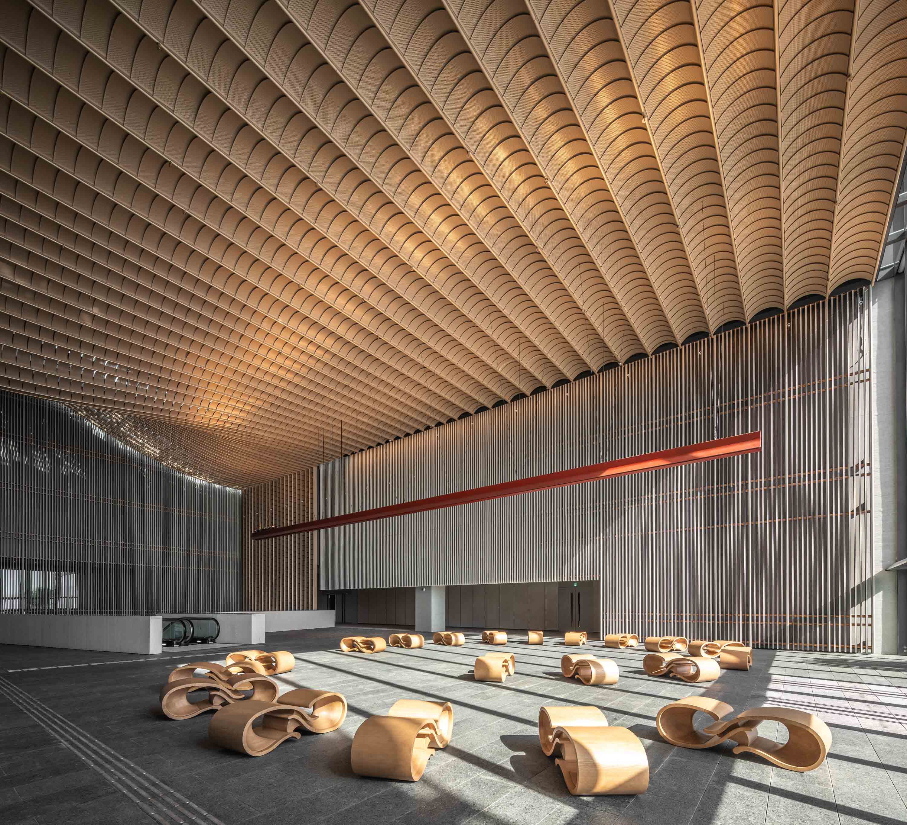 The South Atrium and outdoor viewing deck are rotated towards the south, offering visitors commanding views of Hong Kong’s iconic skyline and is set to become one of the museum’s most “Instagrammable” spots. Approaching the building, visitors pass through a grand elevated plaza that can host installations and performances of traditional ceremonies and dance. The Museum's entrance pavilion frames the plaza, recalling the gates of the Forbidden City. Beyond, guests enter a vast lobby where they can relax, chat, and learn about the exhibitions on view. An undulating bronze ceiling articulates the space, referencing the gold Beijing Palace roofs, unfolding to accompany a circulation spine that extends the full height of the building, enhancing vertical connectivity and bringing natural light streaming down from above. This ceiling acts as an orientating and sculptural element, adding accent to the space's refined palette of stone and polished concrete walls and floors. The spine winds through three levels of galleries that offer 7,800-square-metres of total exhibition space. The galleries will display a collection of objects from as early as the Jin dynasty (AD 226420) including painting, calligraphy, rare books, and decorative art including gold, bronze, and jade items. The Museum also includes a 400-seat lecture theatre that hosts public programs and film screenings, activity rooms, and a ground-floor restaurant and shop that create an active edge on the Art Park and harbourfront walkways.