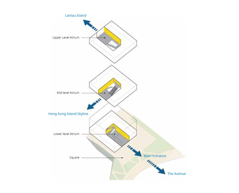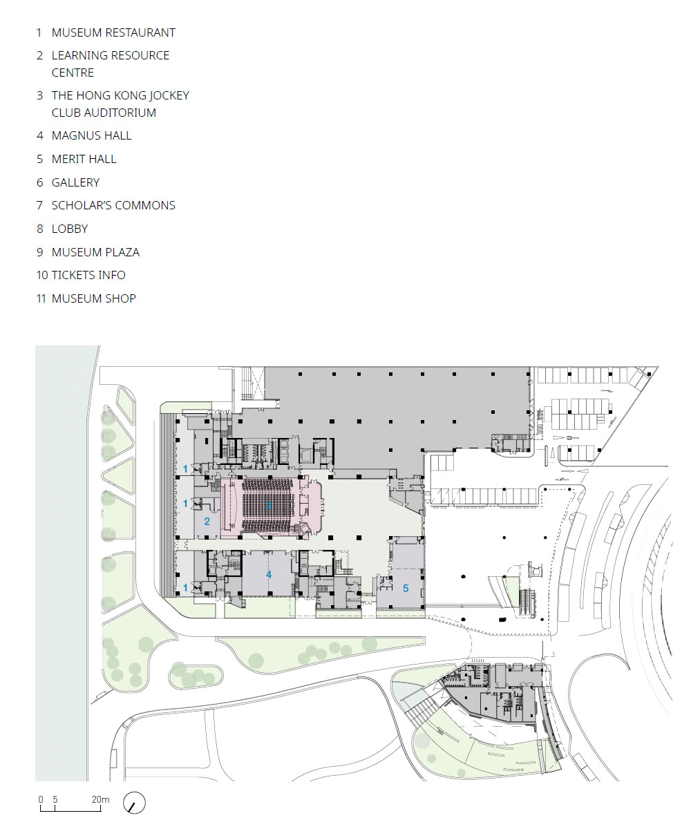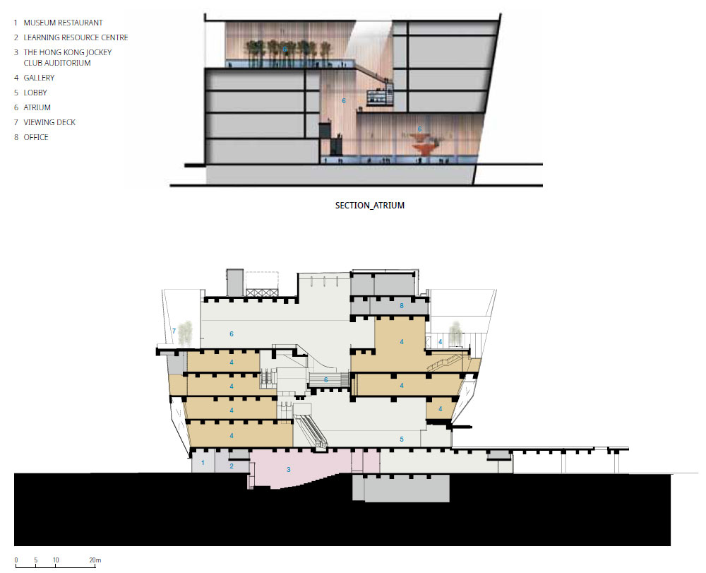 남쪽 아트리움과 야외 전망대는 남쪽을 향하고 있어 방문자에게 홍콩의 상징적인 스카이라인 전망을 제공하며, 박물관에서 가장 "인스타그램에 올릴 만한" 장소 중 하나가 될 예정이다. 방문자는 건물에 접근하며 설치물 및 전통 의식과 춤 공연을 주최할 수 있는 웅장한 고가 광장을 통과한다. 박물관 입구의 파빌리온은 자금성의 문을 연상시키는 광장을 구성하고 있다. 그 너머에서 방문객은 휴식을 취하고 대화를 나누며 전시 중인 전시회에 대해 알아볼 수 있는 넓은 로비로 입장한다. 자금성의 금색 지붕을 참조한 물결 모양의 청동 천장이 펼쳐지면서 건물의 전체 높이에 달하는 동선 중추와 함께 공간을 명확하게 정의하며, 수직 연결성을 강화하는 동시에 위에서 아래로 흐르는 자연광을 건물 내로 끌어들인다. 이 천장은 공간의 정제된 석재 팔레트, 세련된 콘크리트 벽과 바닥에 포인트를 더하면서 공간의 방향을 잡아주고 조각적인 요소로 작용한다. 동선 중추는 총 7,800제곱미터의 전시 공간을 제공하는 3개 층의 갤러리를 통과한다. 갤러리는 회화, 서예, 희귀 서적, 금, 청동, 옥 제품을 포함한 장식 예술 등 진 왕조(기원후 226-420) 초기부터 수집된 물건을 전시할 예정이다. 박물관에는 또한 공공 프로그램과 영화 상영을 주최할 수 있는 400석 규모의 강의실, 활동실, 예술 공원과 항구 앞 산책로에 활기를 불어넣는 1층 레스토랑과 상점이 있다.