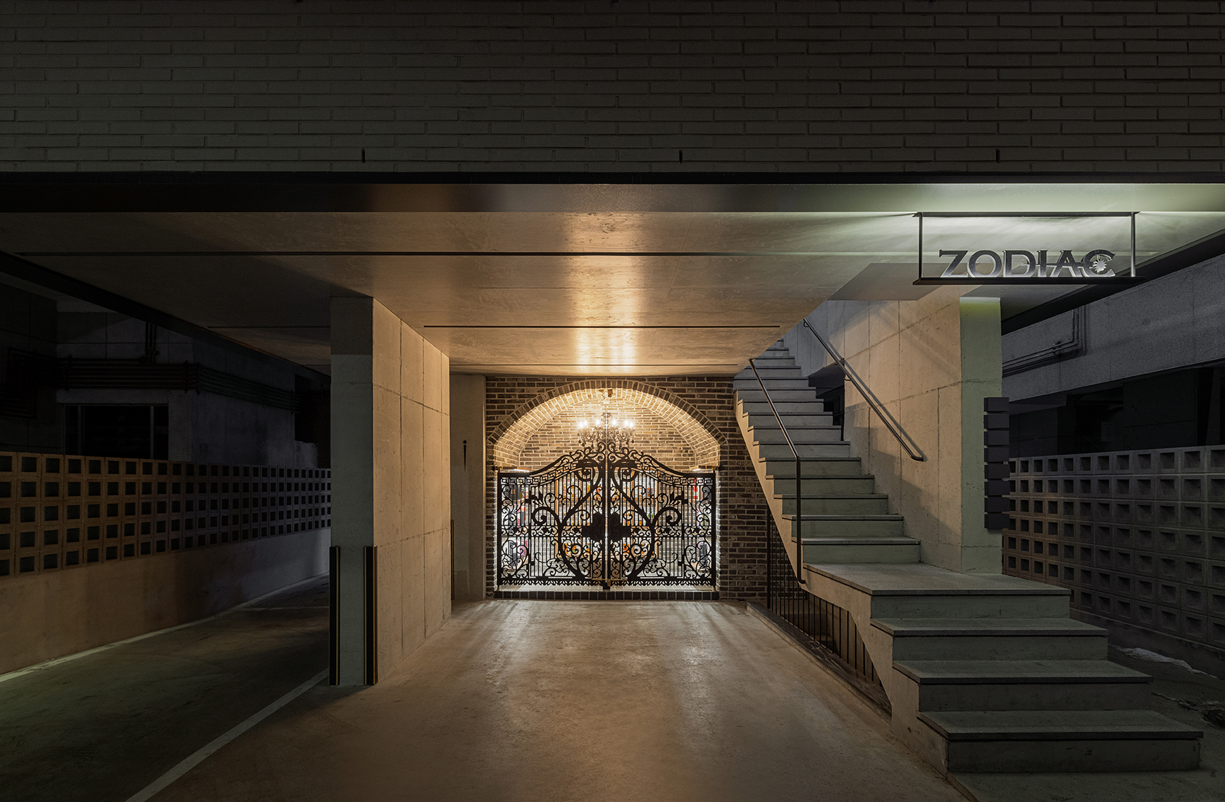 3층으로 올라가는 계단은  카펫을 고정할 수 있는 디테일을 통해 클래식함을 더했다. 계단 위 쪽엔 시그니처 로고 오브제를 통해 포토존을 형성하여, 고객들이 시각적으로 관심이 갈수 있도록 디자인하였다. 3층 공간으로 올라가게 되면, 별자리를 연상케 하는 트라이앵글 구조의 미러 천장이 다양한 각도로 보이며, 사이사이 조명들로 하여금 색다름을 선사한다. 기존 창문 이었던 곳을 바리솔 벽체로 하여, 여러가지 SCENE들을 연출하고 임팩트 있는 공간으로 보이게 했으며, 그 위 로고 부착을 통해 브랜드의 IDENTITY를 부각했다. 좁은 공간의 3층을 붙박이 의자를 통해 기능적으로 배치 했으며, 소파와 테이블은 2층과 다르게 현대적으로 구성했다. MINIBAR는 유리 블럭과 세라믹 타일을 사용해 포인트요소로 연출했다. 조디악은 공간의 장면마다 다양한 경험을 제공하기도 하지만, 조명 시스템을 이용해 낮,밤 계절별 다양한 조명을 연출하여 풍부한 공간의 재미를 느낄 수 있다. 공간을 층별로 다르게 경험하고 몰입하며 상상할 수 있는 장면을 구성했으며, 본질에 집중 할 수 있는 감각적 경험을 제공하려 한다.