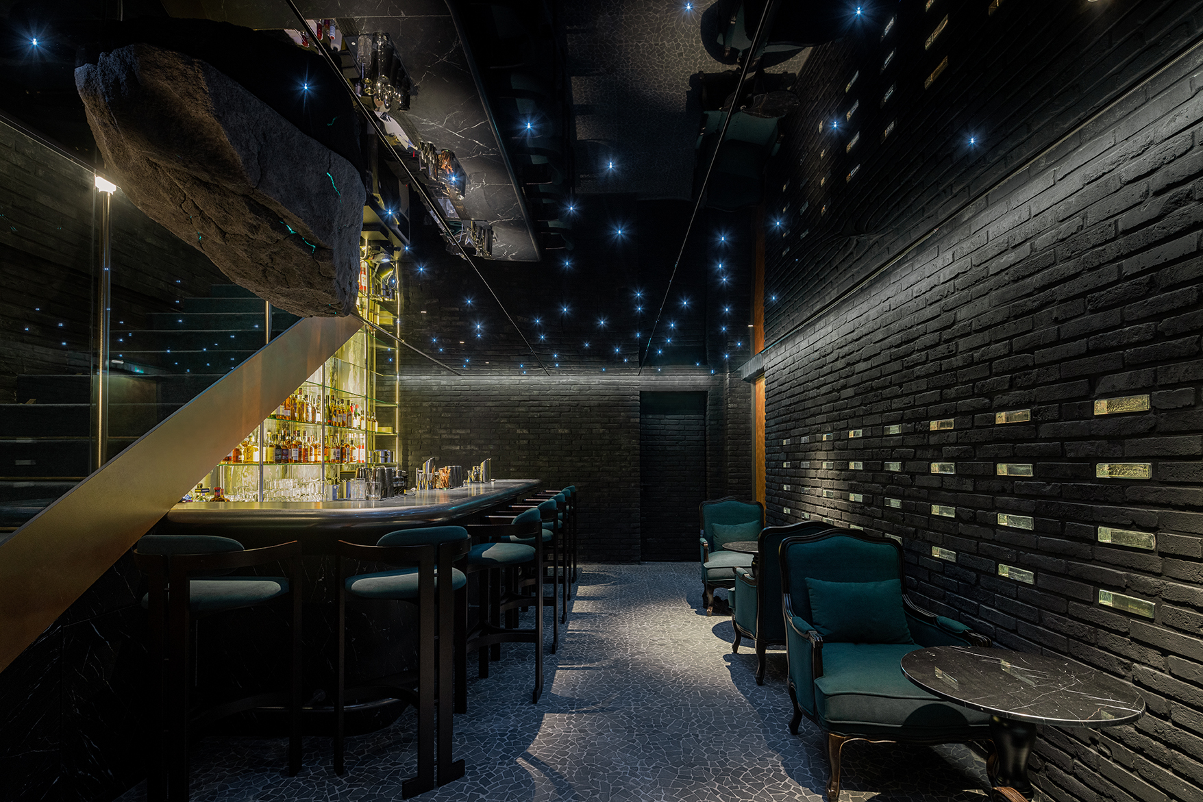 When you go up to the second floor, the interior wall has a VINTAGE feeling of dark bricks, and the ceiling can feel like the Milky Way is floating through optical fiber lighting. The point elements and functions were solved by designing a cylindrical structure by applying the inconvenience of customers sitting on the BAR to the design stage in a long BAR configuration. The back of the BAR is designed to blend with whiskey bottles using BIG SLAB ceramic tiles. The two-story furniture was organized into classic furniture, reminiscent of a scene of salon culture that aristocrats enjoyed like a hideout.
