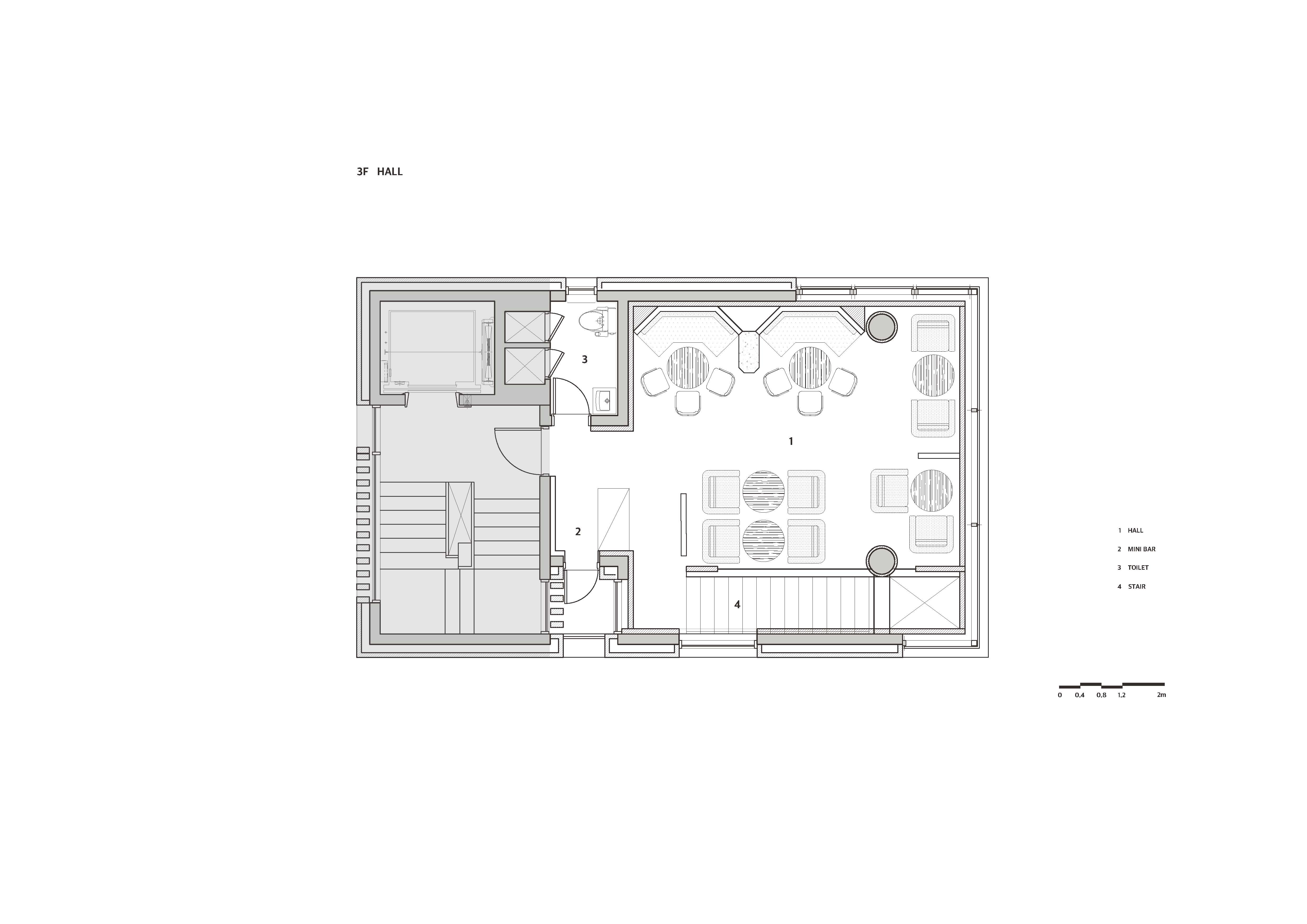 When you go up to the second floor, the interior wall has a VINTAGE feeling of dark bricks, and the ceiling can feel like the Milky Way is floating through optical fiber lighting. The point elements and functions were solved by designing a cylindrical structure by applying the inconvenience of customers sitting on the BAR to the design stage in a long BAR configuration. The back of the BAR is designed to blend with whiskey bottles using BIG SLAB ceramic tiles. The two-story furniture was organized into classic furniture, reminiscent of a scene of salon culture that aristocrats enjoyed like a hideout.