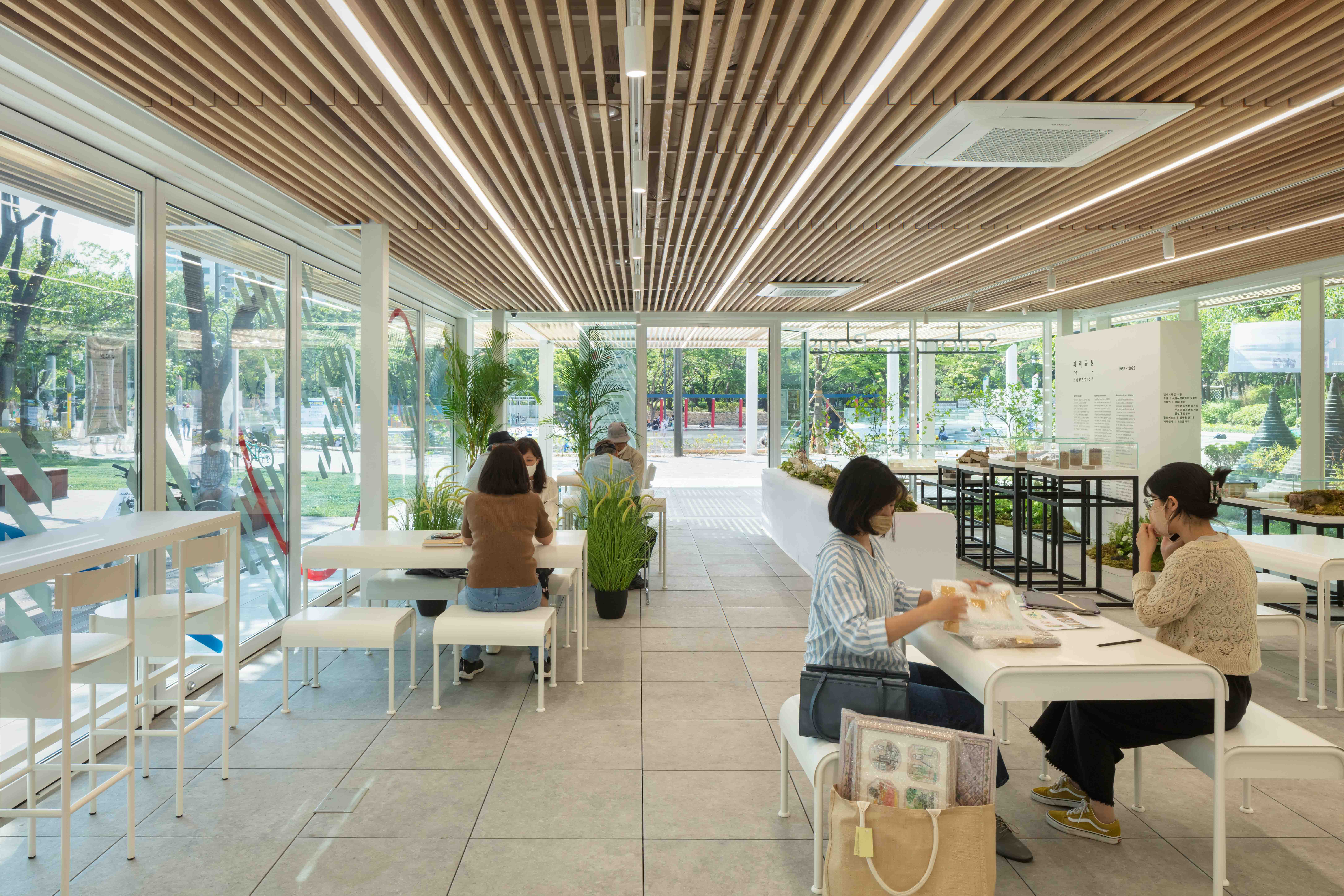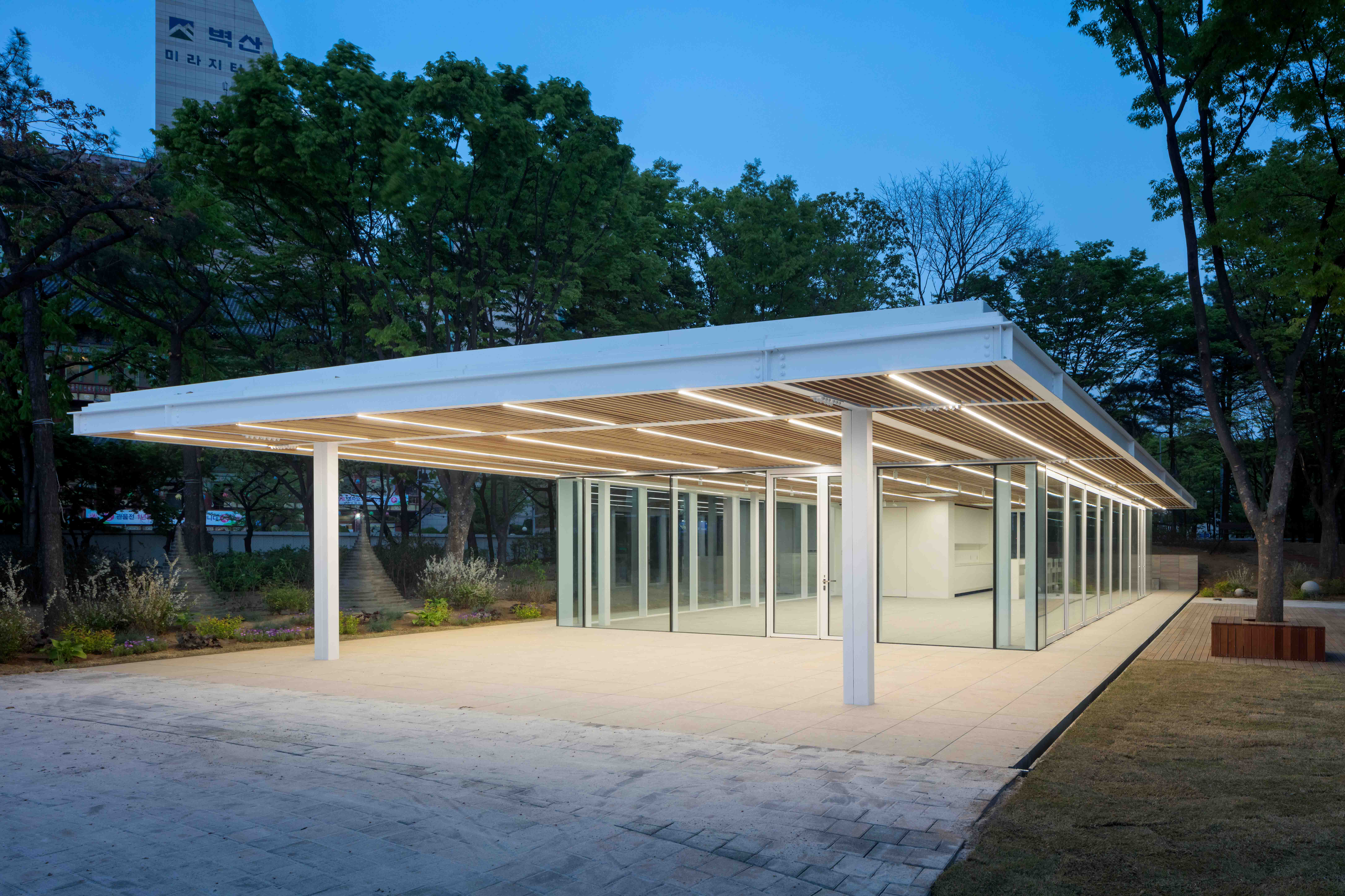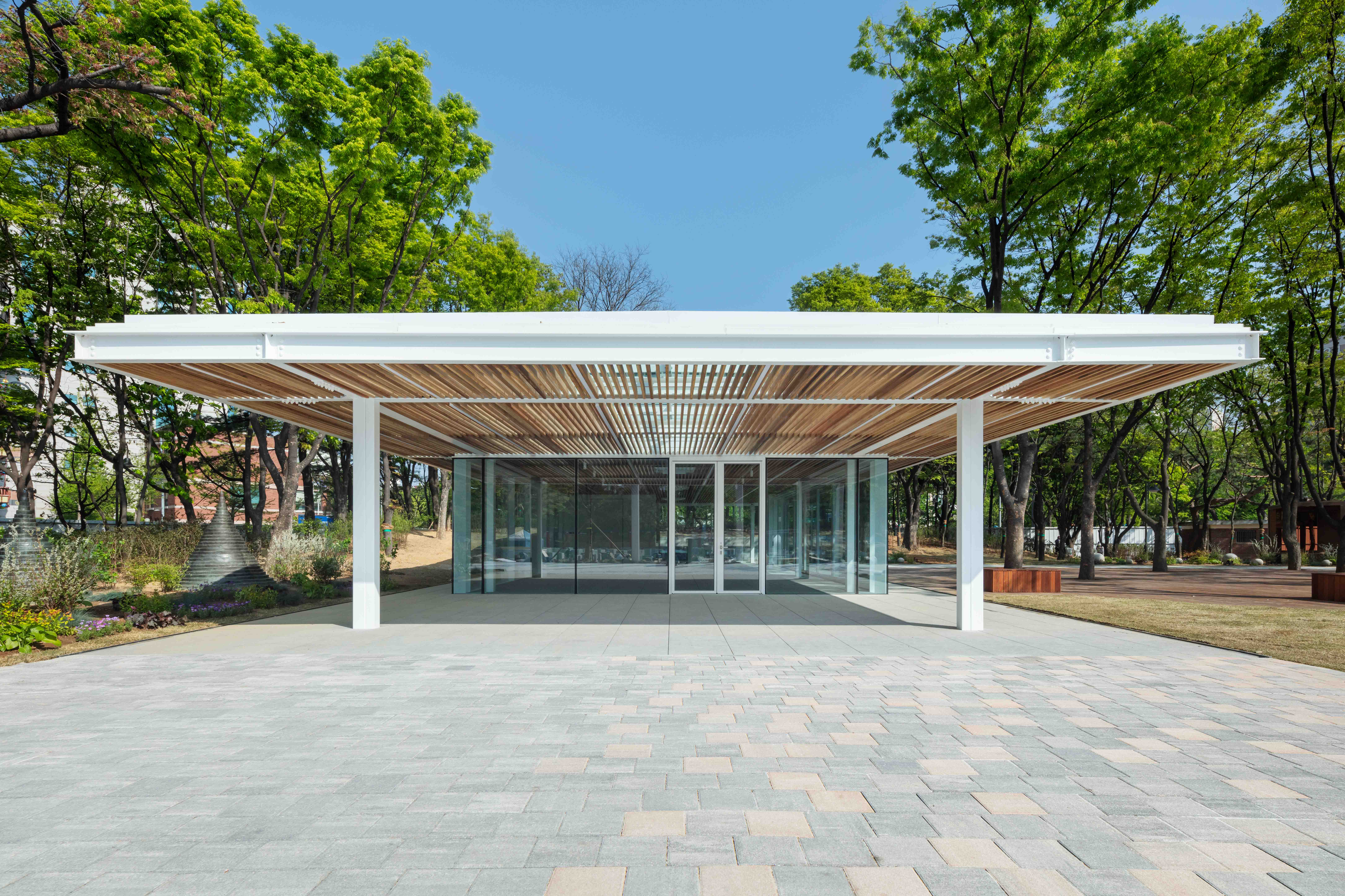 The spacious canopy of "Salon de Paris," situated in a tranquil park, captures one's attention. This place, designed as a community space for residents, exists as part of the park and harmonizes with its surroundings. When examining Paris Park, you'll notice that it is configured with Korean areas to the north and French areas to the south along the central axis, and the overall shape is composed of overlapping circular forms symbolizing the Taeguk, based on that axis. The canopy naturally fits into the existing flow of the axis, providing a light structure and transparent glass finish to break down the boundaries between the interior and exterior, enabling communication under the canopy. In "Salon de Paris" the natural landscape of Paris Park and various park events come together. This transparent place, harmonizing with the park, can be used as a rest area for residents and serves as a versatile community space that can be used for purposes such as cafes, exhibitions, and education.