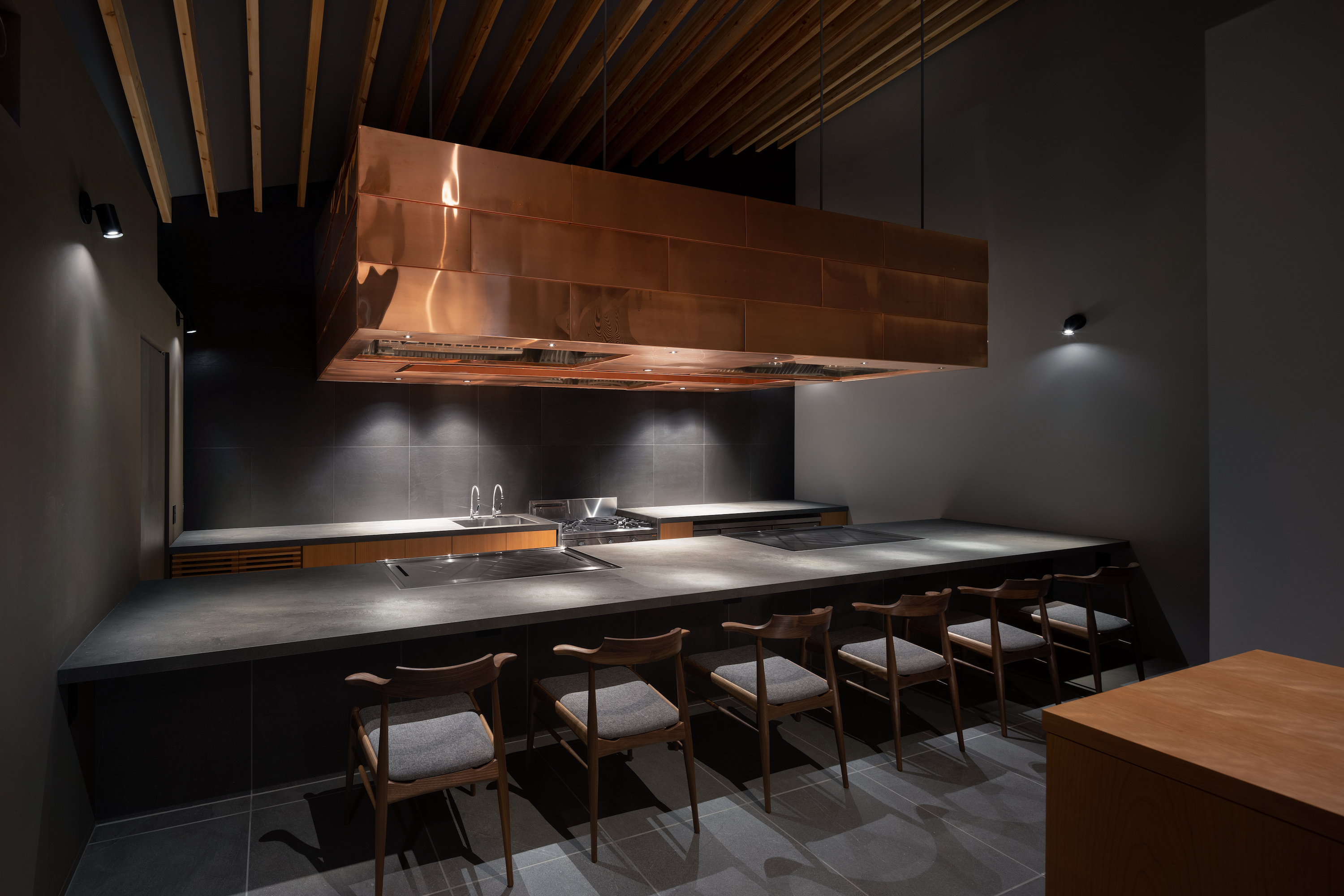 To secure daylight within the Japanese regulations, the building height was set at 10 meters or less, and the design blended harmoniously with the surroundings. As a result, the shape that emerged is reminiscent of a traditional pitched-roof house when viewed from all sides, with the four corners of the rectangular upper portion appearing lower. The eave height is aligned in a straight line with neighboring houses to minimize interference. The roof is designed in a gambrel shape, featuring a double-curved form. The curved surface of the HP shell was installed by twisting 20mm thick wooden components on a 60mm thick skeleton. The curved panels are secured with nails, and the entire roof is designed as an overhanging joint roof with a curved shape. There are large openings in the roof above the terrace, making it an isolated space from the surrounding environment and a free outdoor area exclusively for tenants' use.