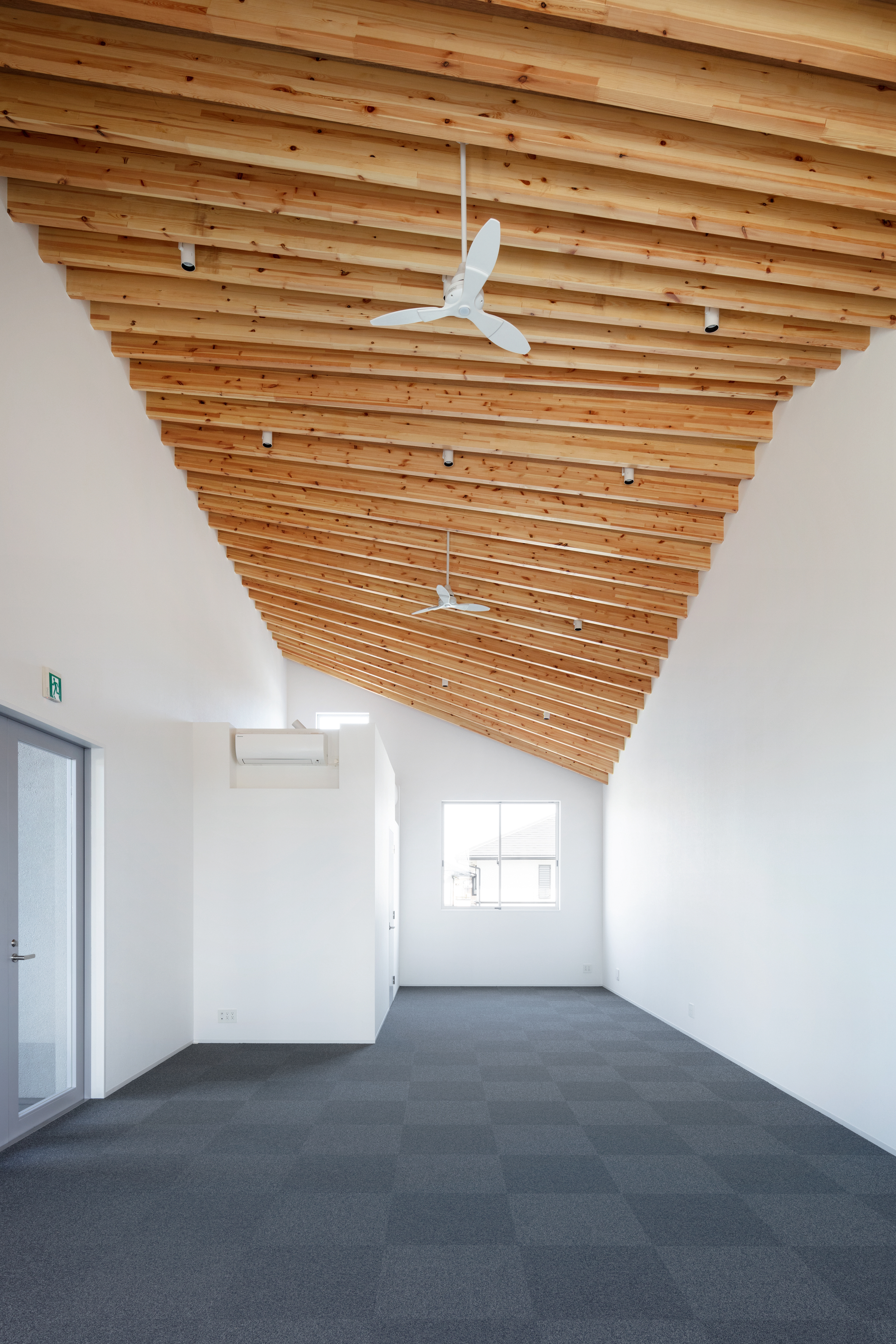 일본 규제 내에서 일조권을 확보하기 위해서 건물 높이를 10m 이하로 설정하고, 주변과 어우러지는 형태를 모색할 결과 정육면체 상부의 네 꼭짓점이 낮아진 사방에서 바라봤을 때 박공지붕집처럼 보이는 형태가 만들어졌다. 처마의 높이는 이웃집들과 일직선으로 맞춰져 이웃집들에 대한 간섭을 최소화 한다. 지붕은 사면을 박공지붕집 모양으로 만들어 쌍곡선 포물선의 모양을 가지고 있다. HP 쉘의 곡면은 60mm 두께의 서까래에 20mm 두께의 목재 부재가 비틀어 설치되어 있다. 곡면 합판은 못으로 고정되었으며, 전체 지붕은 입식 이음새 지붕은 구부린 형태다. 테라스 위의 지붕에도 넓은 개구부가 있으며, 테라스는 주변 환경과 격리된 공간이자 세입자만만 사용할 수 있는 자유로운 야외 공간이다.