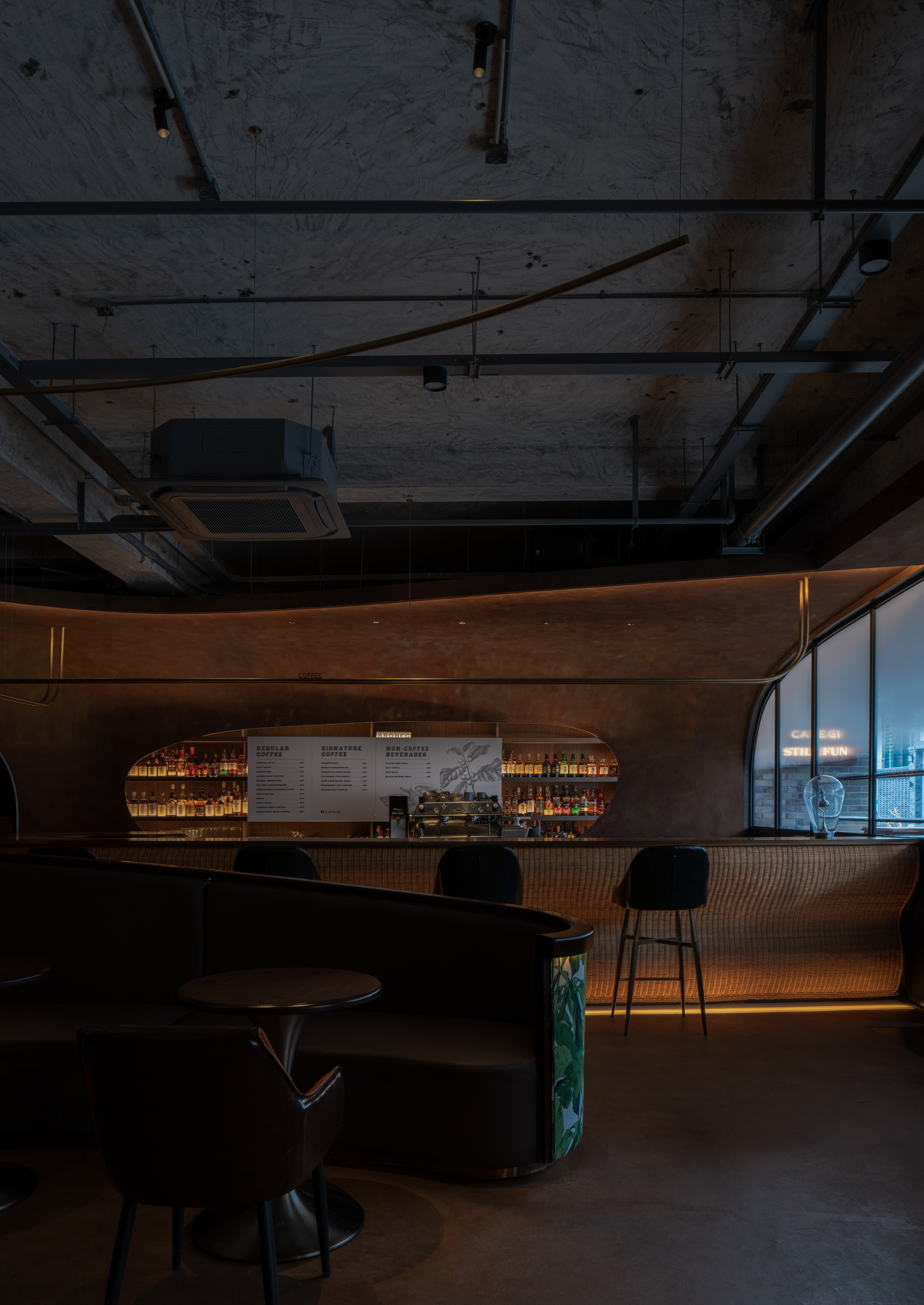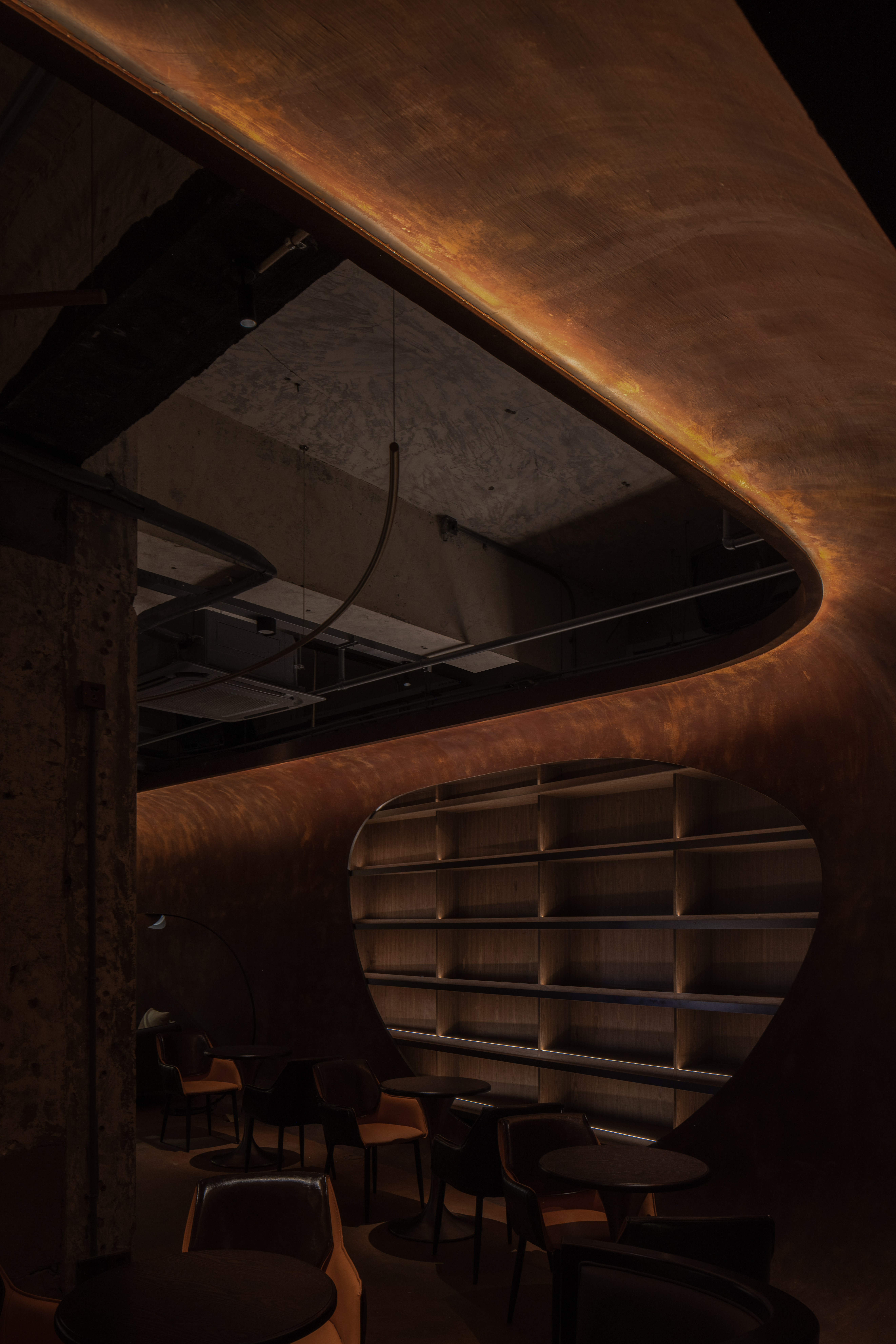 STILLFUN Cafe is located at the midpoint between Chunyang Market and the tourist area in the Chunyang Market Street. The surroundings blend the old streets with buildings made of reinforced concrete, displaying the vitality of the new and old. The shell shape is the most prominent feature of this building. Within the square-shaped space, the shell-like structure creates various areas. The gap between the square and shell spaces is used as a wine cabinet, and the greenish metal material offers visitors a unique environment. Serving as an urban cave, STILLFUN Cafe is a comfortable and cozy retreat for city residents.