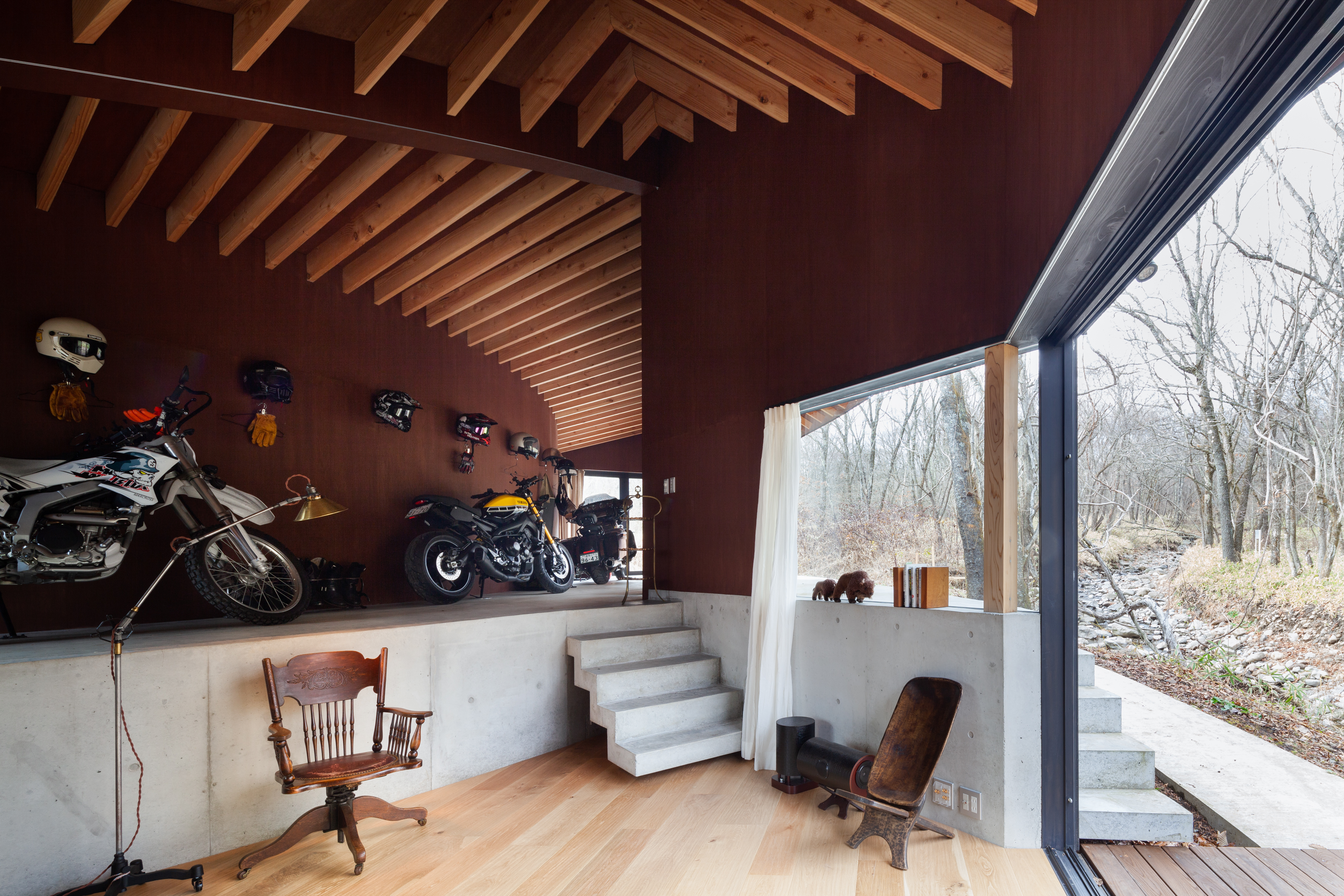 Nagano, where the house has built is a region with a height of 1,380m and renowned for its severe cold of winter. However, it’s surrounded by non-destroyed nature and it’s the place where a hut of Jomon period (about 14,000-1,000 BC) was found nearby. Through design, it has been intended to make the resident closer to the nature in his daily life. The main living space was planned about 900mm below the ground for warmth. The elevation design was designed to reflect the curve of the roof, and the shape of the curve reminds us of whales and dinosaurs. This house, which follows the shape of a primitive house, is the result of conformity rather than resistance to nature in the process of planning the necessary space.
