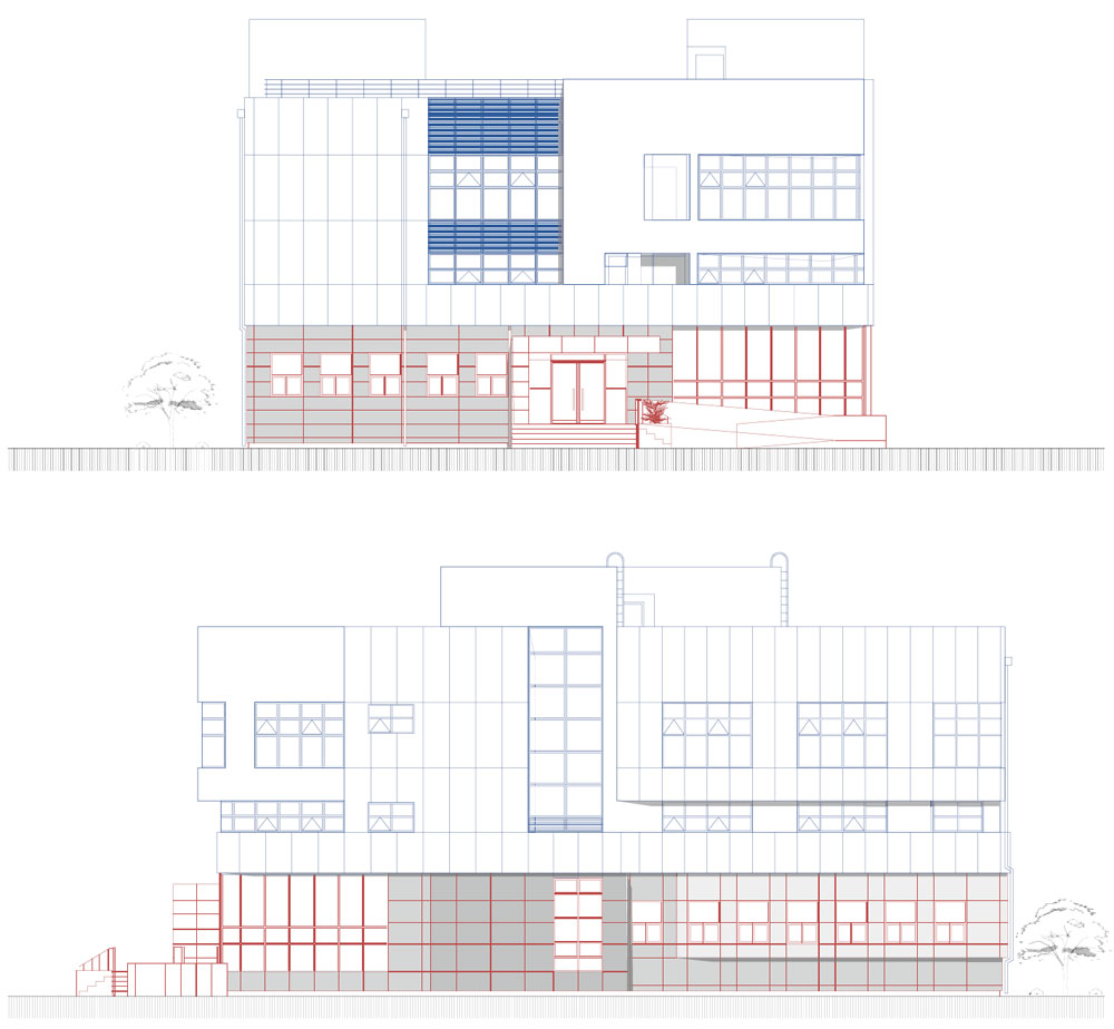 주 외장재는 알루미늄패널과 외단열시스템(스터코마감)으로 기존건축물이 가진 물성과 동일하고 상반되는 재료를 선택했다. 알루미늄패널의 띠를 중심으로 기존건축물과 증축계획 부분이 입면 상 나뉘게 되고, 인지성과 상징성을 갖게 되는 증축부의 볼륨은 스터코마감을 통하여 집합과 다양성의 개념을 질감으로 표현했다. 또한 재료가 가지고 있는 물성을 활용하여 입면에 깊이감을 만들고, 기존건축물의 입면에서 나타나는 깊이감을 새롭게 해석함으로 인해 도시 속 새로운 켜를 만들어가도록 계획했다.