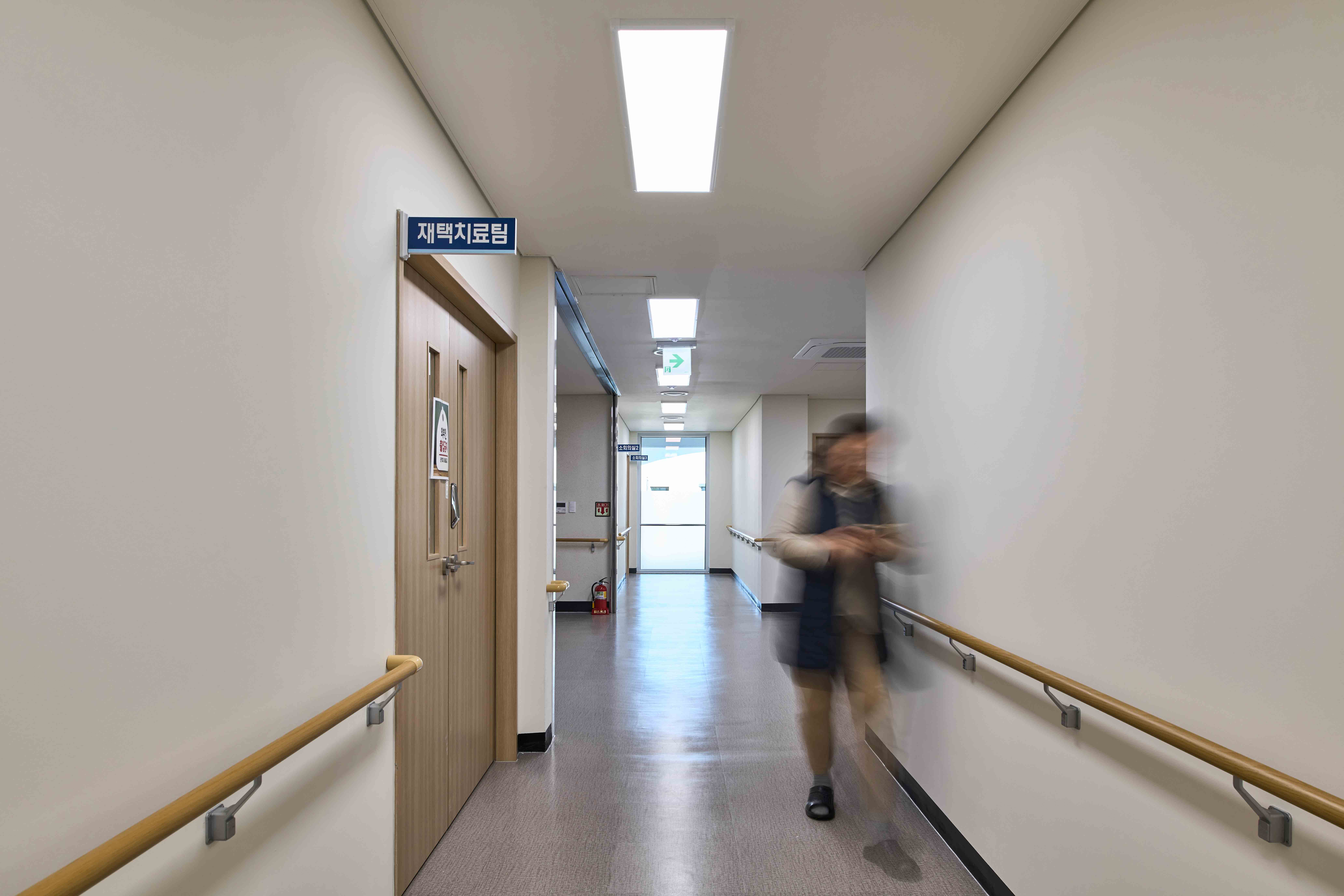 기존건축물의 건폐율과 정북 방향 일조권에 의한 이격거리 등으로 인해 수평 상에서 기존건축물의 영역을 벗어나기는 어려웠다. 1층의 치매안심센터는 증축 후에도 같은 기능을 유지할 계획이어서 증축의 영역에 포함되지 않는다. 새로 설치된 엘리베이터와 기존 2개의 계단을 이용하여 2, 3층 증축의 공간으로 진입할 수 있다. 수직증축 영역인 2, 3층은 공용공간을