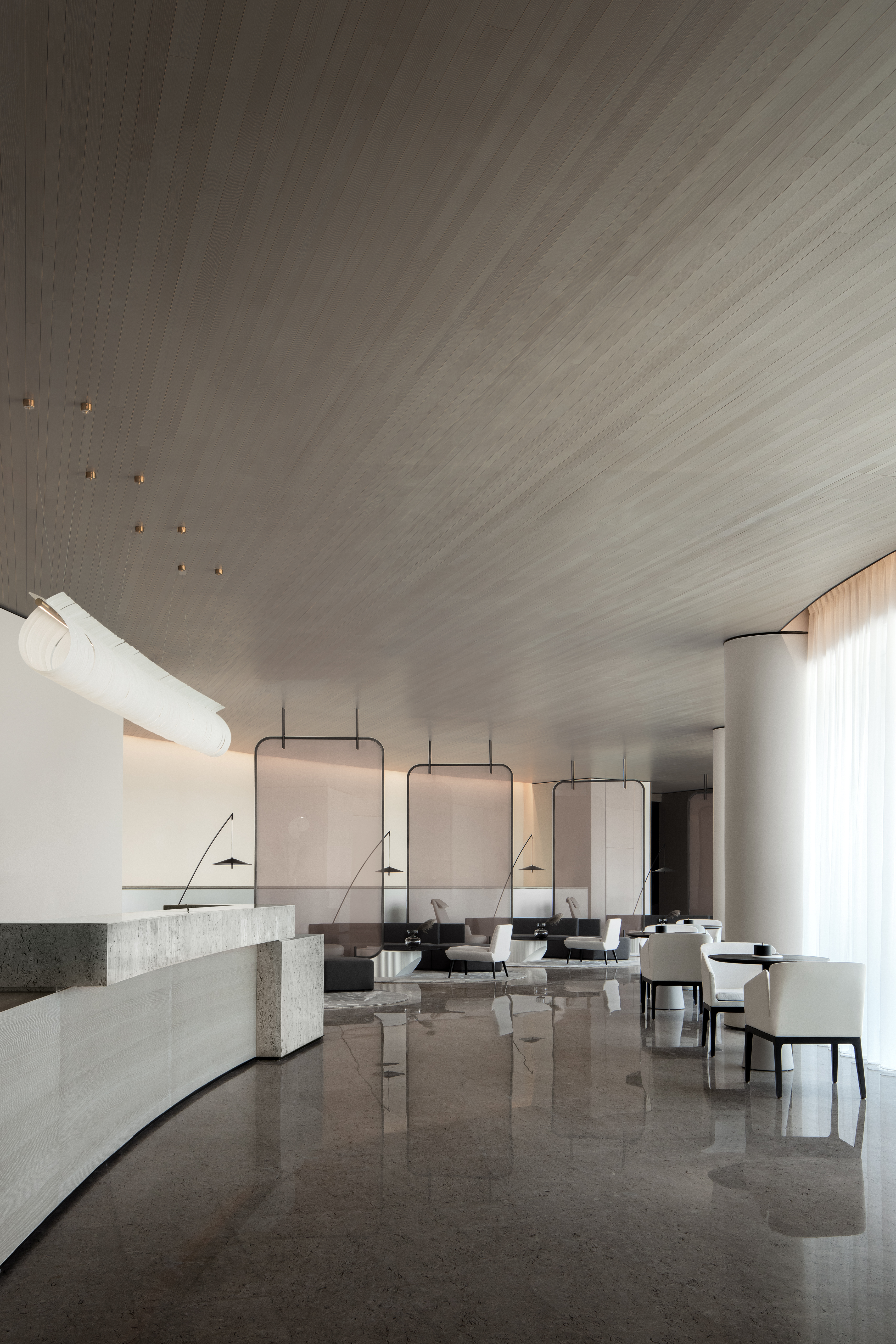Living next to a lake gives people the opportunity to live a peaceful life near nature. The sales center overlooking the lake is a housing sales office in Xi'an, China. Located between densely populated and outlying areas, it shows the perfect place to provide an ideal lifestyle for urban residents. The design is an autumn lake landscape, and the overall tone of the space is set, and various installations expressed in stones, trees, and reeds decorate the space. In addition, the interaction between light and shadow emphasizes the contrast of different spatial scenes. The columns arranged in an orderly manner paint a shadow of a mysterious and fascinating atmosphere in the hallway according to changes in natural light. Contemporary art works that combine nature, ideas, and creativity are displayed throughout the space, providing a pleasant and comfortable environment while satisfying aesthetic needs.
