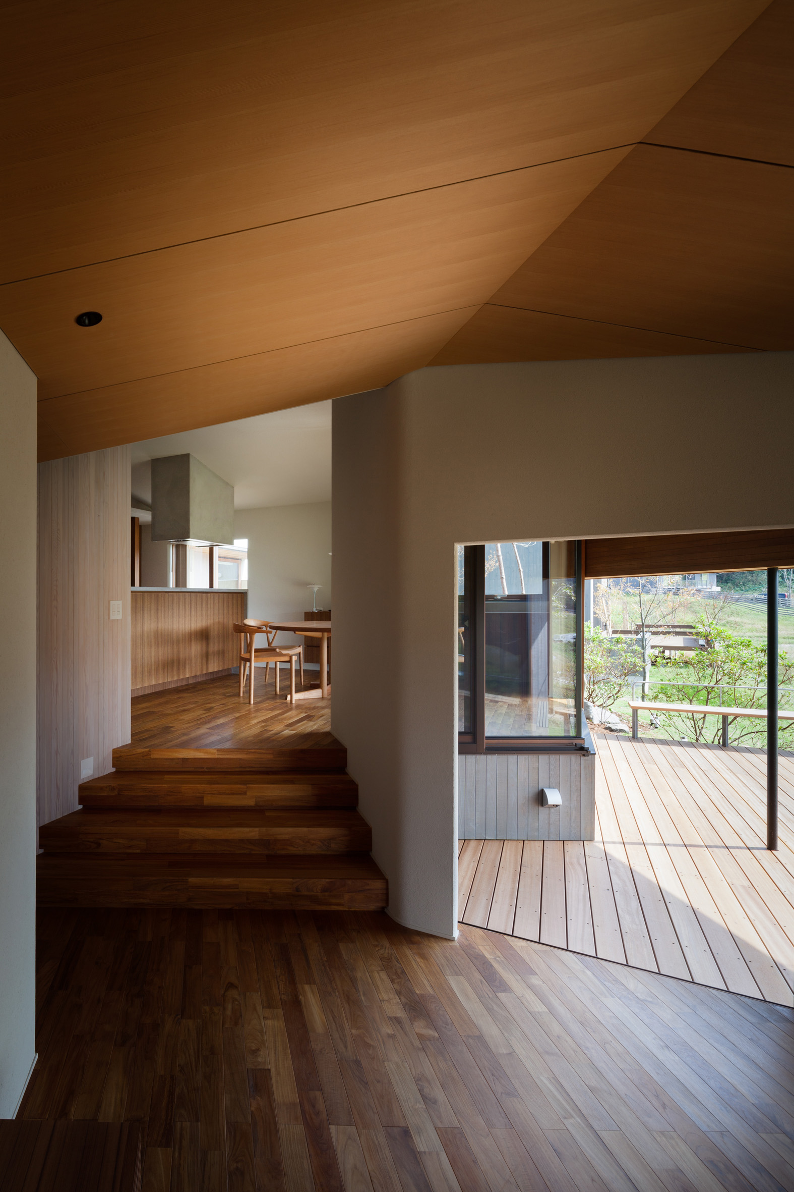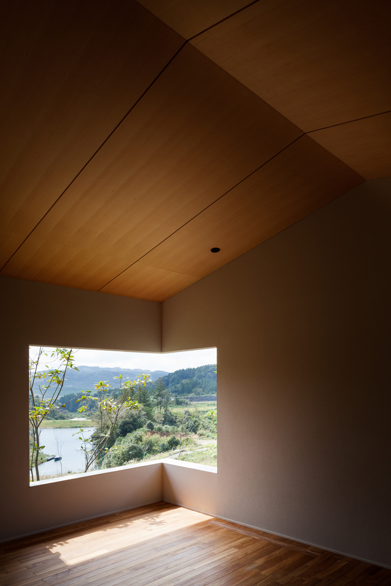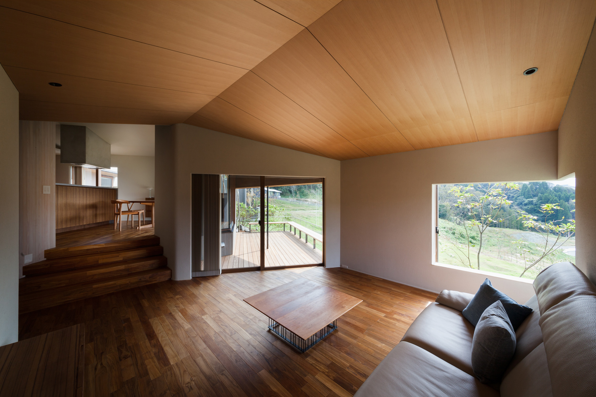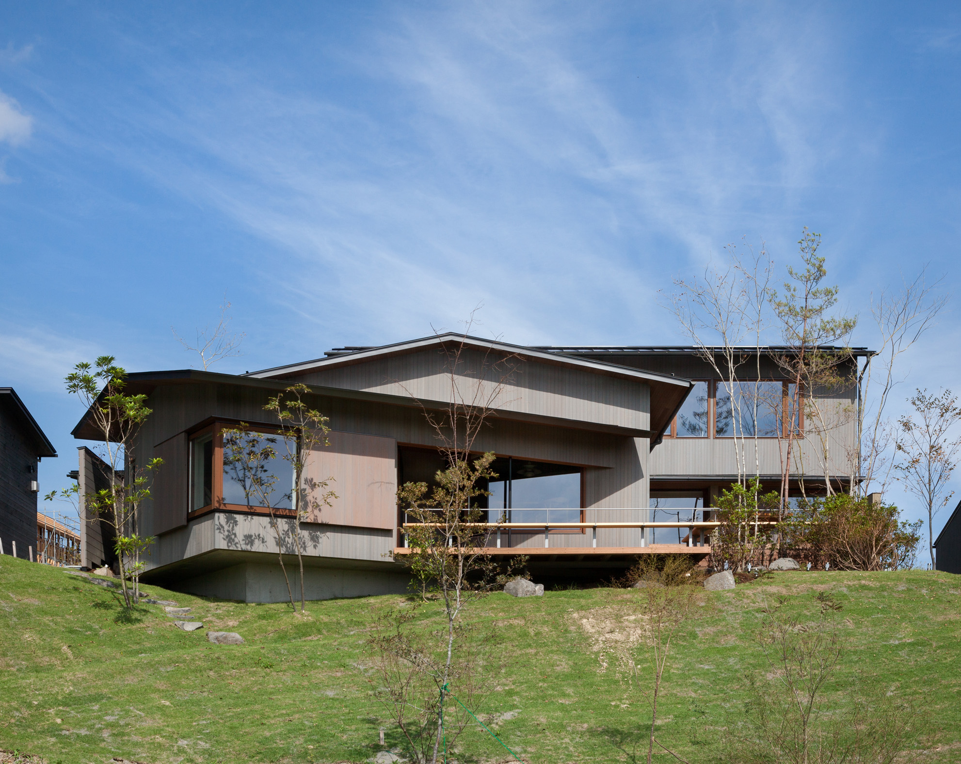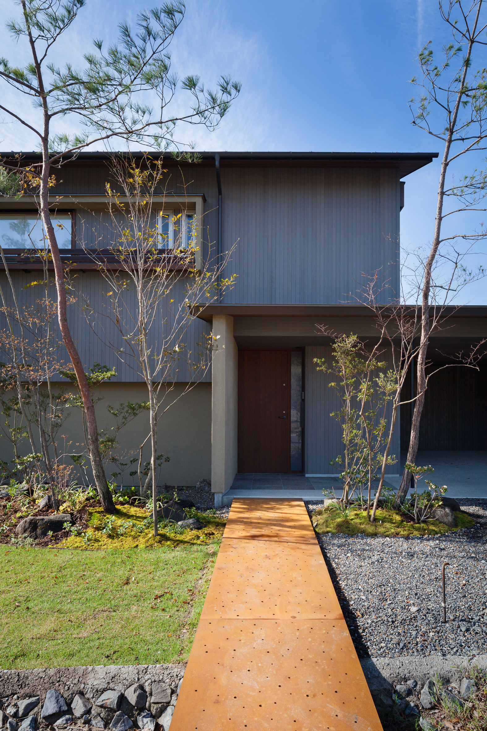 A weekend house was built in a residential area adjacent to the Muirhead Golf fields. This house, located on the hillside, is located at the southern end of the slope where you can see an artificial lake. The house has four sloping roofs designed to fit the shape of the house well with the forest and the ridges around the forest. The architect tried to spatialize the living landscape by changing the perspective of the residents inside and outside. The garden of this house is not only surrounded by walls, but also composed of deep eaves, artificial waterfall walls, and segmented landscapes. While exploring the site, the architect found a place to create a comfortable living space in the middle of the slope, and since the surrounding houses stretch south, the house was designed in the form of "Ganko (standing shoulder to shoulder like flying wild geese)" along the slope to avoid the eyes of neighbors.