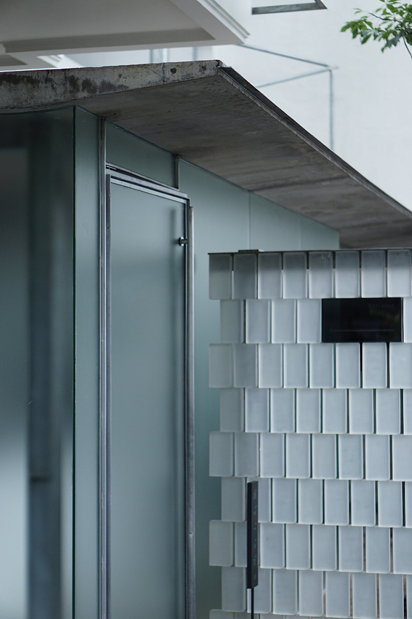 Exploring different modes of transparency to achieve rontgen-like character, glass brick and acid glass were used as the main materials. The glass bricks arranged as a floating box demarcating the front yard effectively as a space for the cafe, forming a pseudo-boundary. Acid glass were used as the skin of the pavilion and covers elements from the existing house, adding an extra layer to the existing house without making significant changes. The two materials juxtaposed with both the structural and natural elements, resulting in a broad spectrum of visual transparency we wanted to achieve. The structure uses exposed H-beam steel in hot-dip galvanized finish. The bare structural elements along with the blurred transparency of the glass brick and the acid glass meant to resemble the skin and bone quality of the rontgen visual.