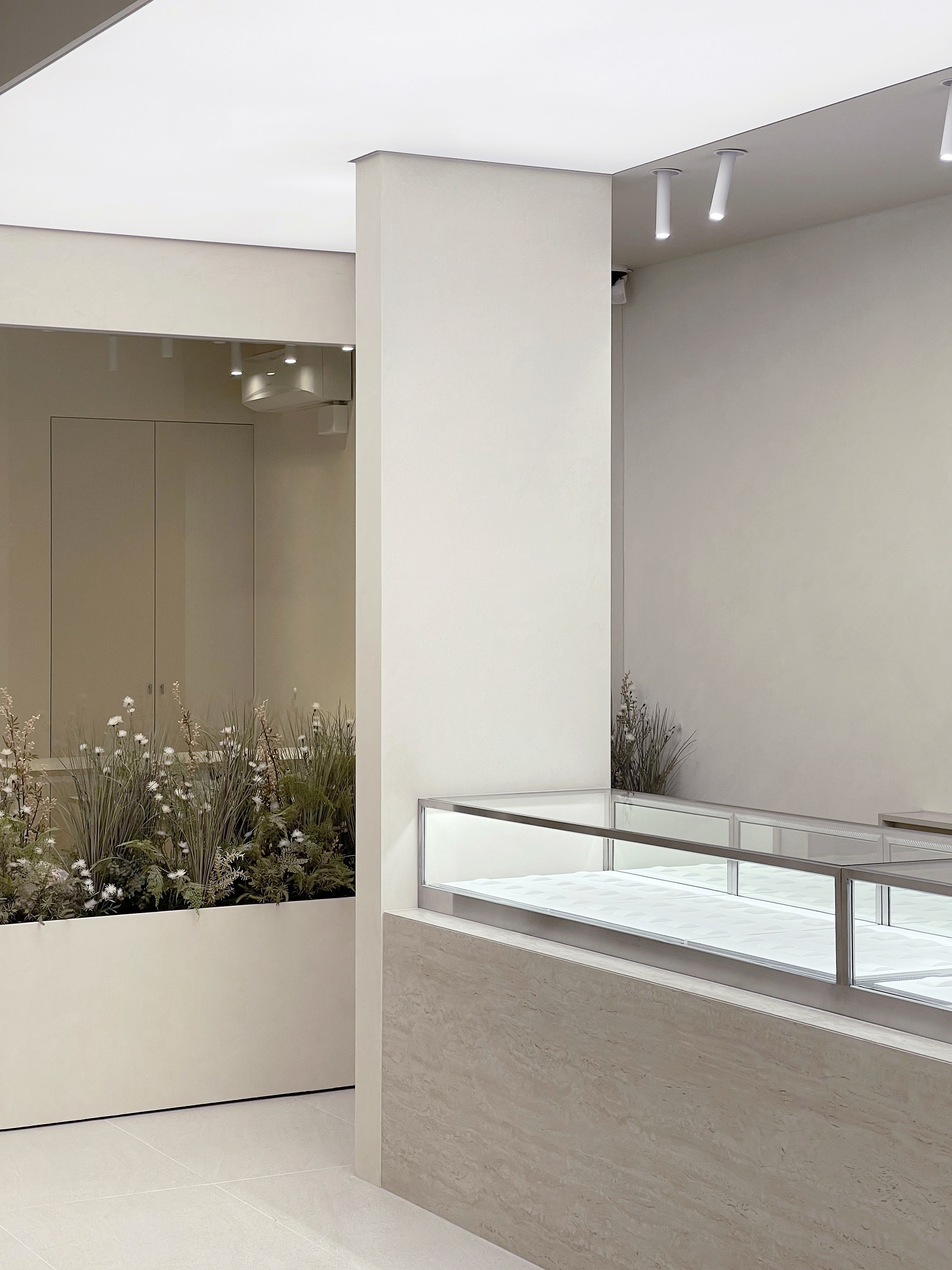 계약이 이루어지는 프라이빗 룸과 쇼룸 사이에는 자연의 요소를 두어 두 공간에서 작은 풍경을 향유하도록 했습니다. 한쪽 벽면에는 수납, 탕비, 파우더 공간을 미니멀한 무드를 해치지 않도록 매입하여 기능적으로 활용하였습니다. 라운지와 쇼케이스를 배경으로 하는 두 개의 포토존은 고객이 공간을 다각적으로 경험할 수 있도록 합니다. 이러한 계획을 통해 기능에 충실하되 기대감을 조성하는 파사드와 집중도 있는 구매 경험을 선사하는 공간을 만들고자 했습니다.