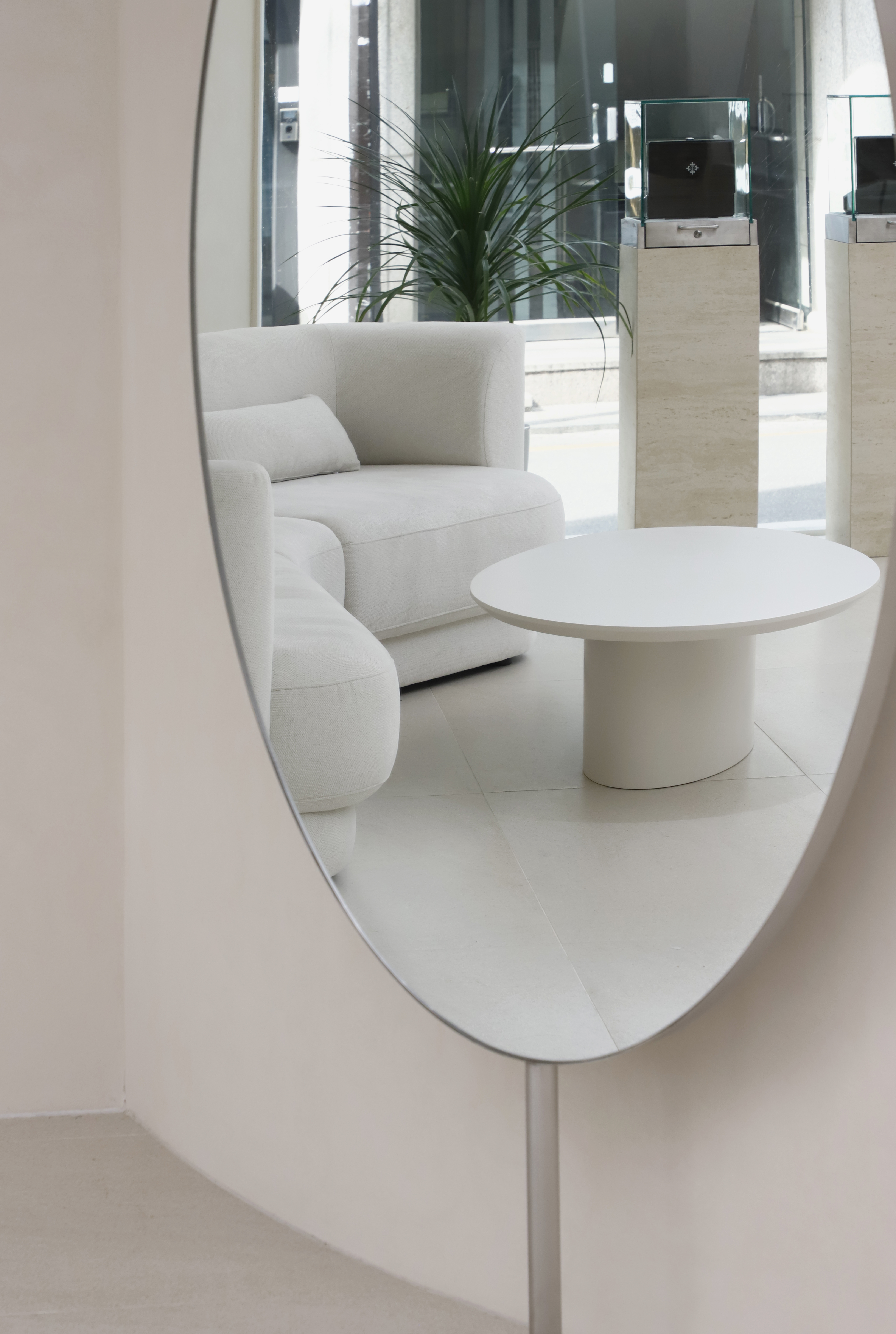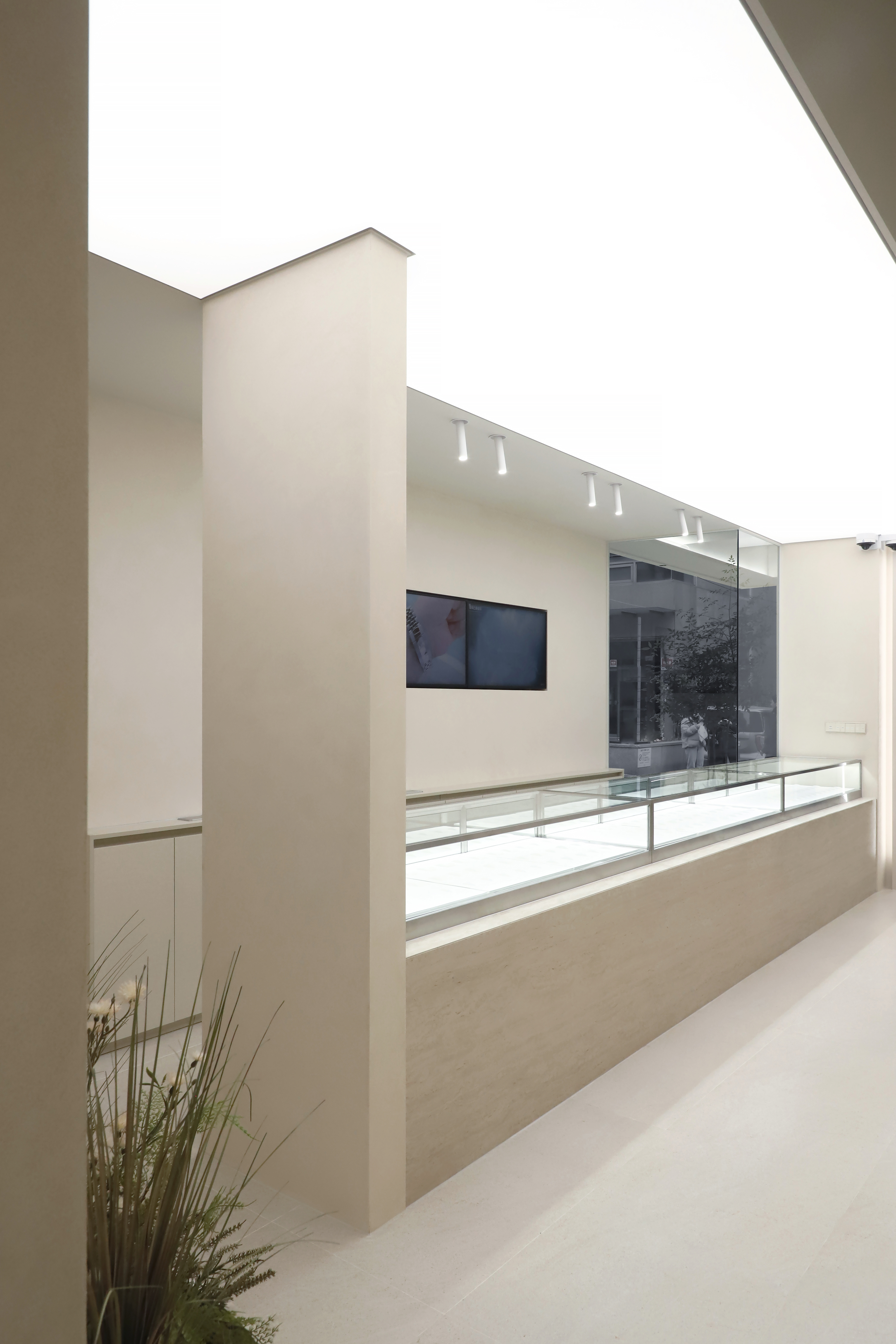 계약이 이루어지는 프라이빗 룸과 쇼룸 사이에는 자연의 요소를 두어 두 공간에서 작은 풍경을 향유하도록 했습니다. 한쪽 벽면에는 수납, 탕비, 파우더 공간을 미니멀한 무드를 해치지 않도록 매입하여 기능적으로 활용하였습니다. 라운지와 쇼케이스를 배경으로 하는 두 개의 포토존은 고객이 공간을 다각적으로 경험할 수 있도록 합니다. 이러한 계획을 통해 기능에 충실하되 기대감을 조성하는 파사드와 집중도 있는 구매 경험을 선사하는 공간을 만들고자 했습니다.