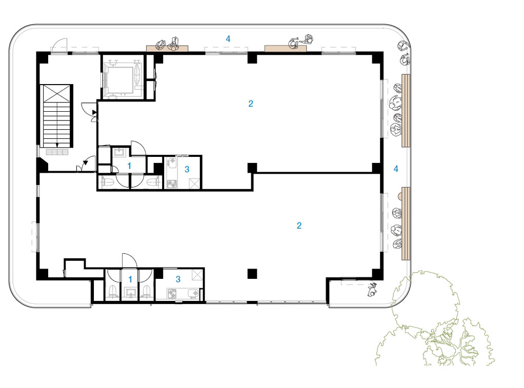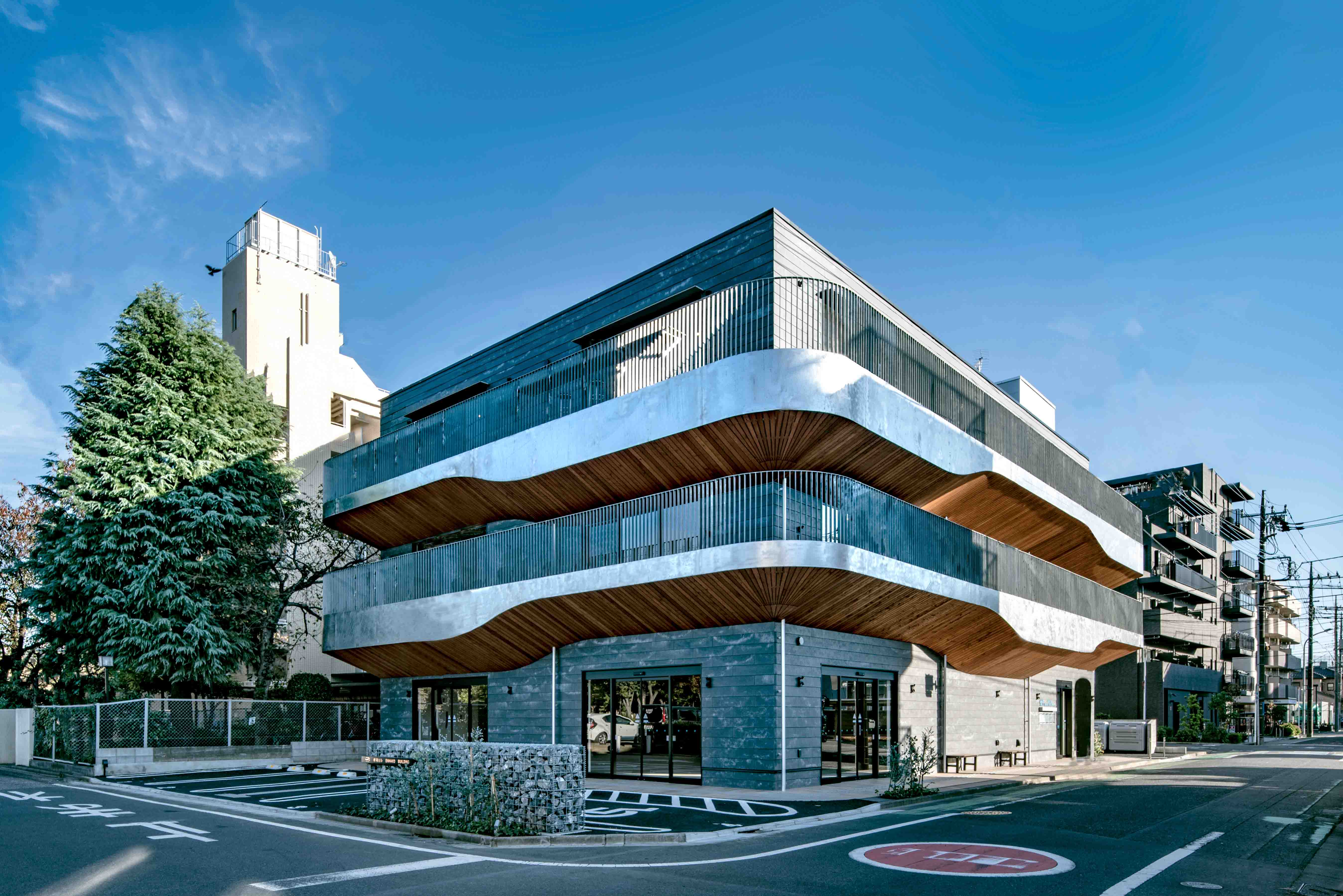 We envisioned the building as a familiar perch for people coming and going between the two areas, with verandas where they can stop and rest. People flow around the building on both weekends and weekdays. While the crowds are smaller than one would find closer to a station, there is reliable community foot traffic. Focusing on this, we created a veranda adjacent to the street and wrapped balconies around the second and third stories. The underside of the balconies form organically shaped, warm wooden eaves that draw people in and define the building’s design. The building faces north to take advantage of views across a tree-lined street to the park and city hall, and to invite in the sights and sounds of summer festivals and plant fairs nearby. The multi-use building contains shops and a clinic, and the veranda reaches invitingly into the street so that people of all ages can stop by on their outings around the neighborhood on both weekdays and weekends. Our goal was to design a commercial building that will be sustained in this way by members of the community. The interior can be rented as a whole, by the floor, or by unit depending on needs.