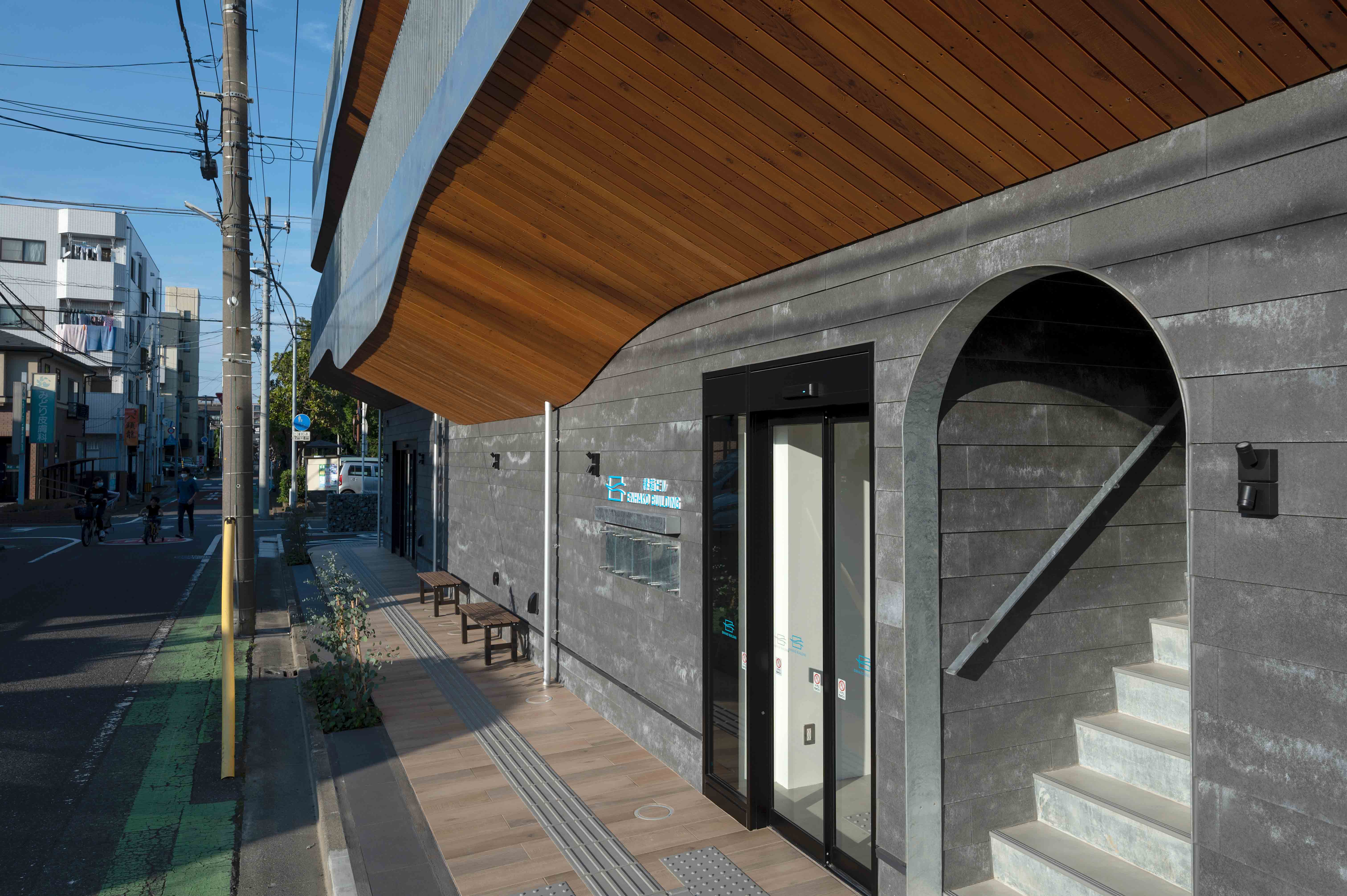 We envisioned the building as a familiar perch for people coming and going between the two areas, with verandas where they can stop and rest. People flow around the building on both weekends and weekdays. While the crowds are smaller than one would find closer to a station, there is reliable community foot traffic. Focusing on this, we created a veranda adjacent to the street and wrapped balconies around the second and third stories. The underside of the balconies form organically shaped, warm wooden eaves that draw people in and define the building’s design. The building faces north to take advantage of views across a tree-lined street to the park and city hall, and to invite in the sights and sounds of summer festivals and plant fairs nearby. The multi-use building contains shops and a clinic, and the veranda reaches invitingly into the street so that people of all ages can stop by on their outings around the neighborhood on both weekdays and weekends. Our goal was to design a commercial building that will be sustained in this way by members of the community. The interior can be rented as a whole, by the floor, or by unit depending on needs.