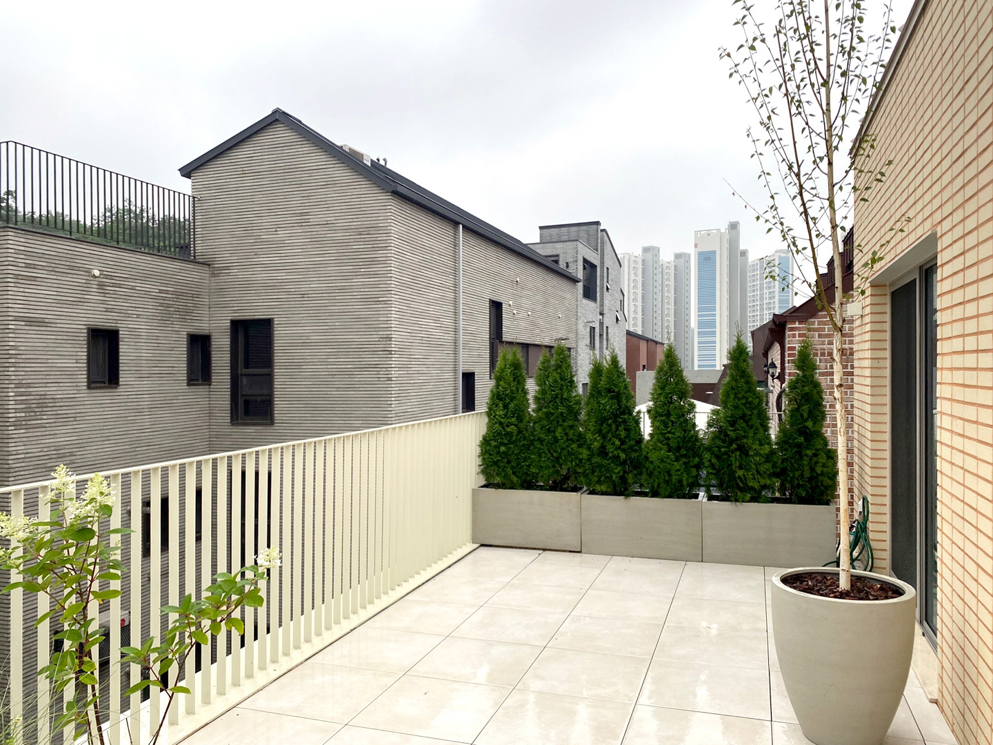 The H Building is a project design for a multi-family home within the development zone of Goyang City. The client intended to use this multi-family home as a second residence and office space, with most of the space dedicated to their private use. This intention was reflected throughout the entire project, from interior design to furniture coordination. Because of the nature of the development zone, the design incorporated restrictions related to south-facing sun exposure, and the exterior was constructed with ivory bricks to meet the client's firm requirements. To achieve a staggered masonry structure rather than employing conventional masonry, the entire module was adjusted. Bricks were cut to create curved surfaces on the building's corner sections, reflecting the intention to create a softer and milder appearance for the ivory masonry building. Curved treatments were also used for the main entrance columns on the first floor and the main mass on the facade to enhance the entry. Balconies and terraces throughout the building's external areas were designed with planter-like landscaping to allow residents to enjoy greenery both inside and outside the building. Through the harmonious integration of the H Building with other structures in the neighborhood, it is hoped that not only the client but also all neighboring residents can lead a peaceful life in the gentle atmosphere of the village.