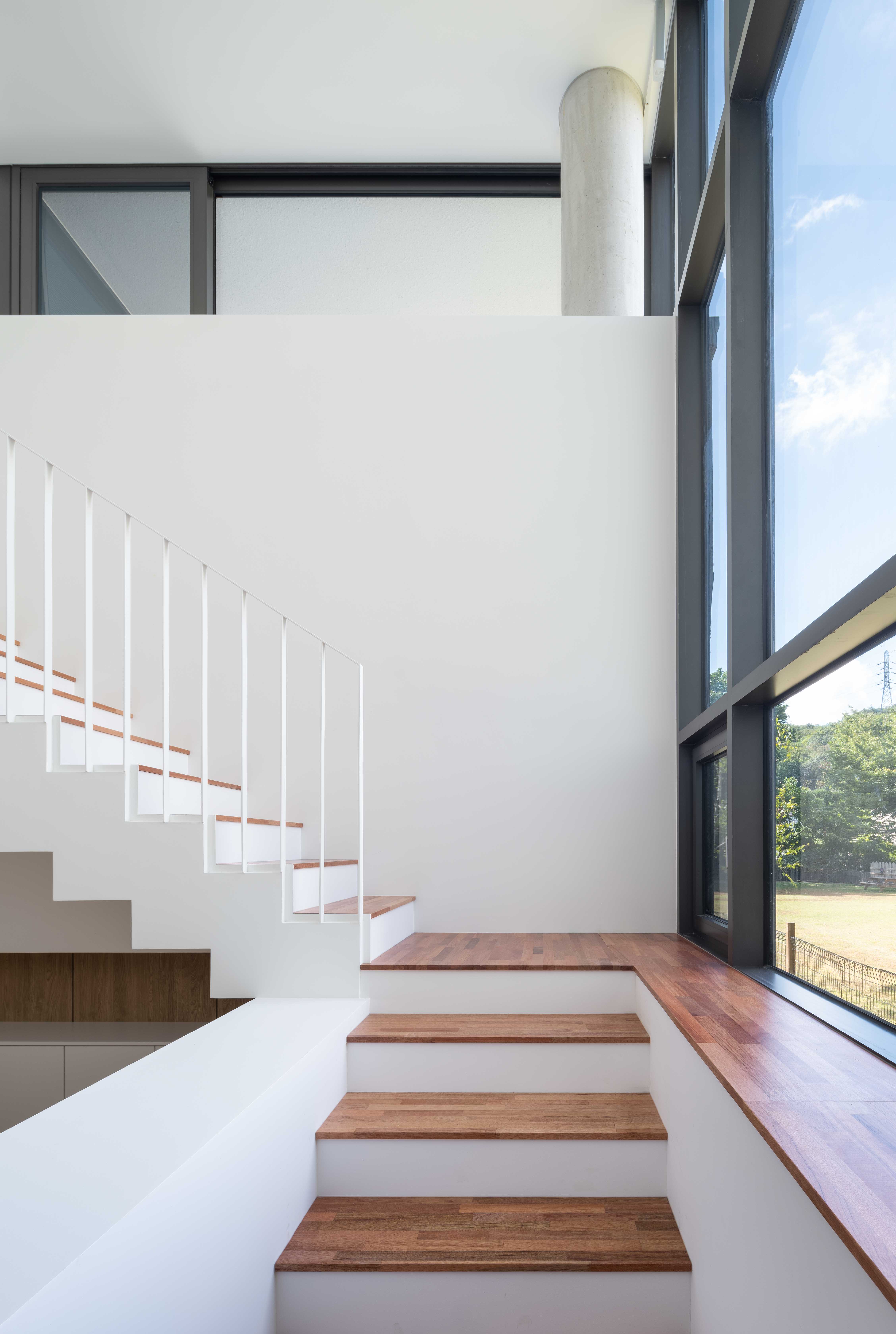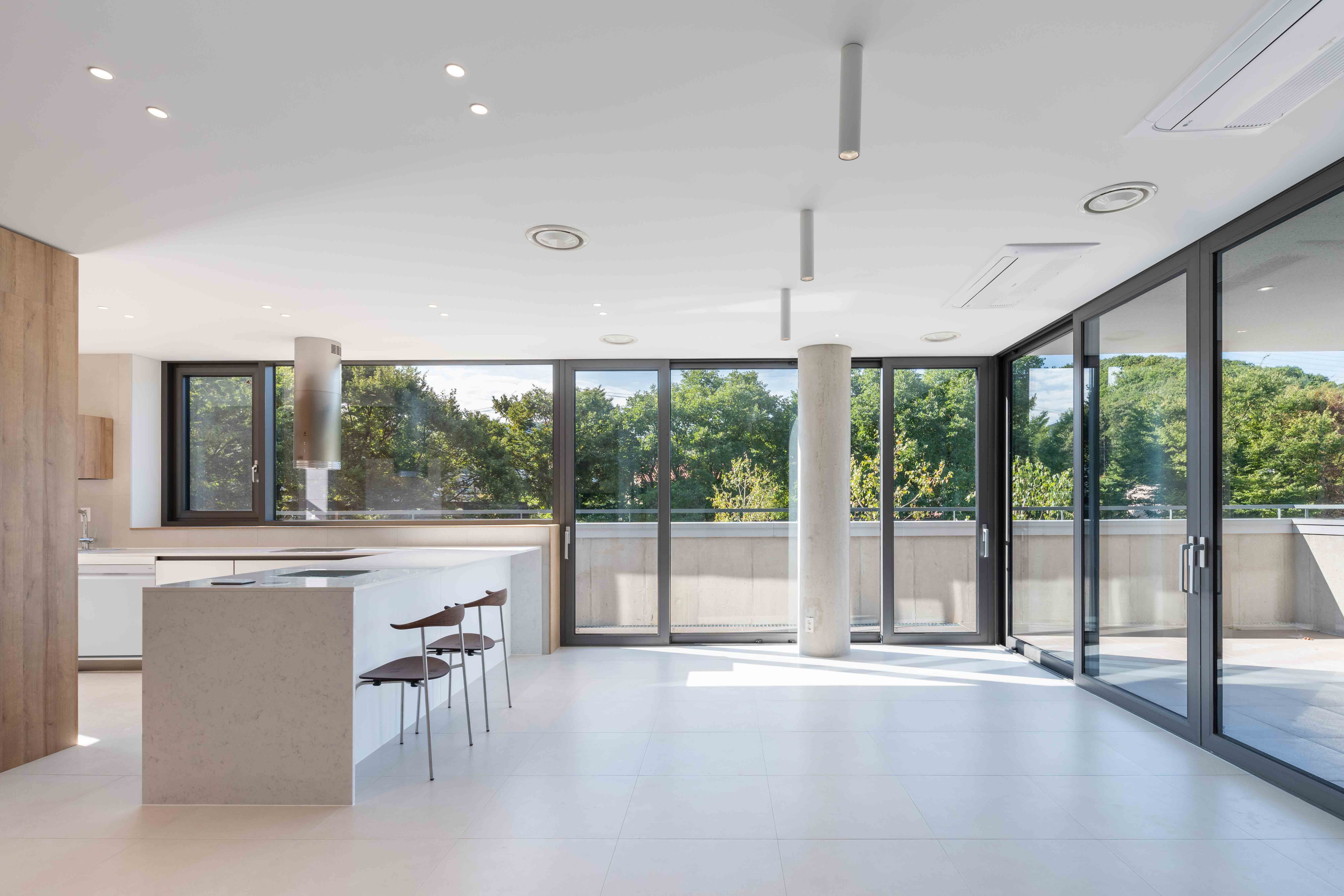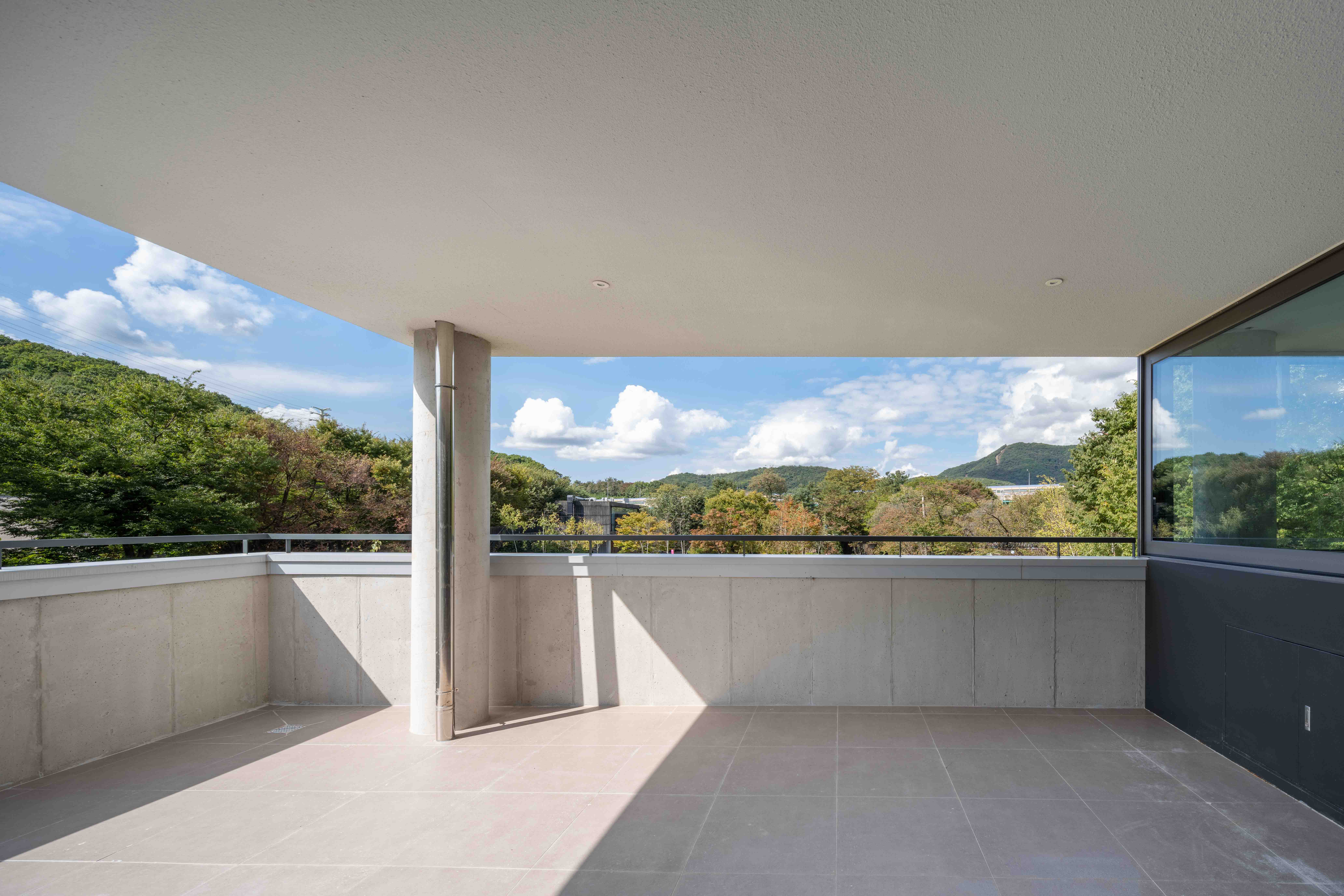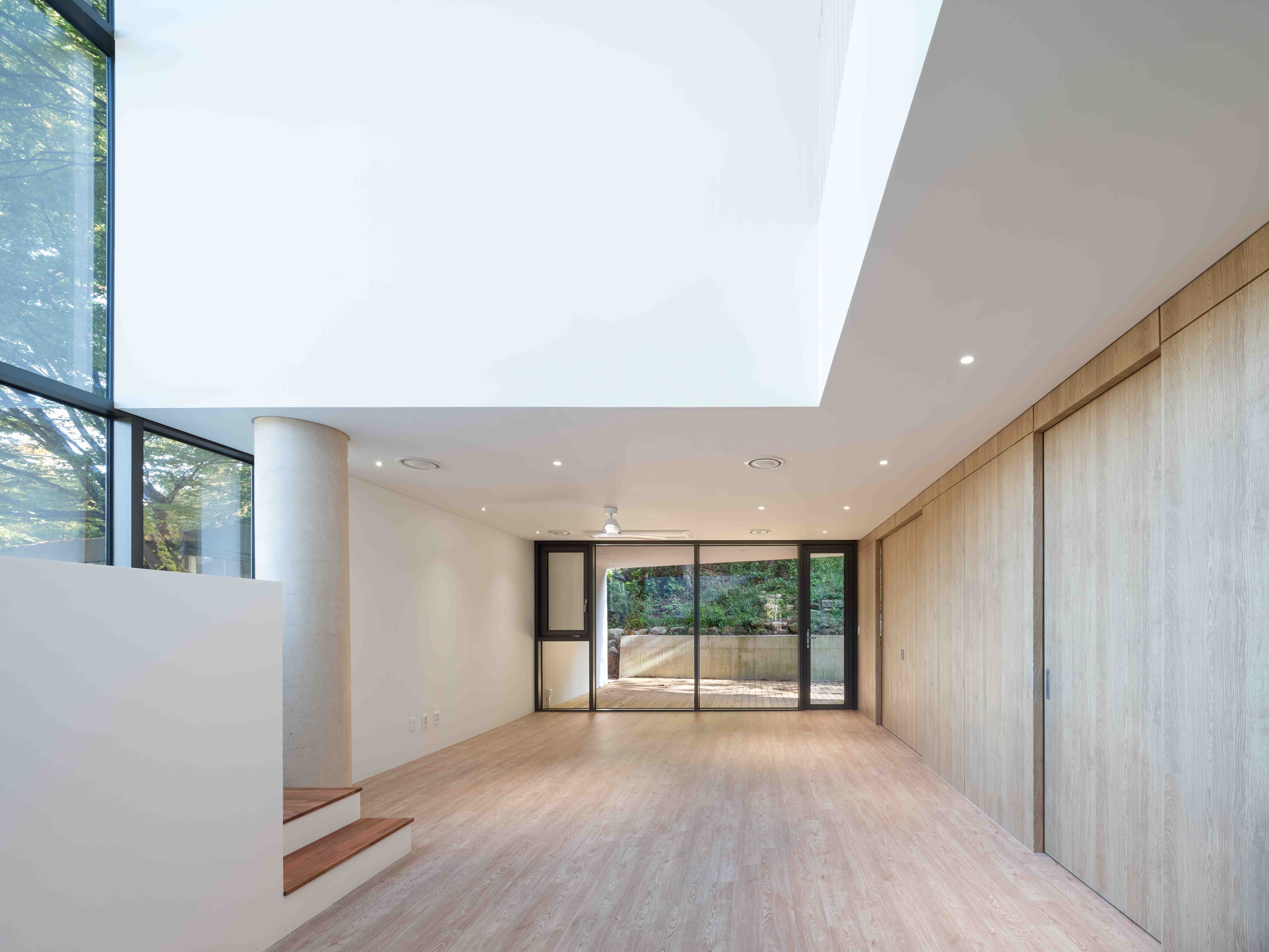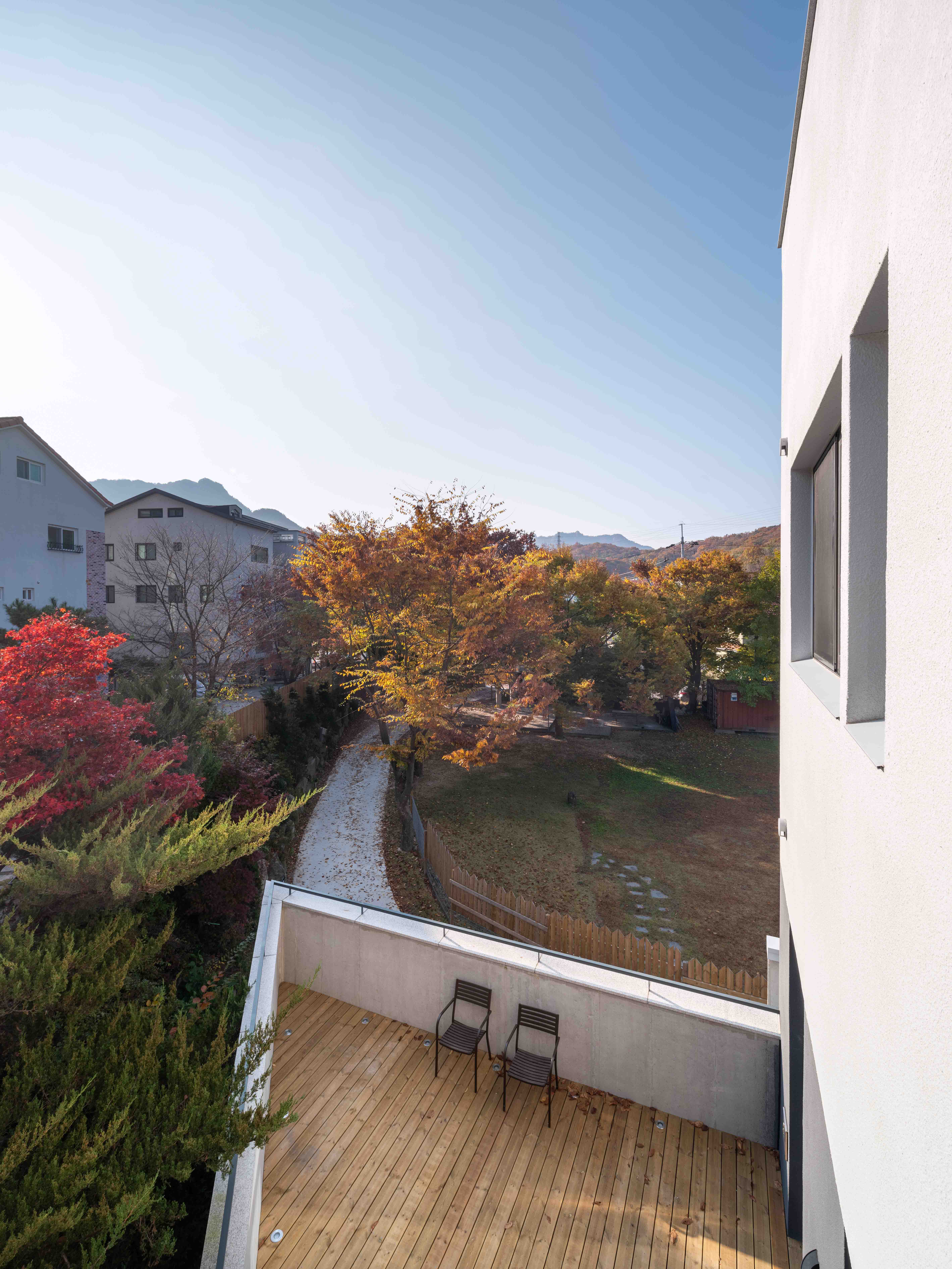 Casa Rosa is a house that offers panoramic views of the grand ridge of Bukhansan Mountain, with open vistas to the east, west, and south. To make the most of the changes in lighting from sunrise to sunset, the design incorporates various terraces on different floors. Given these terrace features, addressing privacy is essential. The terrace on the first floor, where morning sunlight pours in from the east, ensures complete privacy by using the building's structural wall on one side to block the view. The terrace on the east side of the second floor establishes a suitable boundary with the neighboring house, providing a space for small family gatherings as well as supporting kitchen functions. The west-facing terrace captures the expansive Bukhansan Mountain landscape while effectively blocking views from the outside. The terrace on the third floor features a tall outer wall to both shield external views and capture abundant southern sunlight by forming a void in the building. While the building's floor plan may appear similar between the second and third floors, the distinctively designed terraces create differences in both the interior and exterior appearances. The interior of the house has been designed with white walls and minimal wood elements, considering the introduction of various furniture and household appliances. For the exterior, white stucco serves as the primary finish material, emphasizing the building's form and dimensionality. The walls of the parking area are left in rough concrete to ensure that the white building blends with its natural surroundings as a harmonious backdrop.